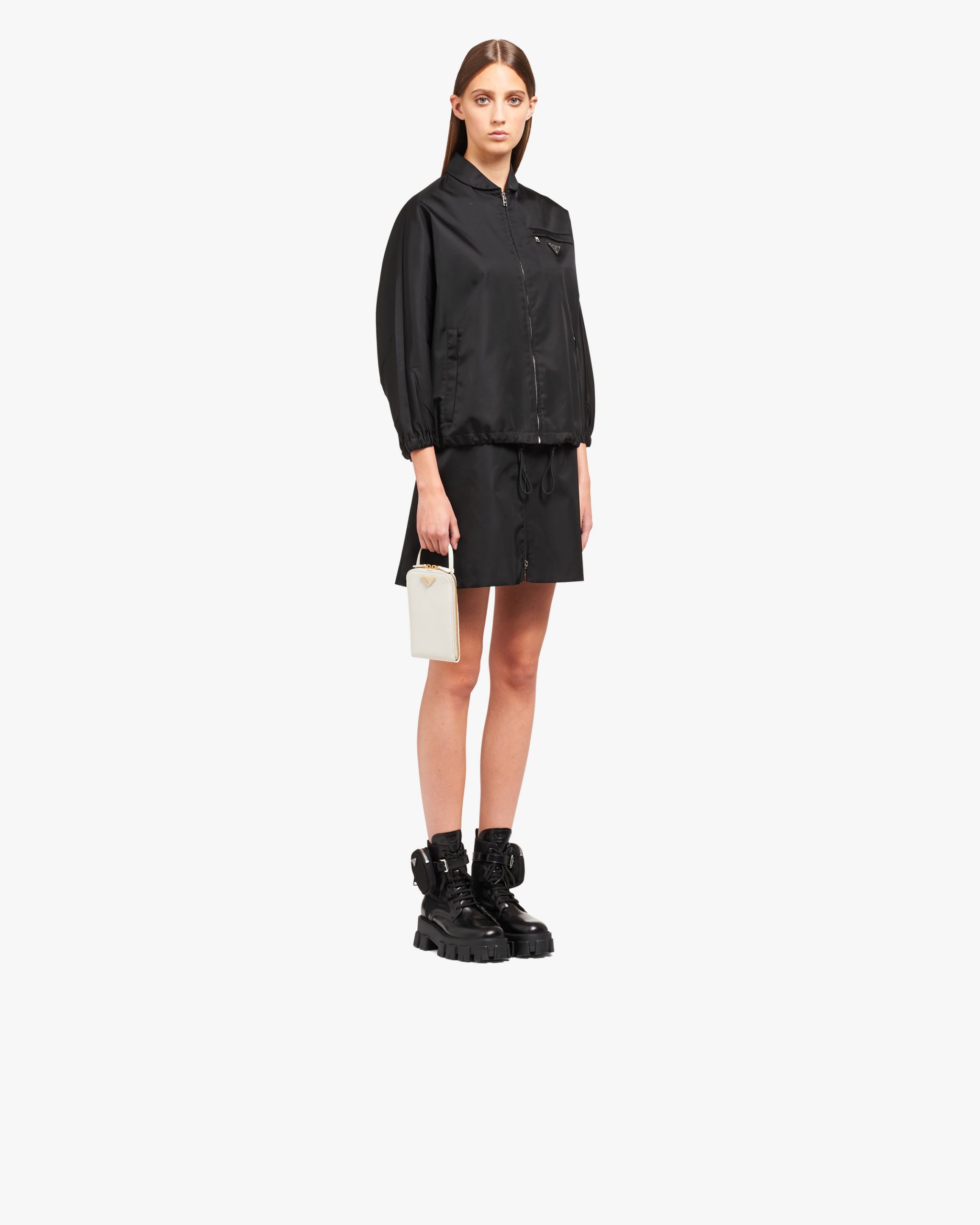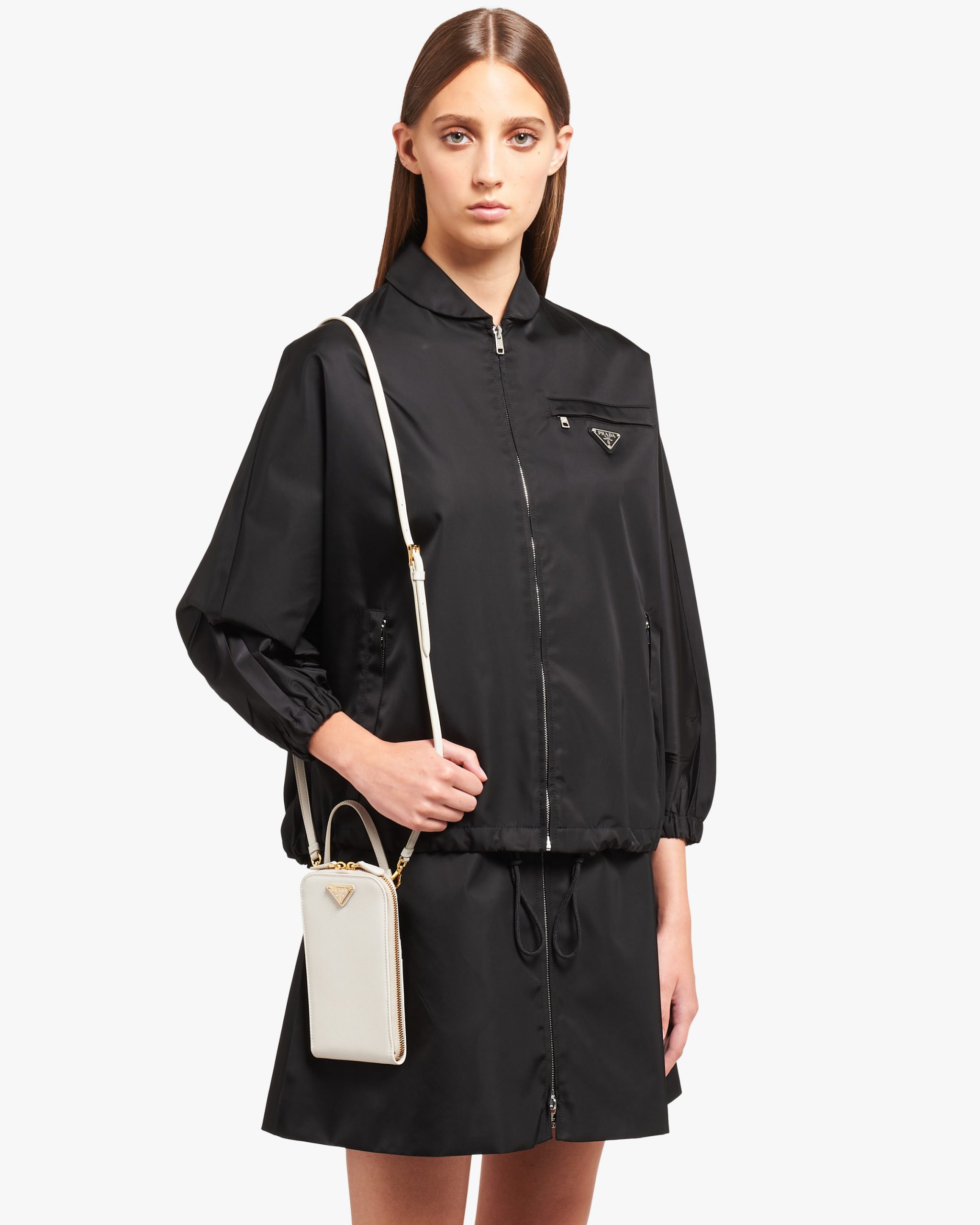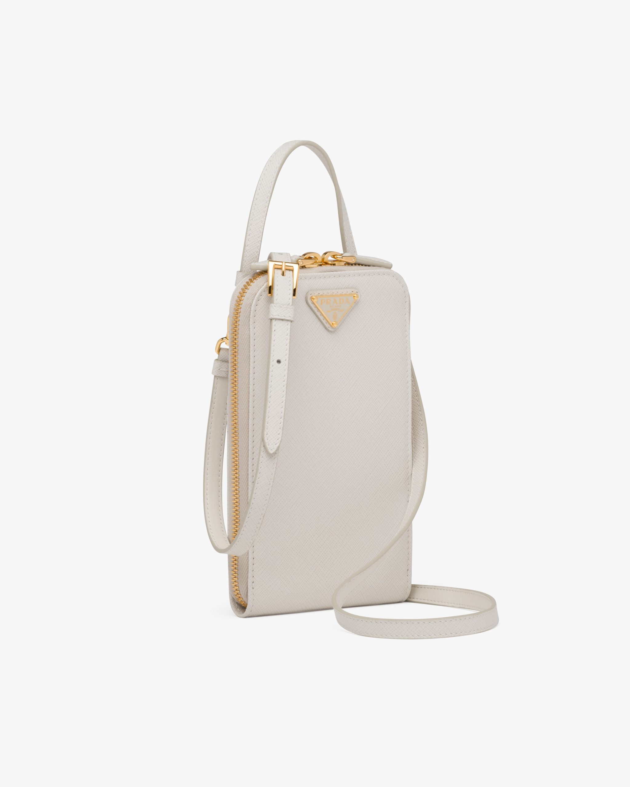 The triangle logo2, which first appeared in the history of the brand on trunks designed by Mario Prada, enhances this contemporary accessory: the mini bag with leather handle and metal hardware, completed by an adjustable leather shoulder strap so it can be worn as a cross-body or shoulder bag.