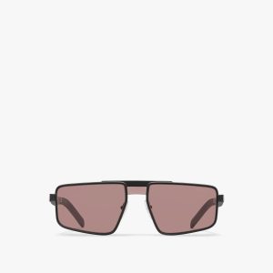 Rectangular acetate sunglasses with a contemporary, slightly curved frame front combined with wide temples that reveal the metal details in these exclusive frames presented in transparent colors. The bridge area is decorated with the Prada lettering logo2 and redesigned to iconographically reinterpret the historic triangle logo2 of the maison.