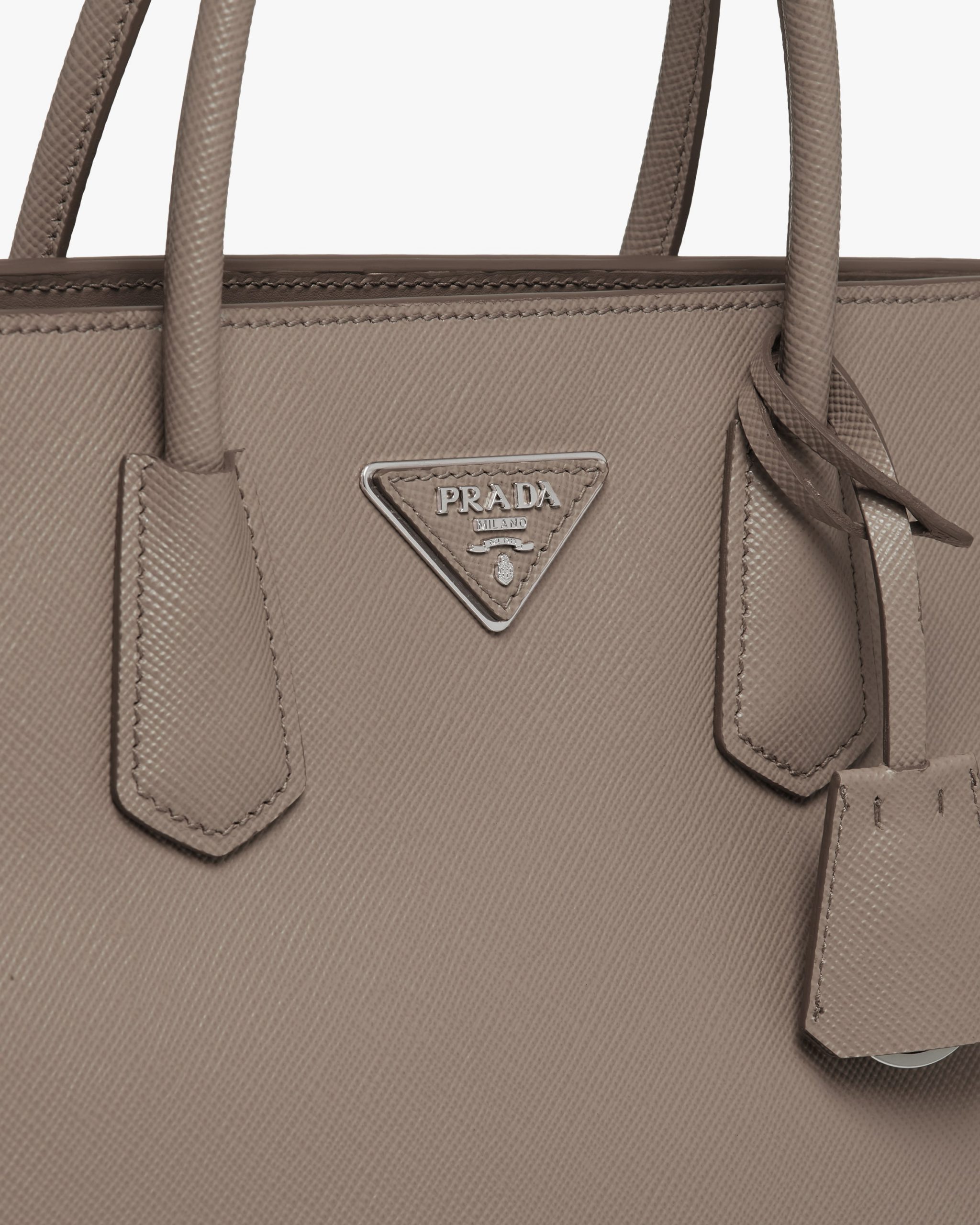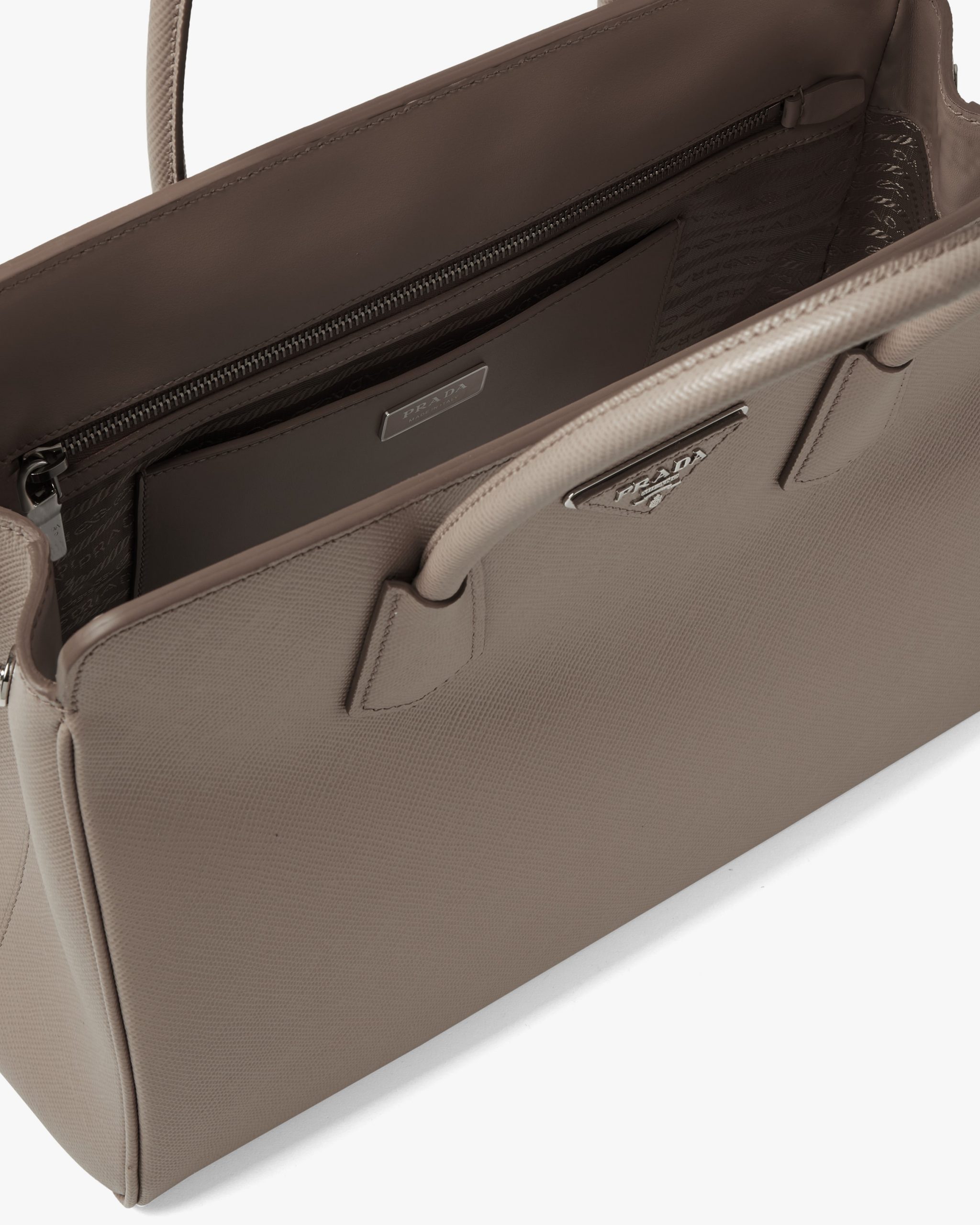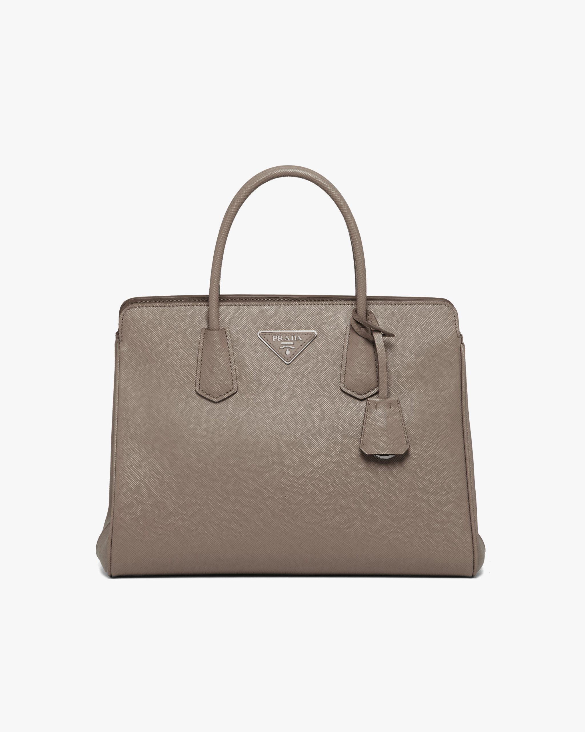 This handbag with a classic, structured design is made of Saffiano leather, an iconic material of the brand characterized by the crosshatch motif and waxed finish. The triangle logo2, first introduced on the trunks designed by Mario Prada, decorates the front. The accessory equipped with a double handle and detachable leather shoulder strap can be worn in several ways.