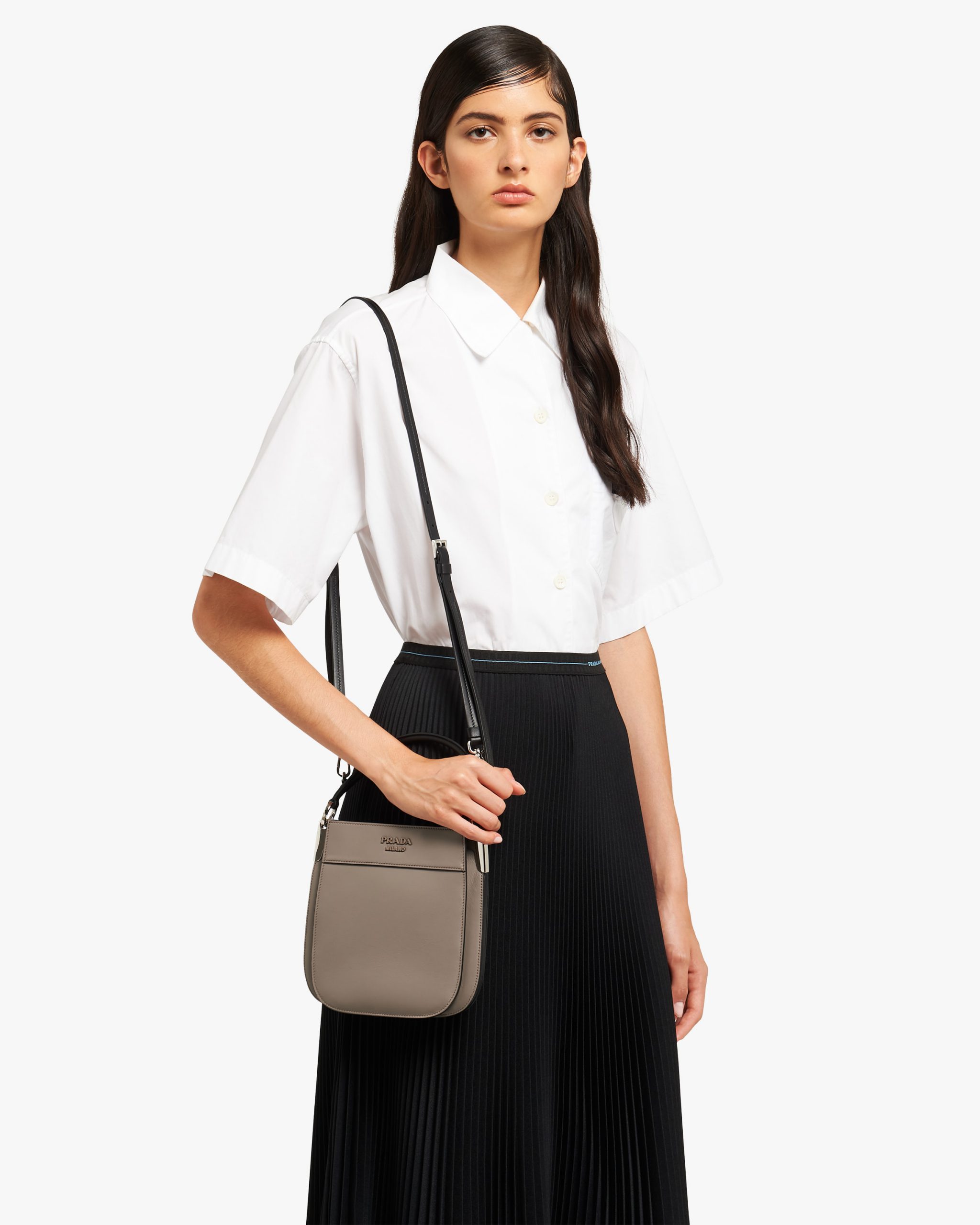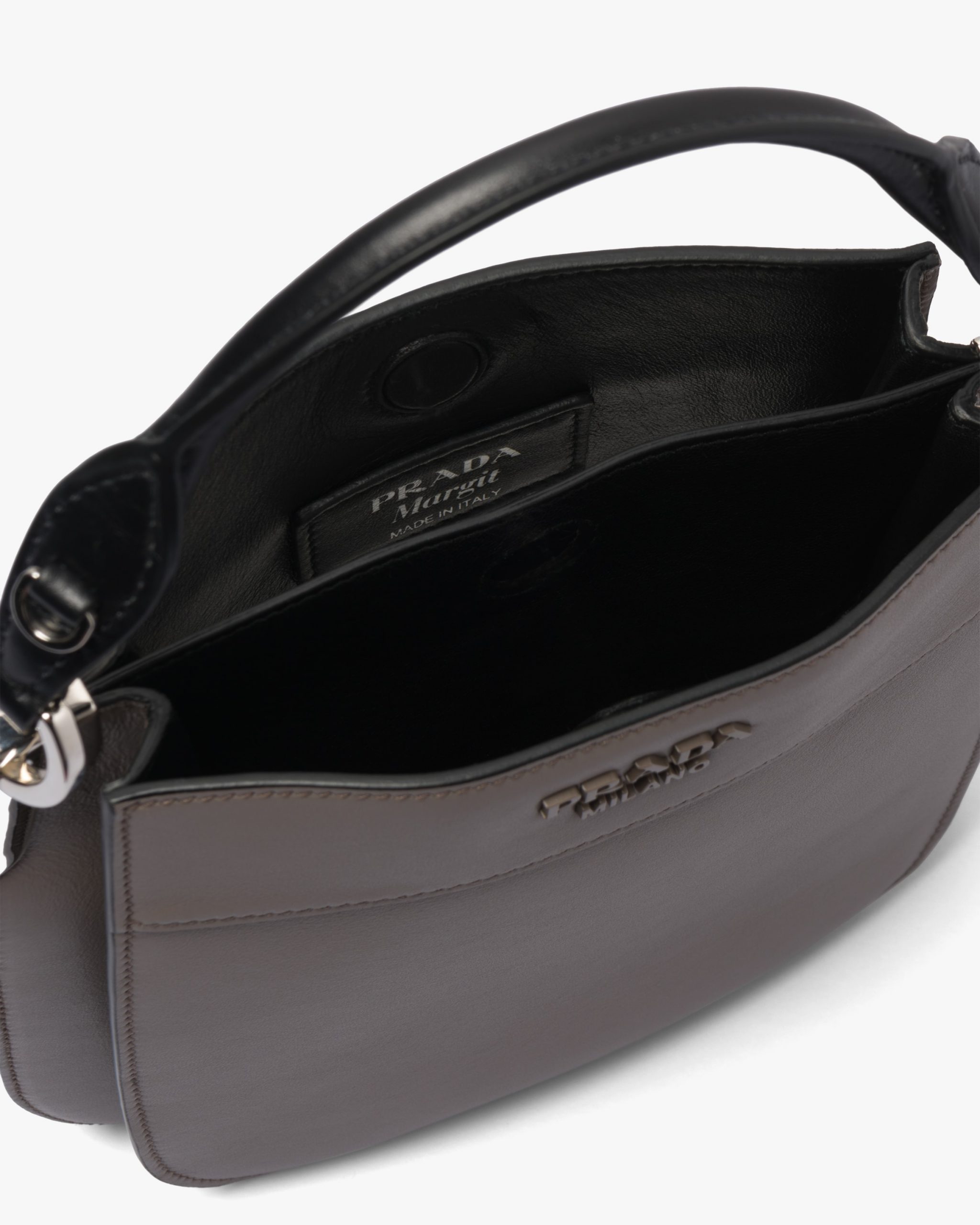 The curvy line of its silhouette distinguishes the Prada Margit handbag. The leather bag has two internal compartments and the metal lettering logo2.