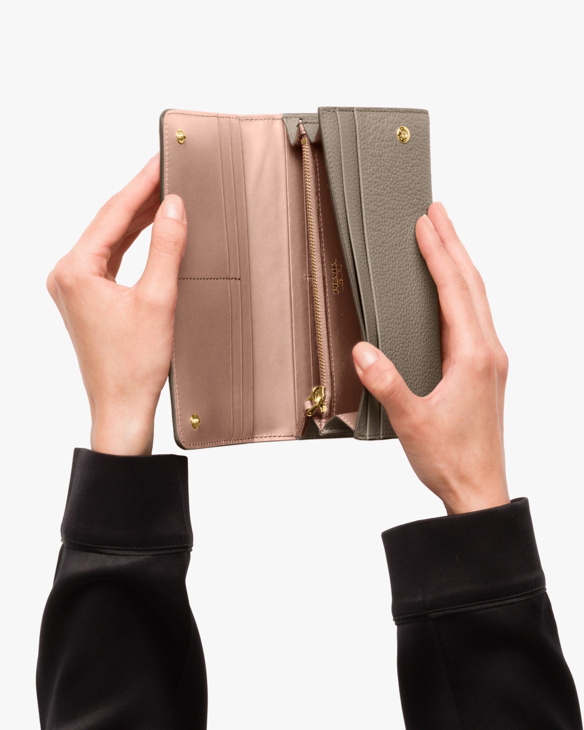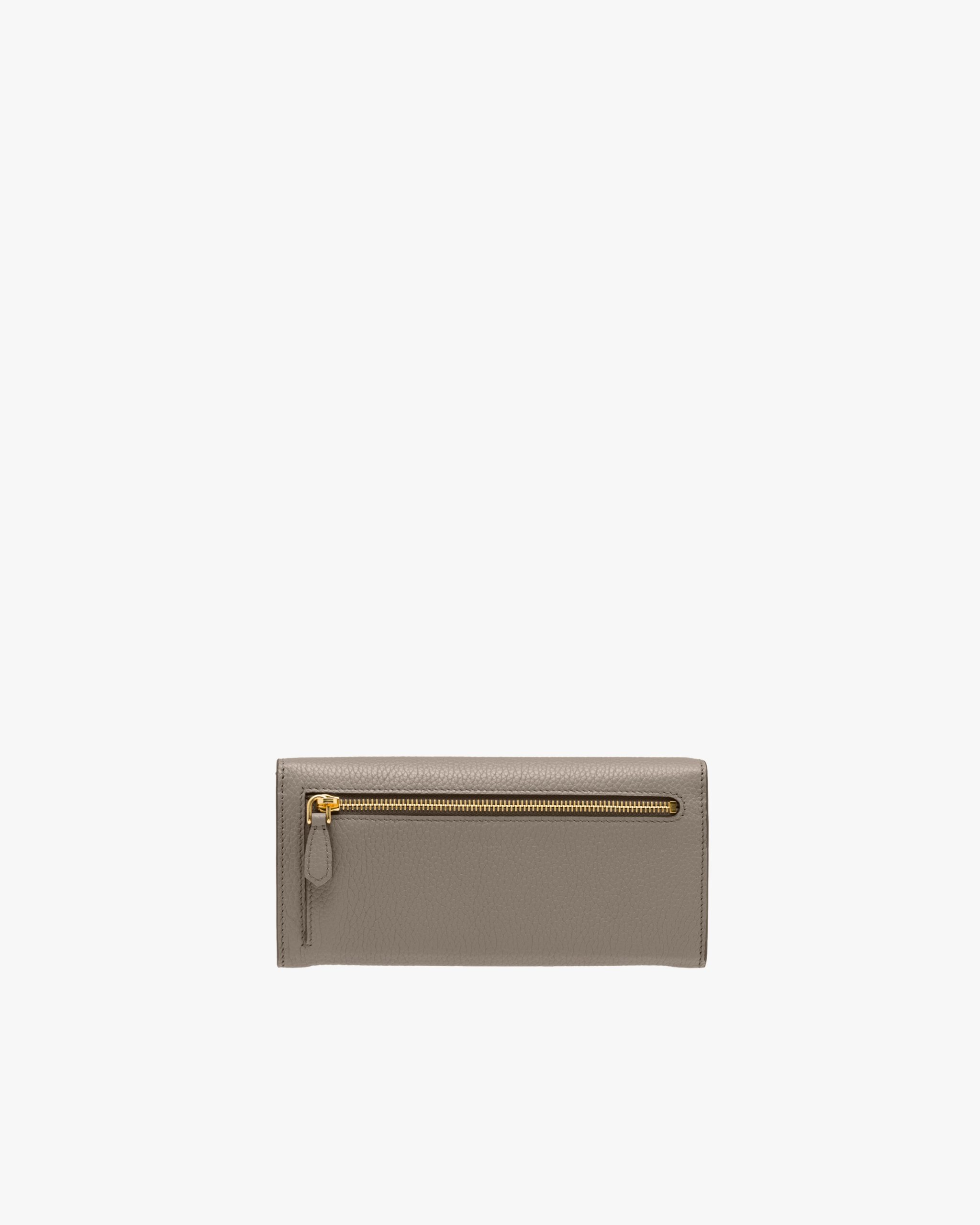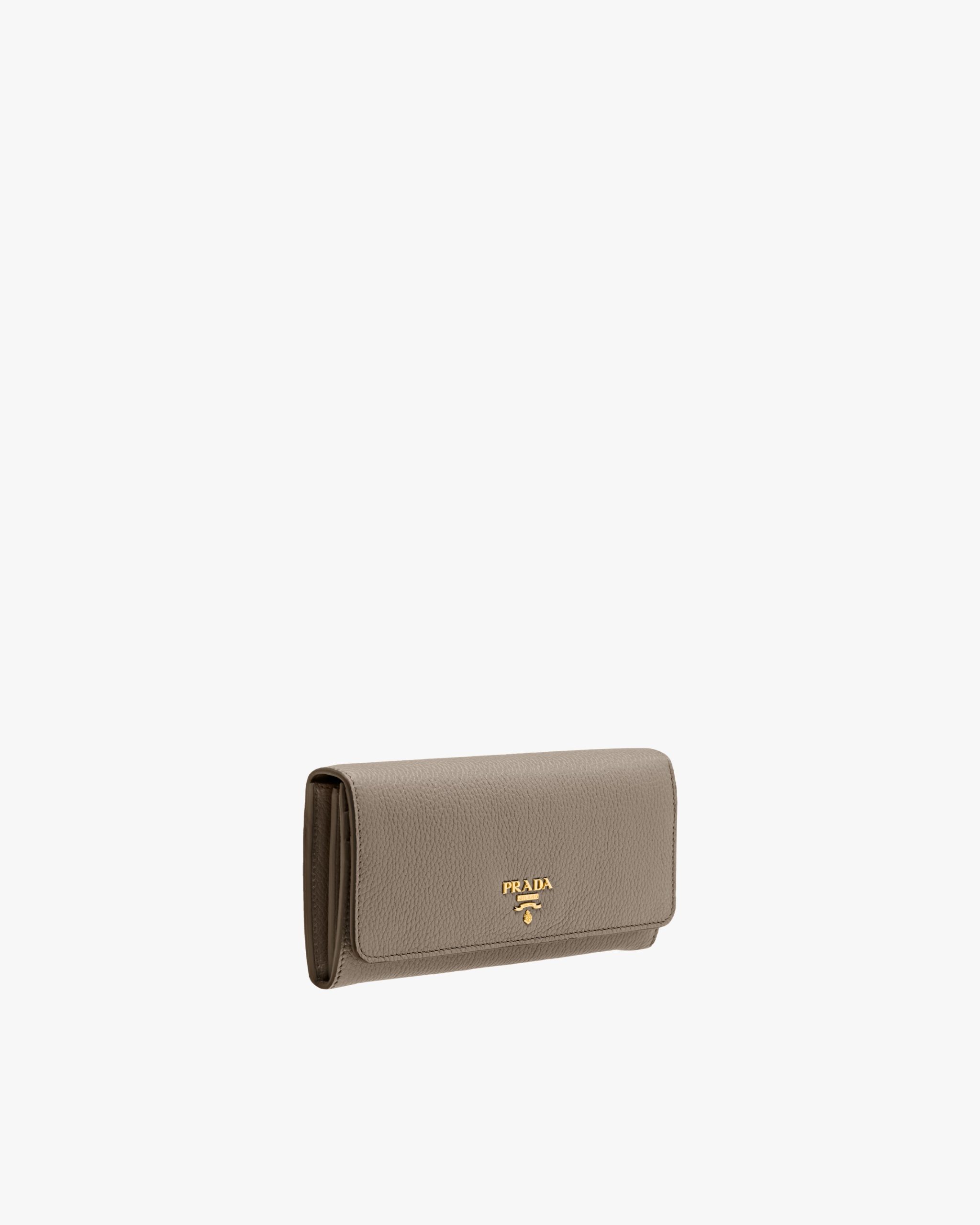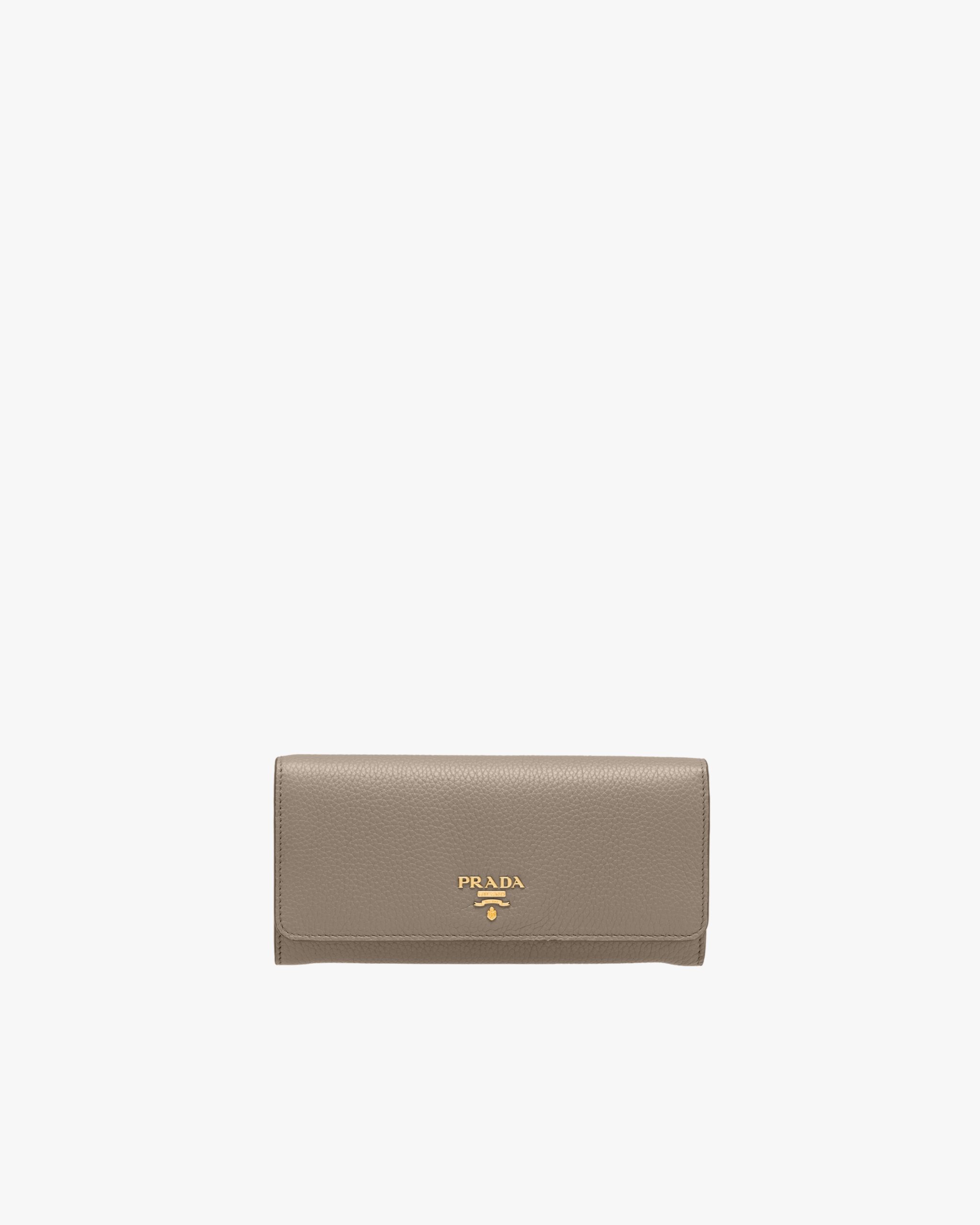 This flap wallet features lining in a contrasting color. The inside contains pockets, compartments and slots, as well as an extractable badge holder, while the outside is embellished with gold-toned Prada lettering.