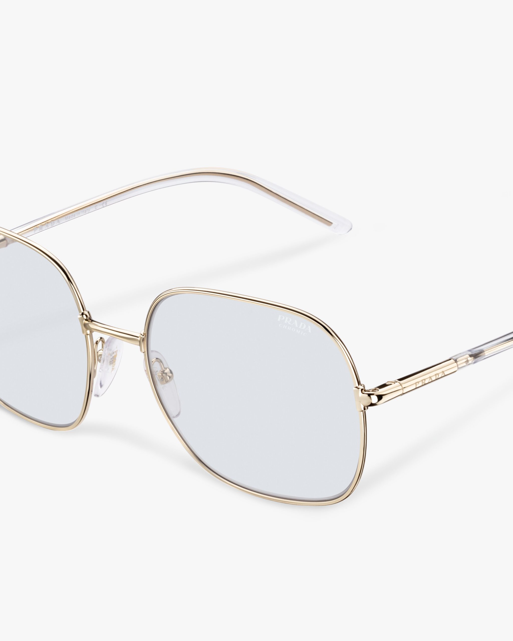 Sunglasses with contemporary, feminine allure characterized by the square design with refined lines. The exclusive Prada Chromic photochromic lenses add a modern touch and adapt to any change in sunlight, darkening in a few seconds. Prada lettering logo2.