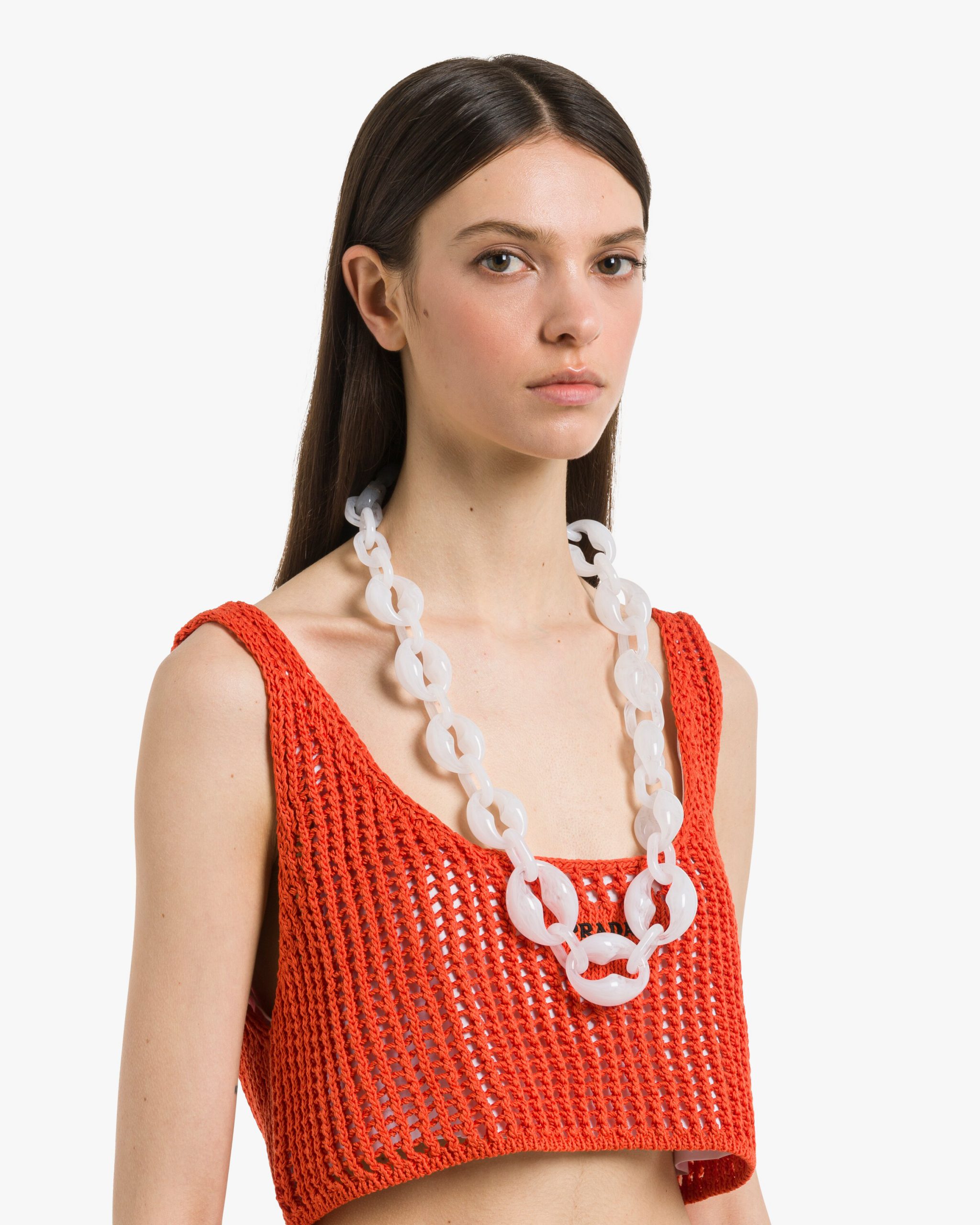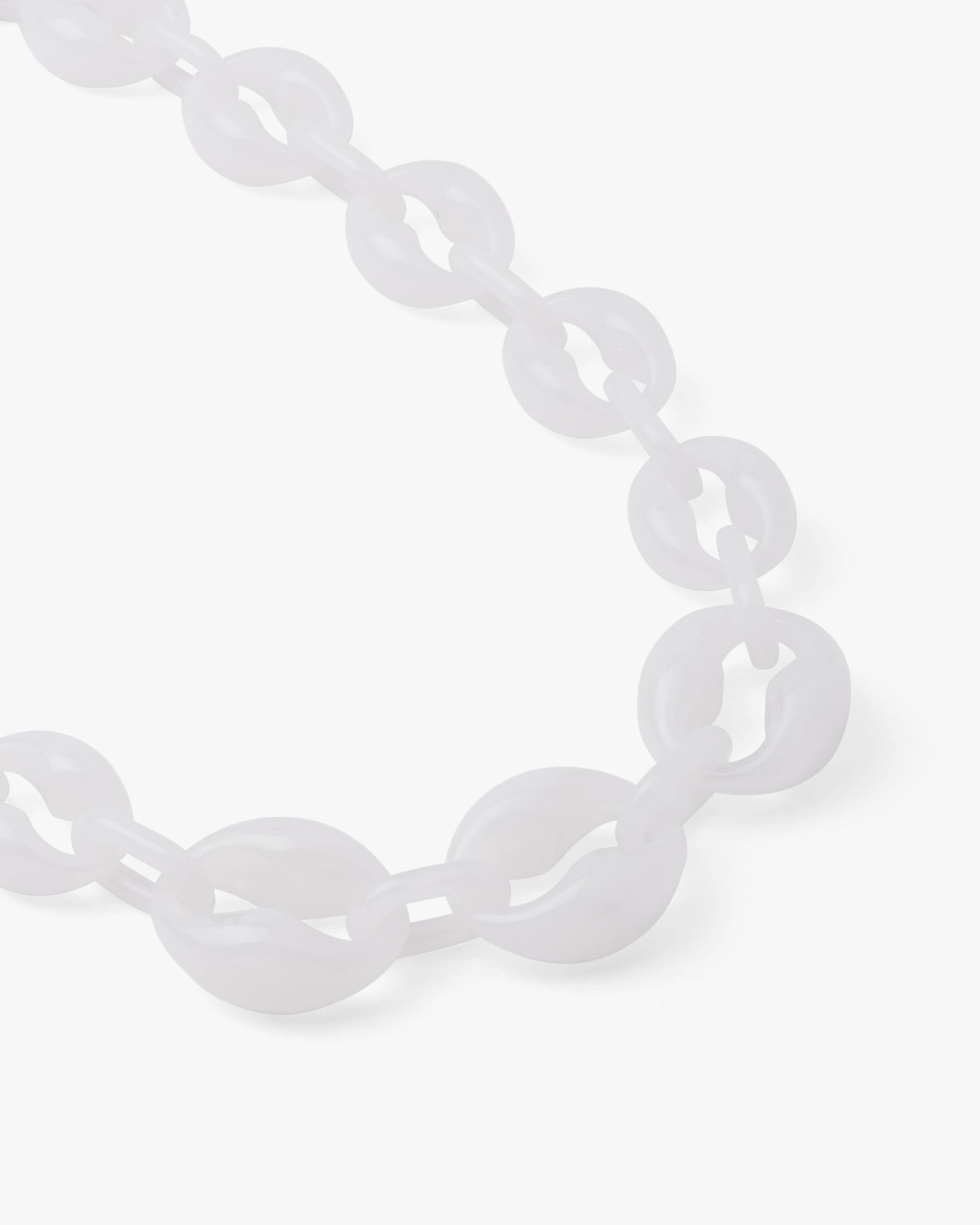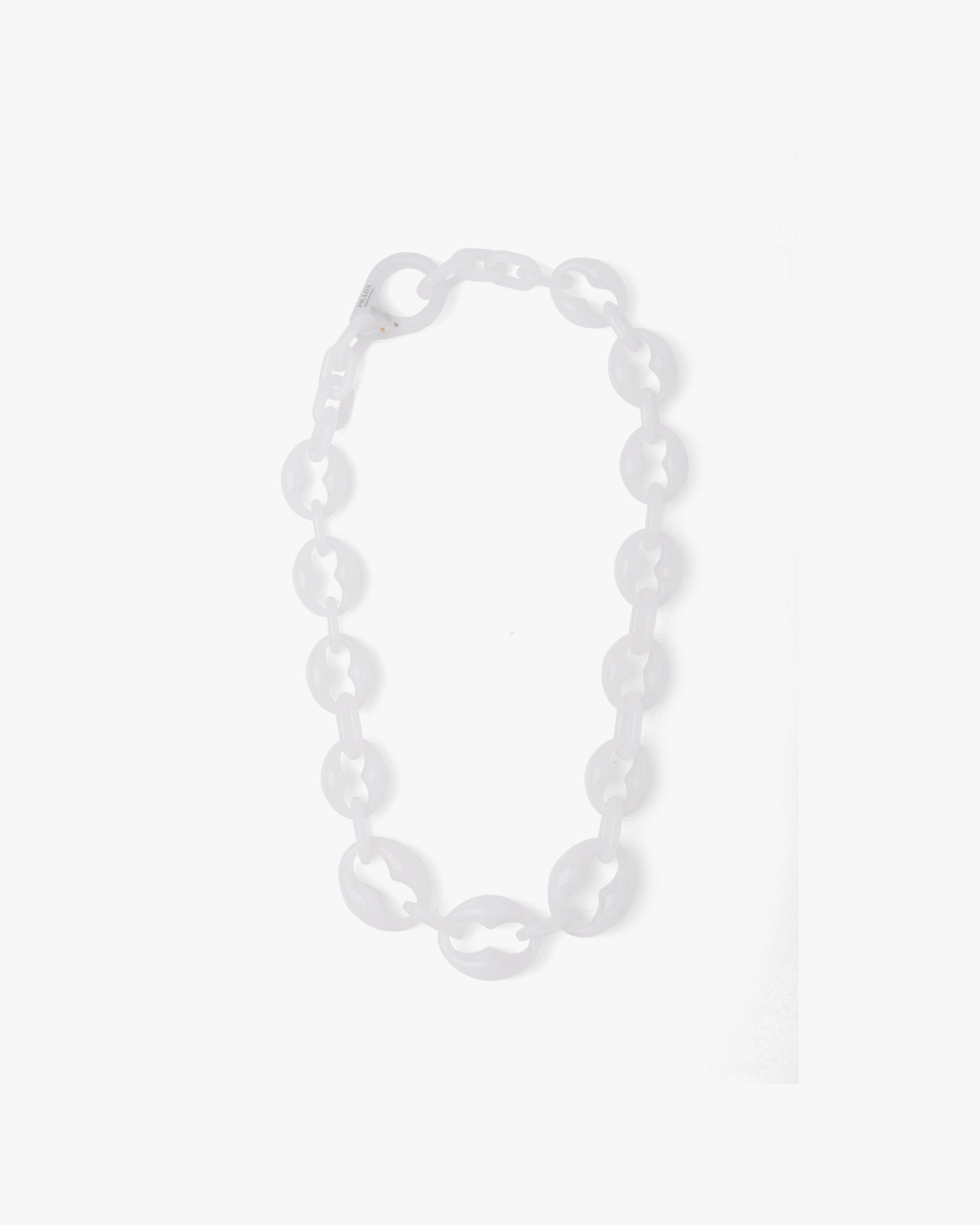This elegant Plexiglas chain necklace with oversized rings has retro charm.