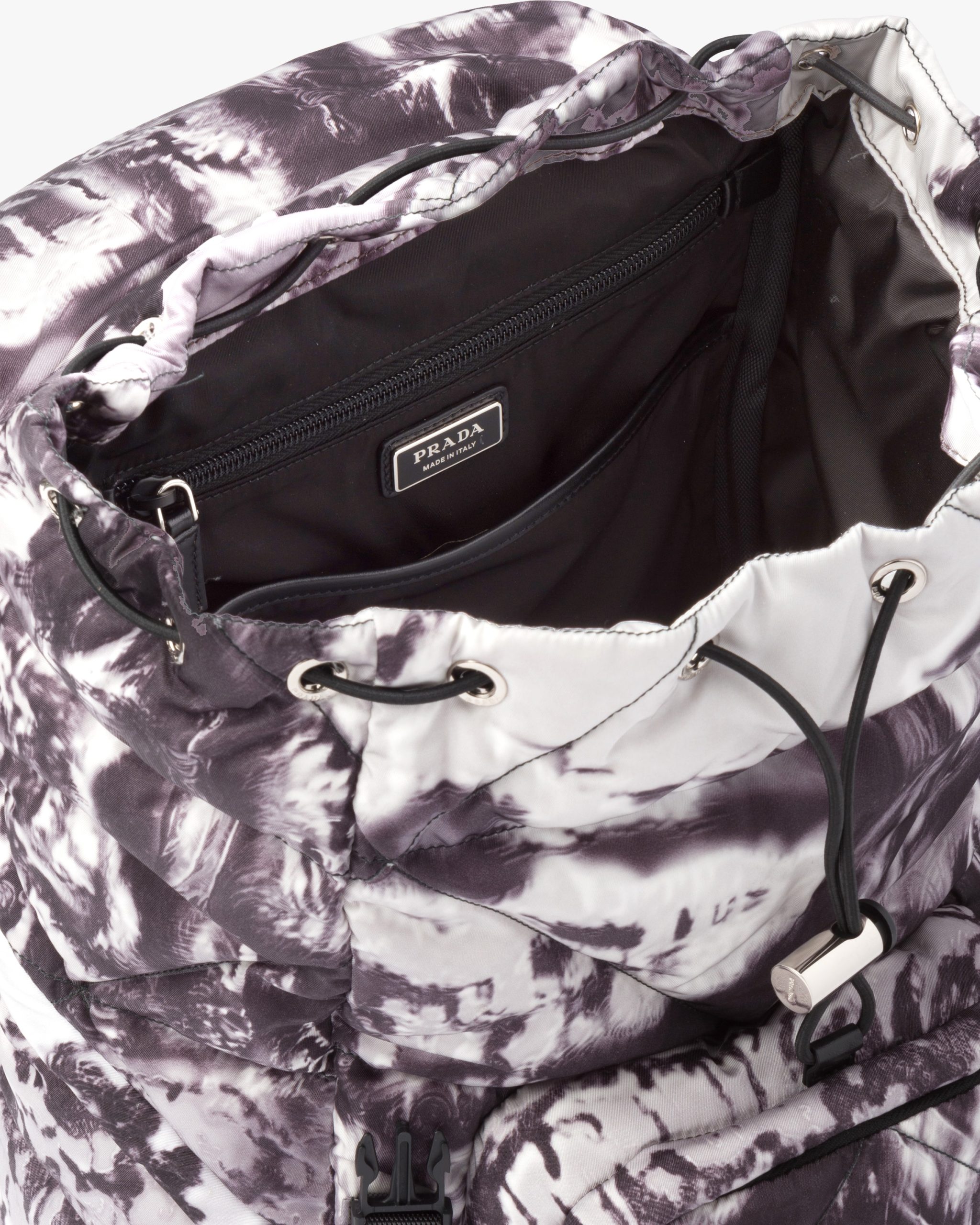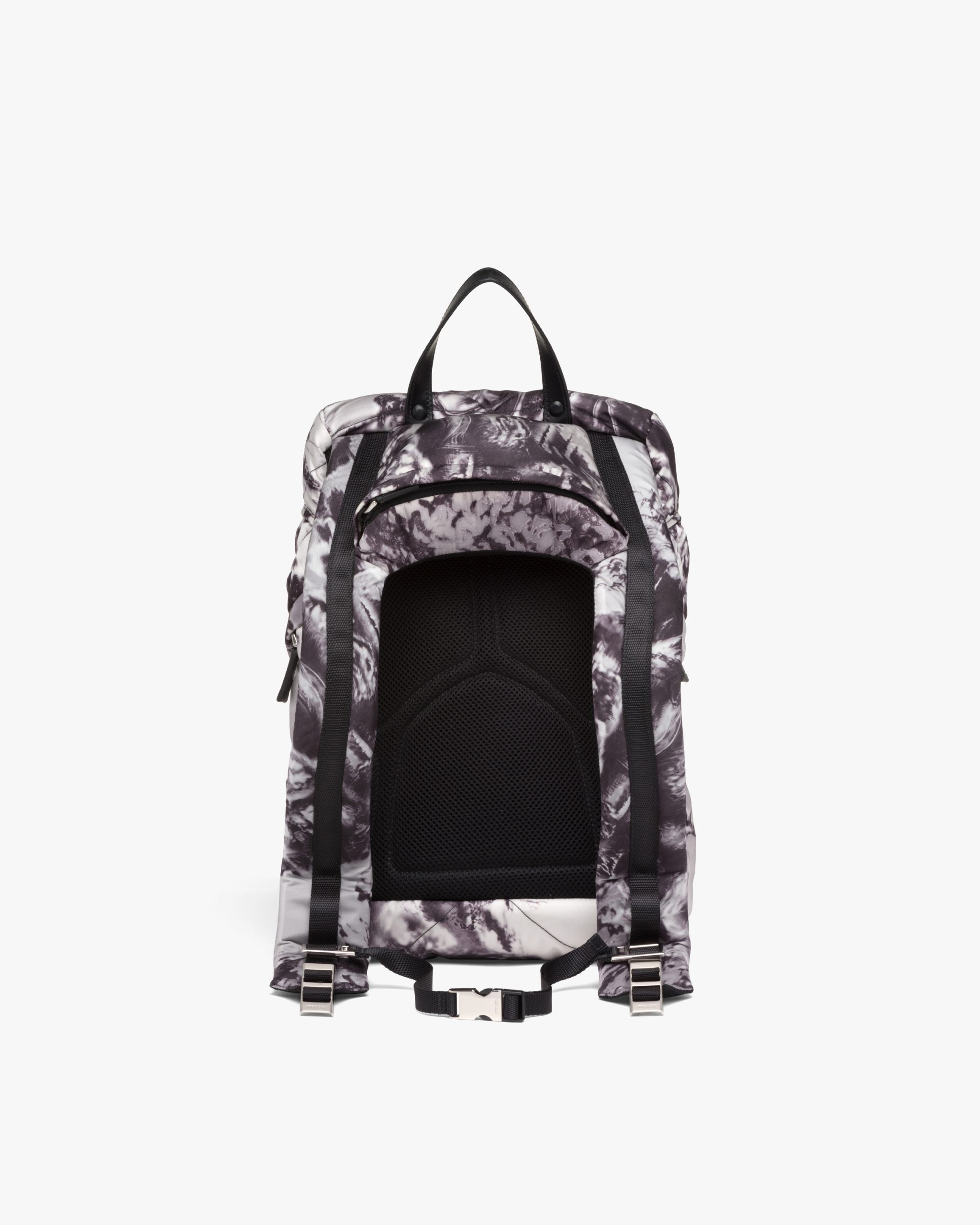 The ?Temples? print, one of the brand’s archive patterns, decorates this backpack made of Re-Nylon, an innovative regenerated material enhanced by the quilted motif inspired by the iconic triangle logo2. Part of Prada’s genetic code, recognizable and timeless prints have identified the collectsions of the brand since the ’90s, creating bold combinations or emphasizing designs with traditional allure.
