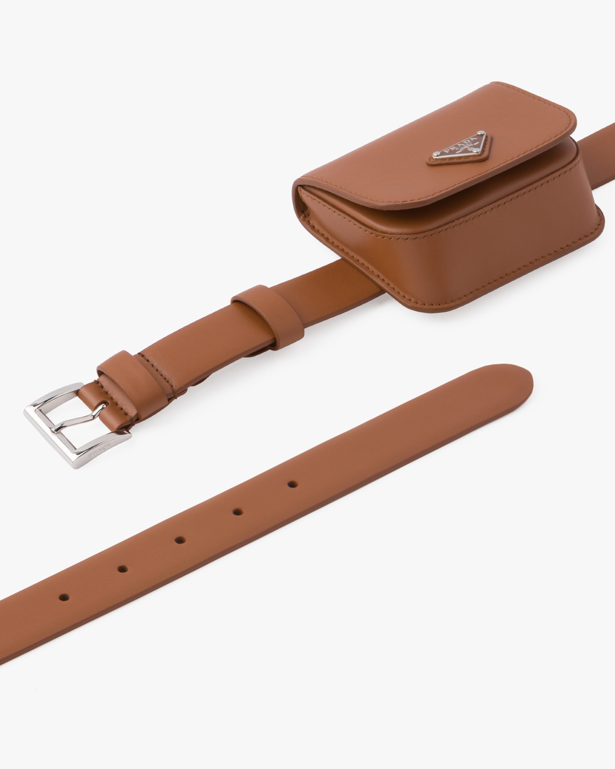 With a hybrid, multifunctional design, this multi-accessorized leather belt is enhanced by a leather pouch. The enameled metal triangle, the brand?? iconic logo2 created in 1913, adorns this accessory.