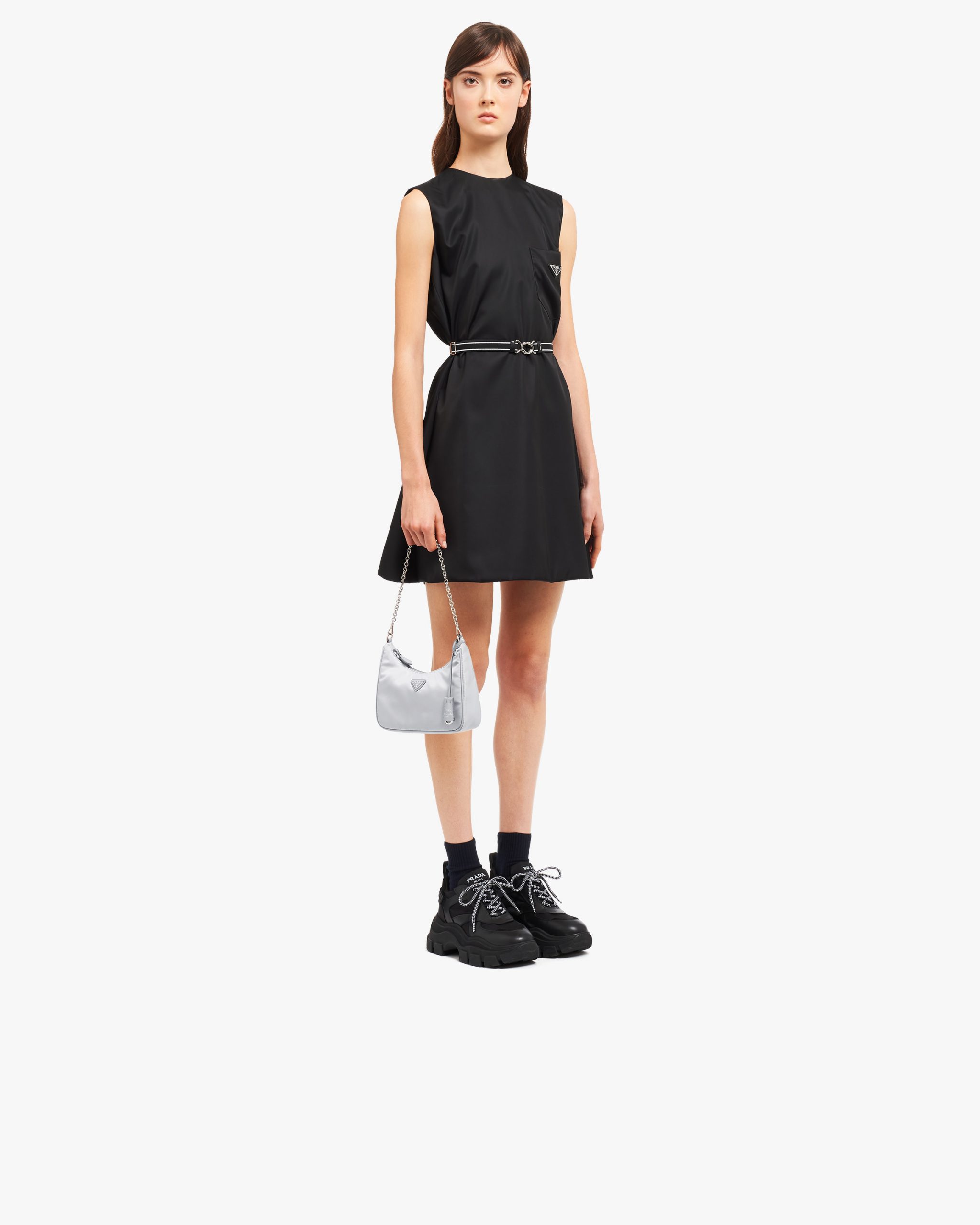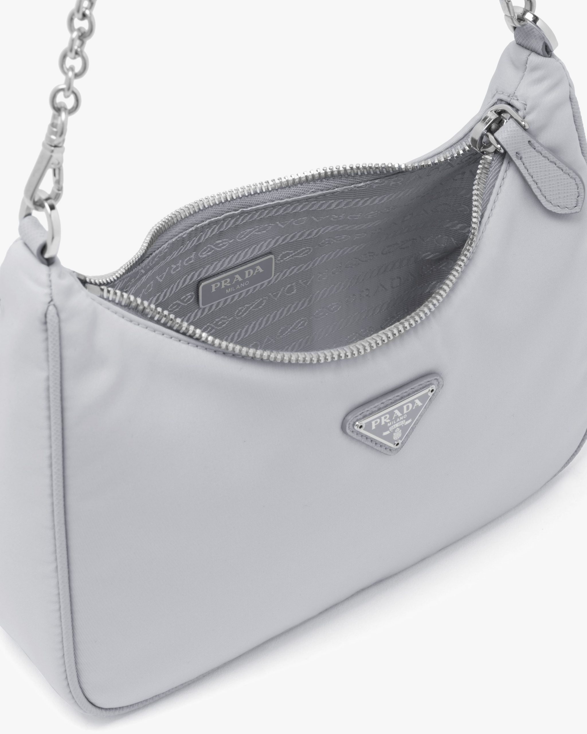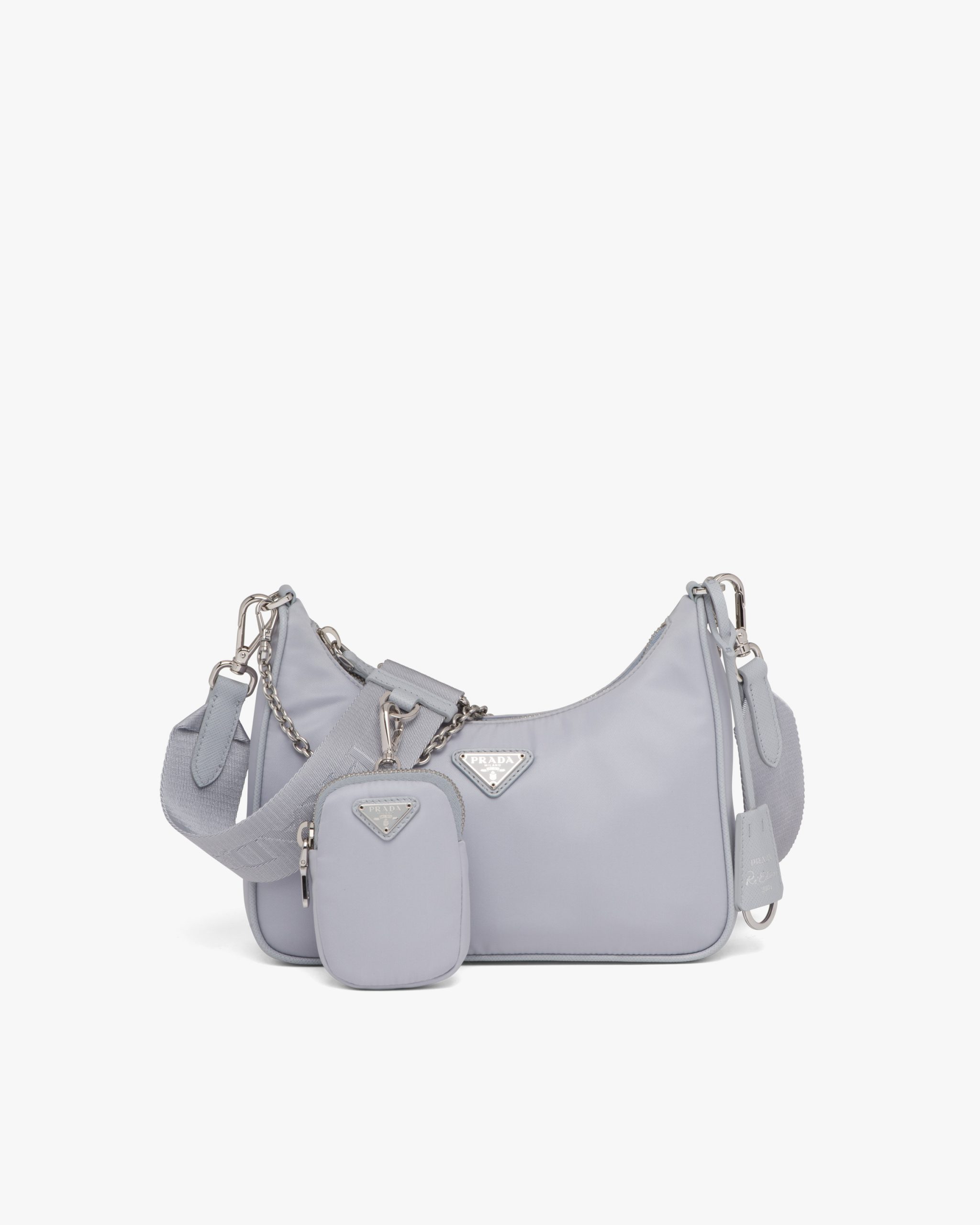 Inspired by the iconic mini hobo bag, the Prada Re-Edition 2005 shoulder bag is made of Re-Nylon: a regenerated nylon yarn (ECONYL?)produced from recycled, purified plastic trash collectsed in the ocean, fishing nets and textile waste fibers. This versatile bag with Saffiano leather trim comes with a detachable pouch attached to the shoulder strap.