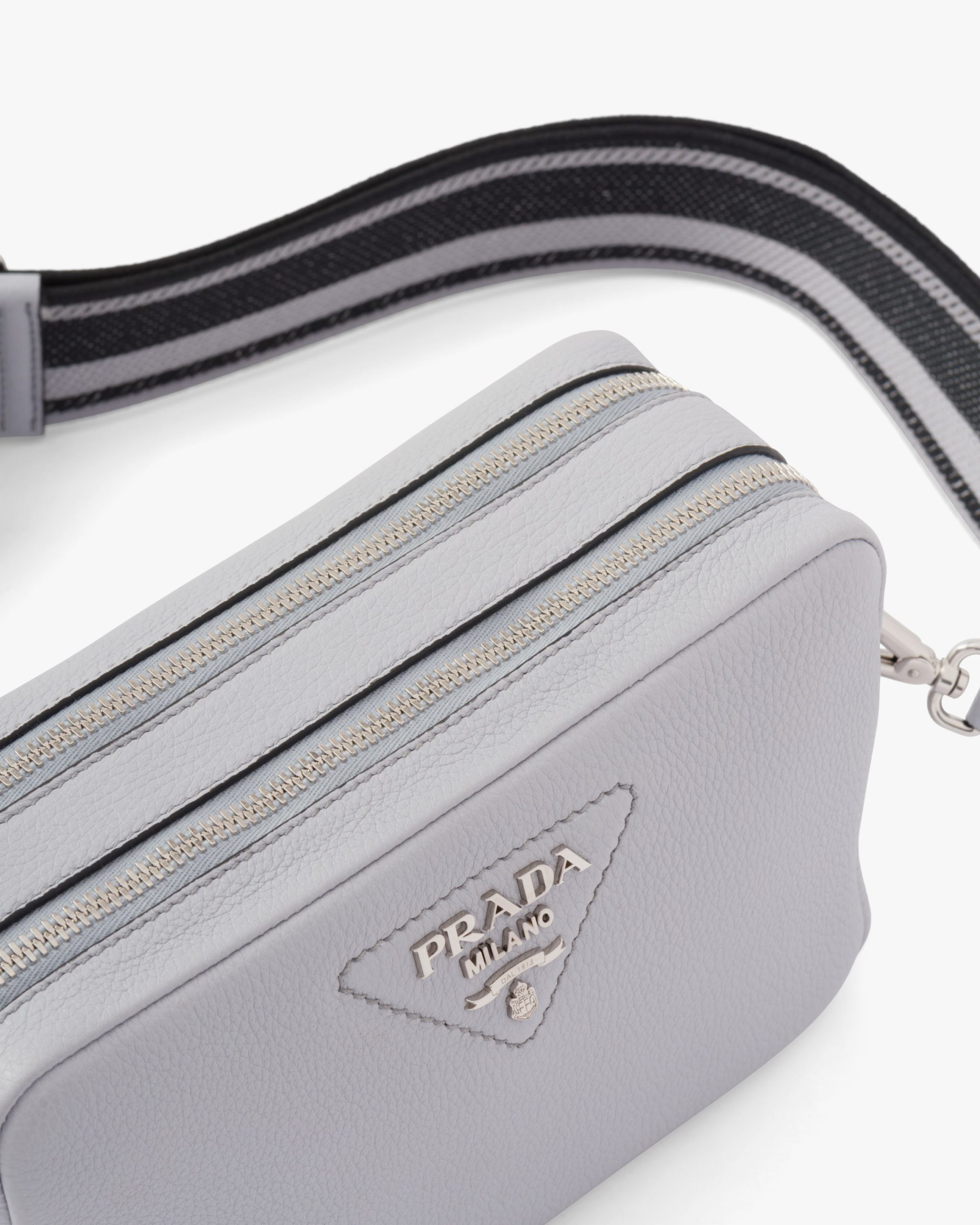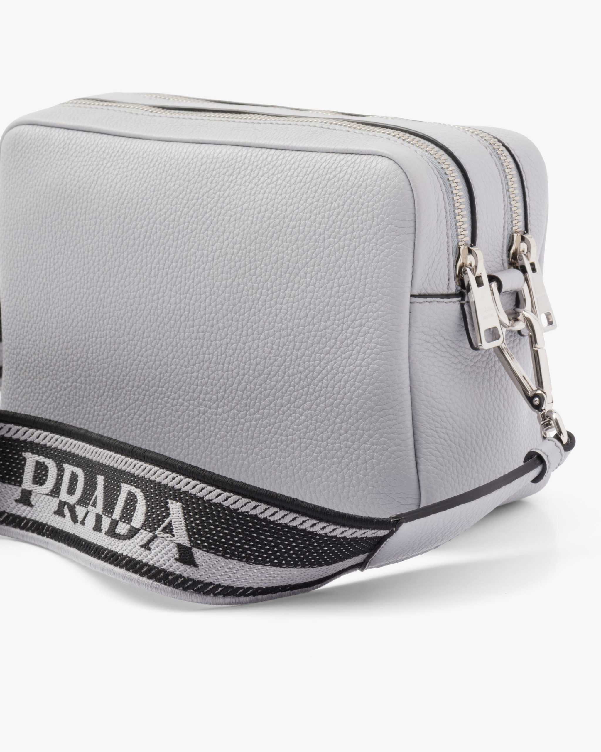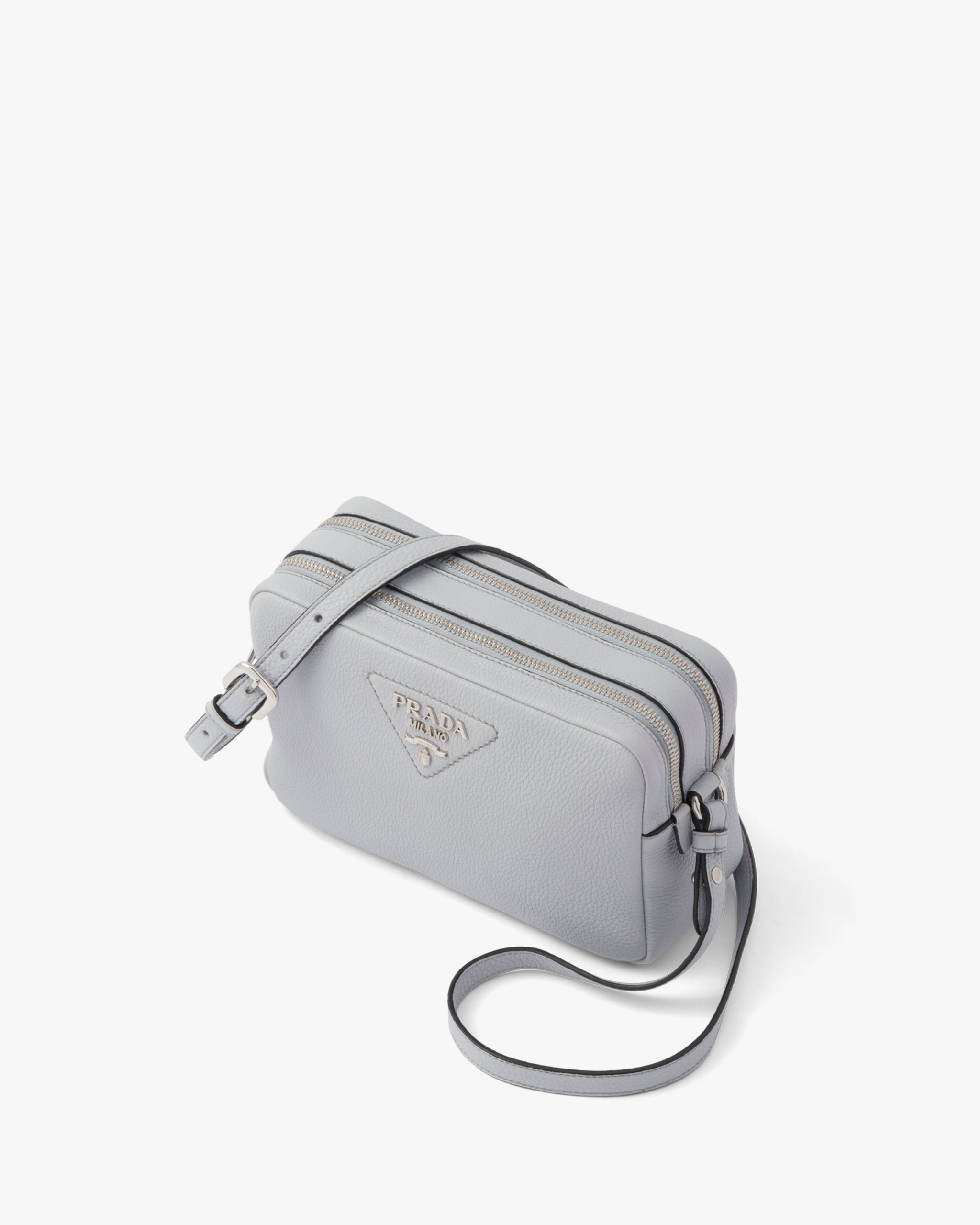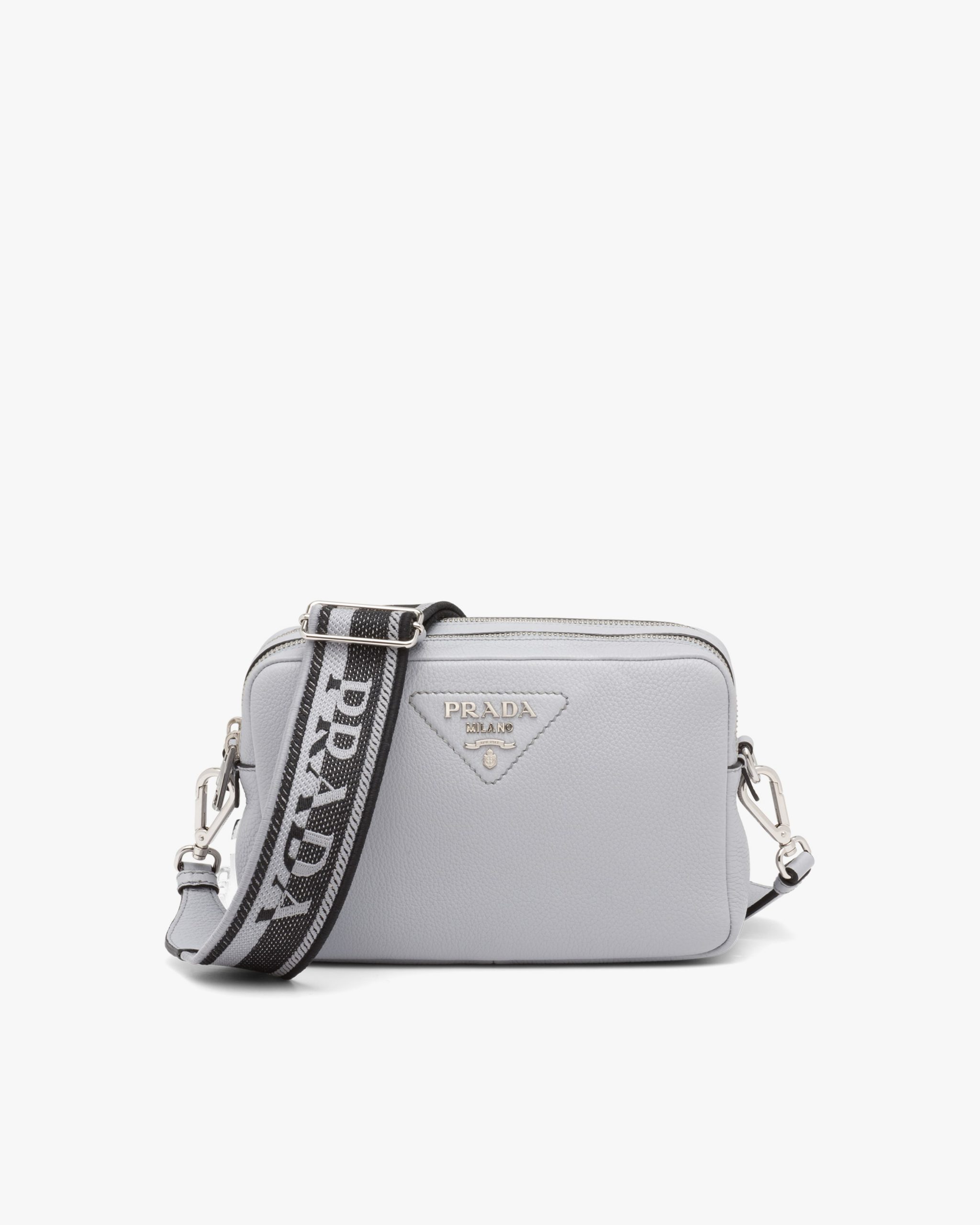 This Prada Flou leather shoulder bag with a double zipper is made of soft leather and illuminated by metal hardware for a modern accent. The accessory is completed by the detachable woven tape shoulder strap embroidered with the logo2 in a contrasting color, that makes it wearable as a crossbody or shoulder bag.