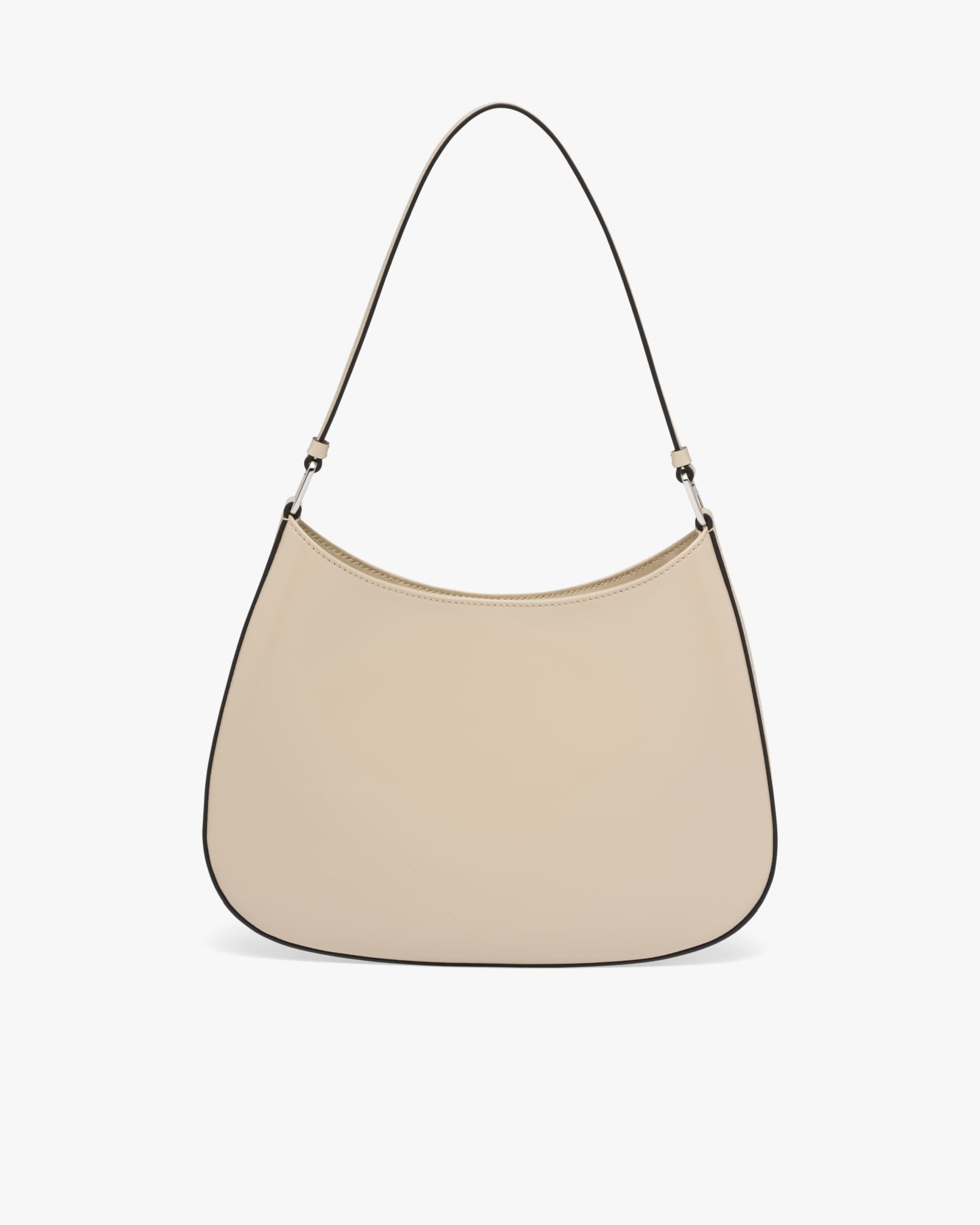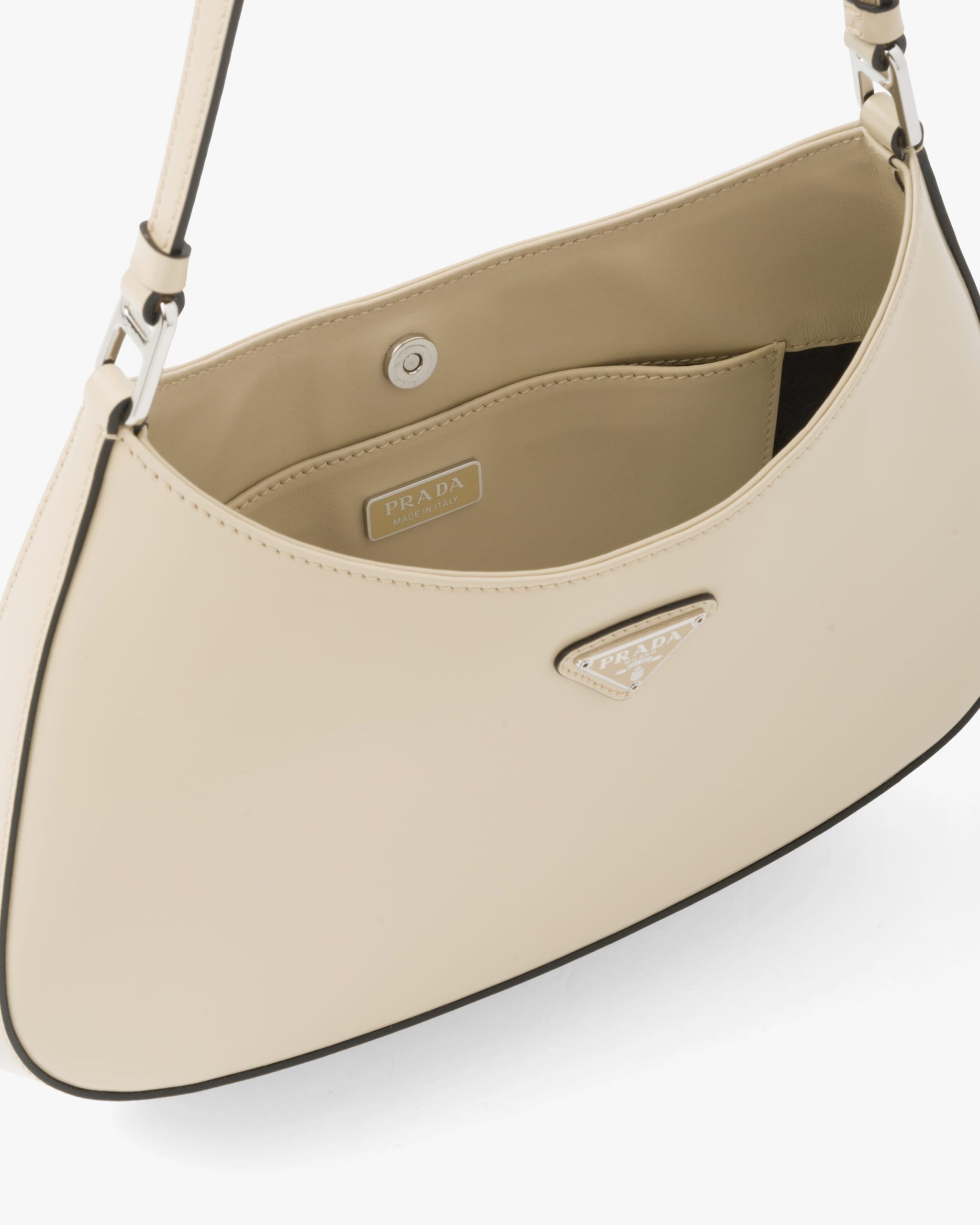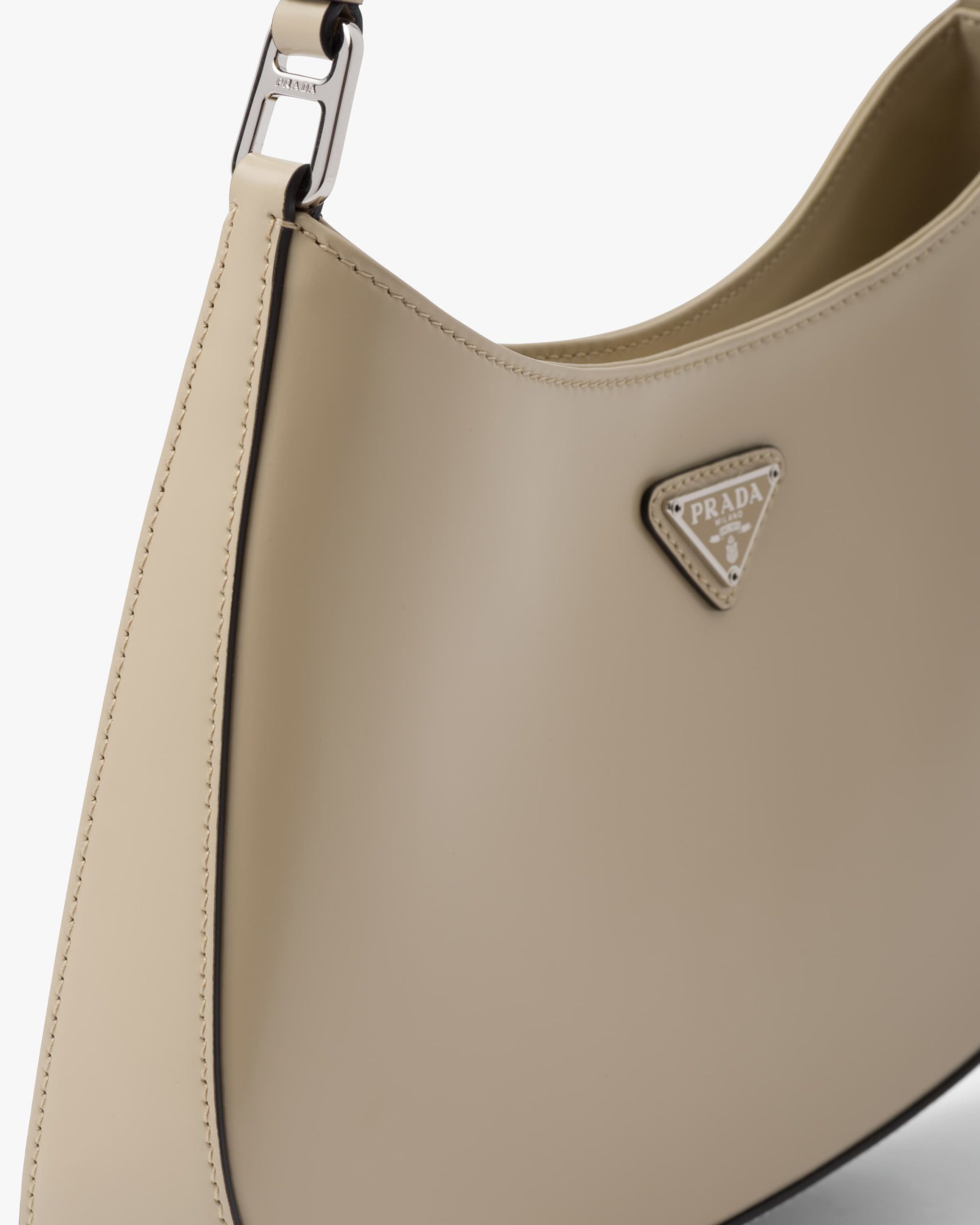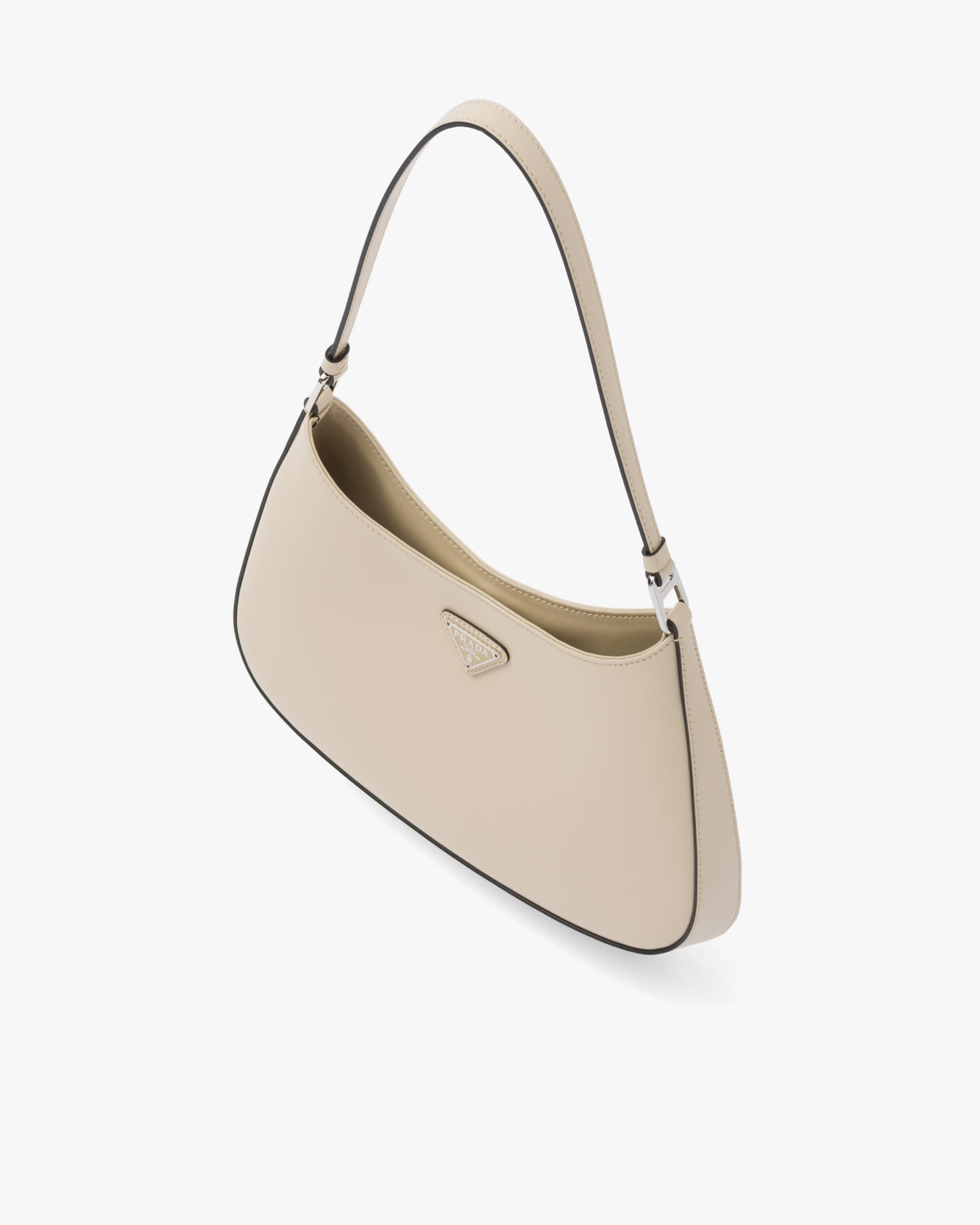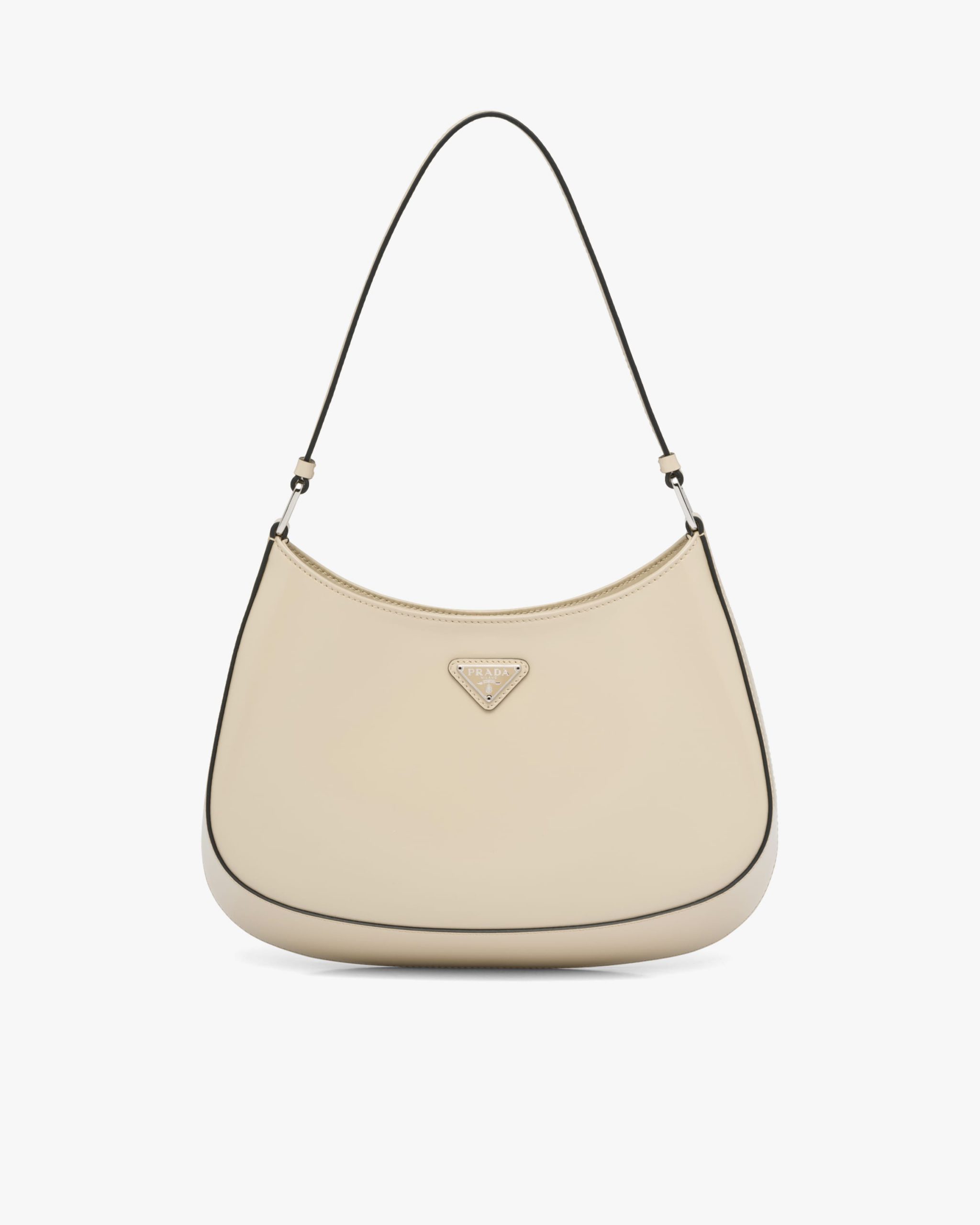 The Prada Cleo bag with sophisticated allure reinterprets an iconic design of the brand from the 1990’s. Sleek curved lines emphasized by the particular construction rounded on the bottom and sides give this hobo bag a soft, light look. Brushed leather, a modern and versatile material that is distinctive in Prada collectsions, is ideal for creating always new combinations and contrasts. The enamel triangle logo2 decorates the silhouette.
