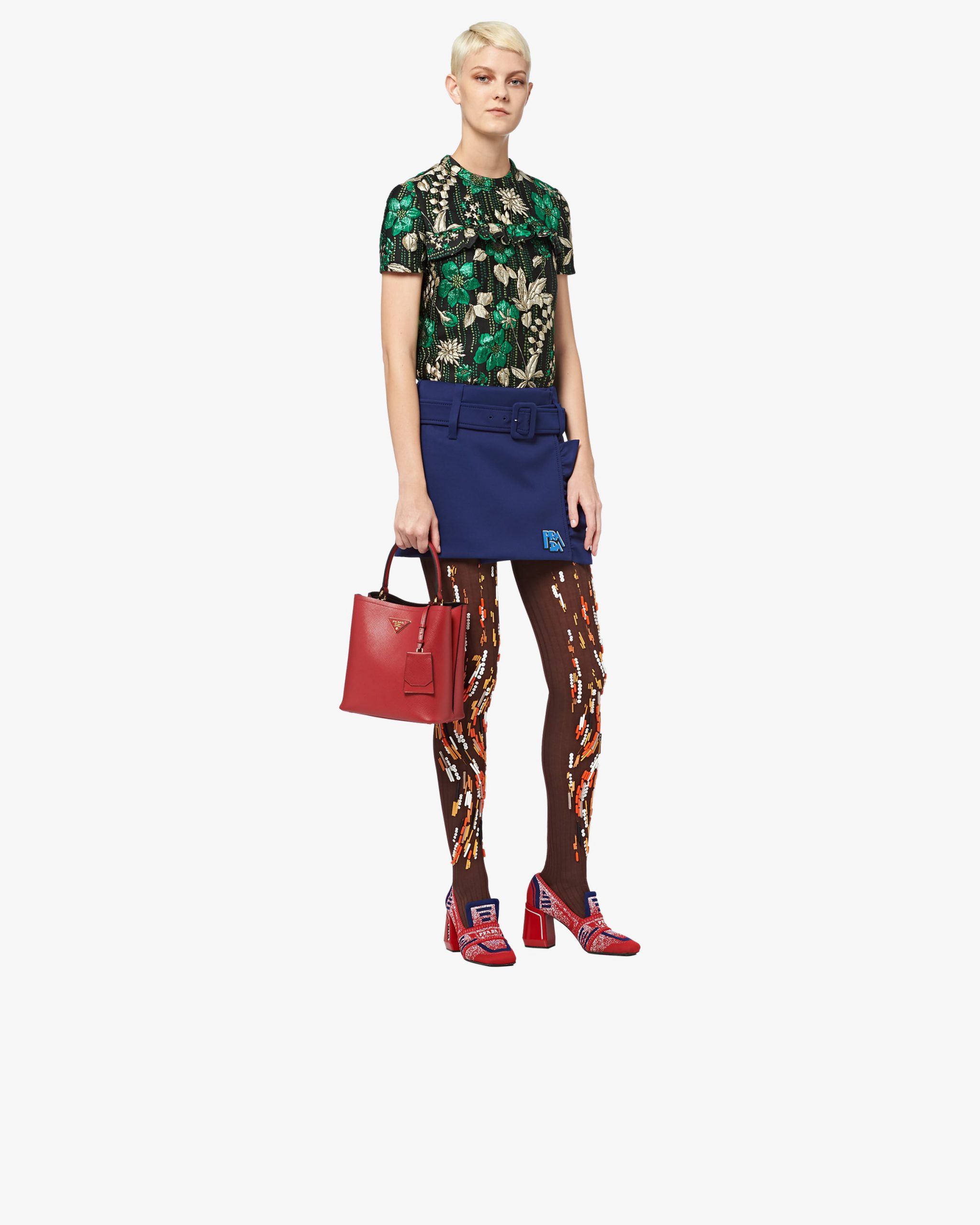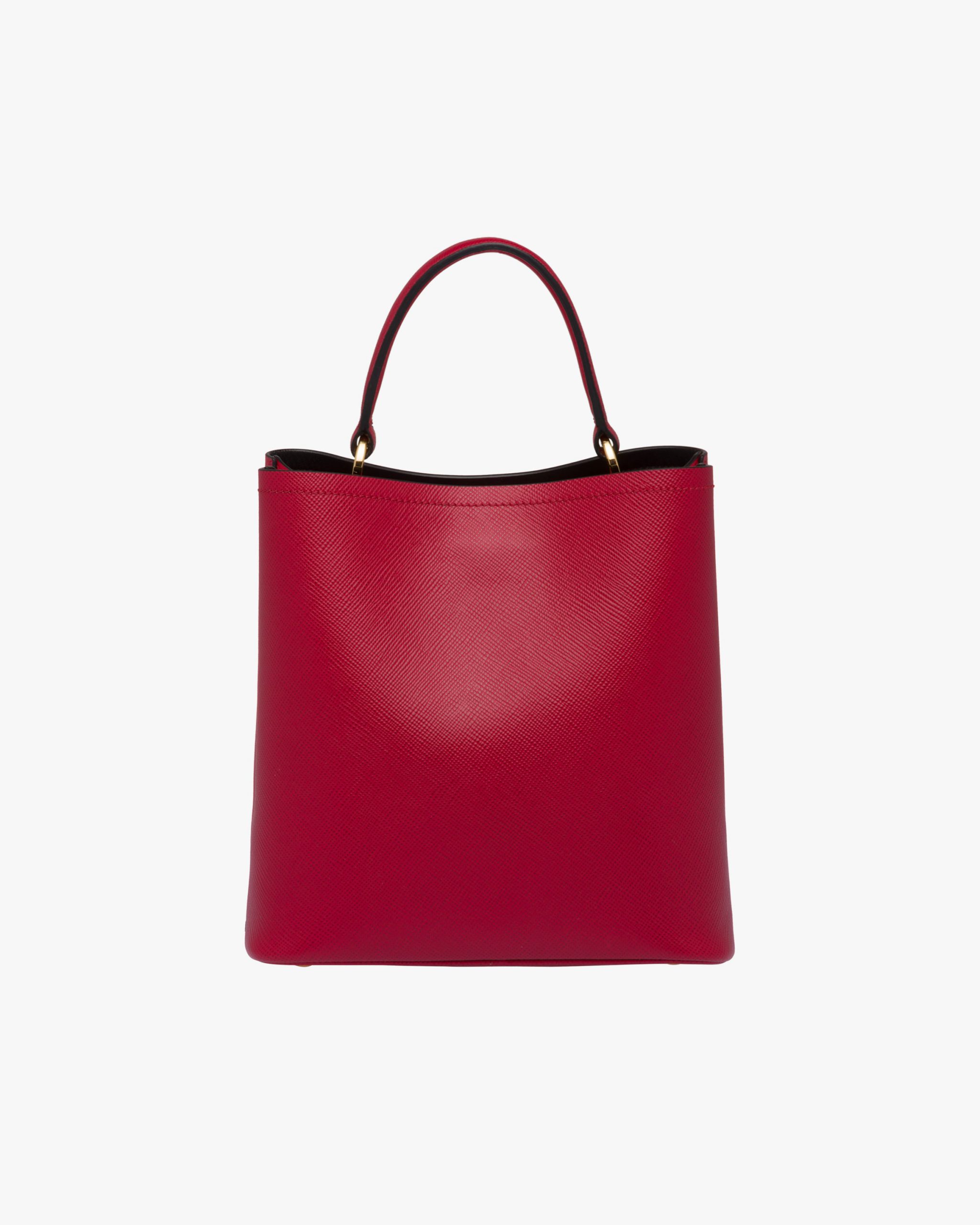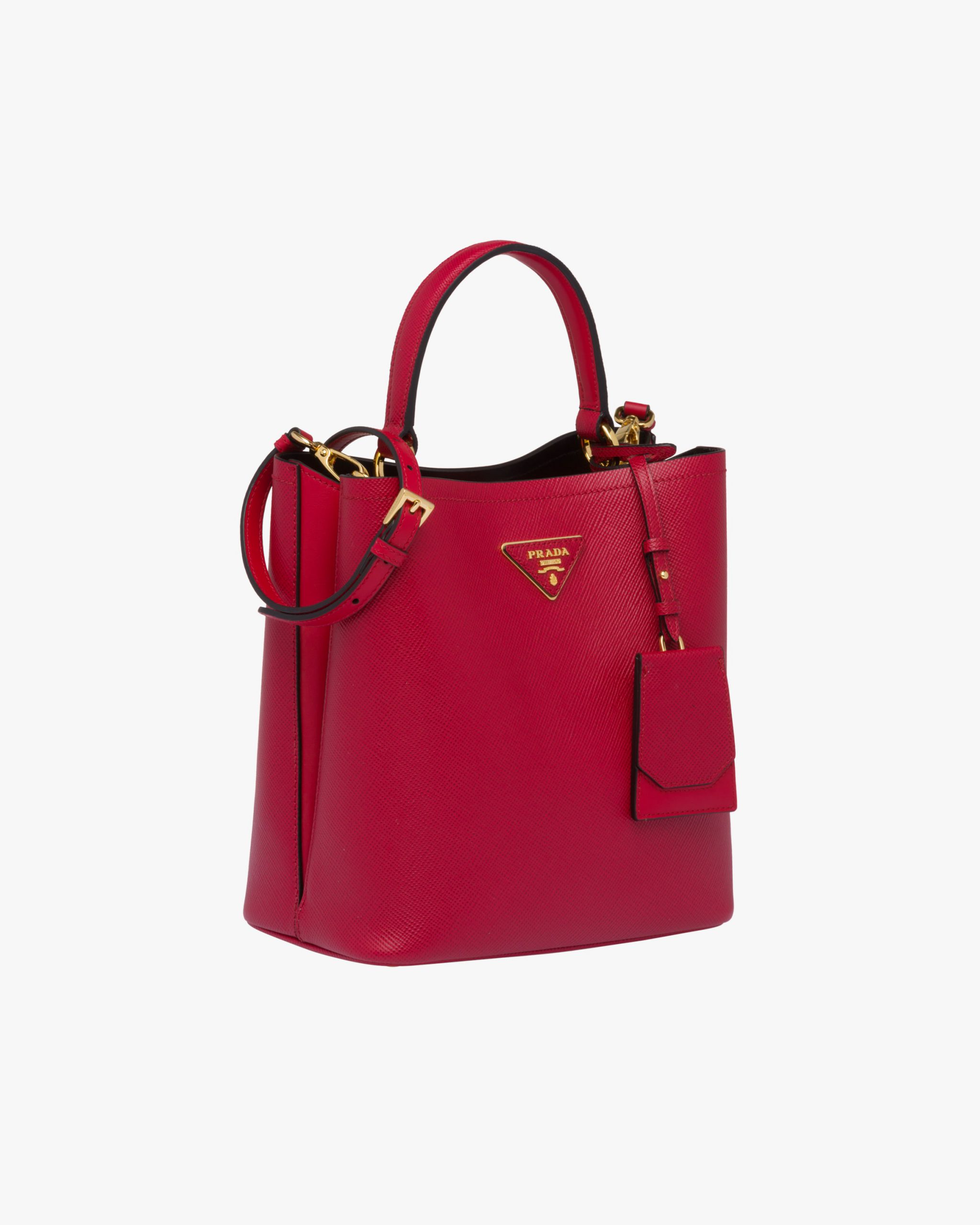 The elegant design of the Prada Panier bag is emphasized by the unmistakable texture of Saffiano leather. The bag has a detachable shoulder strap and an exclusive leather name tag with metal logo2.