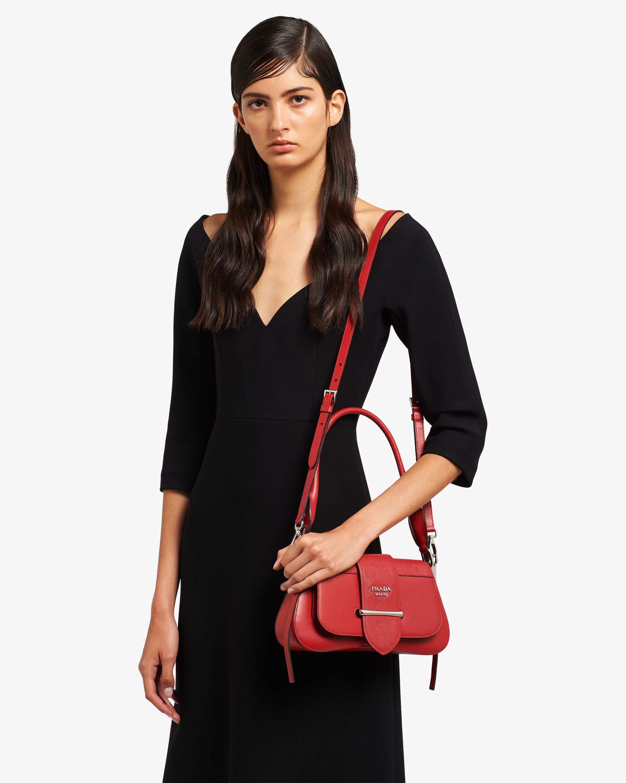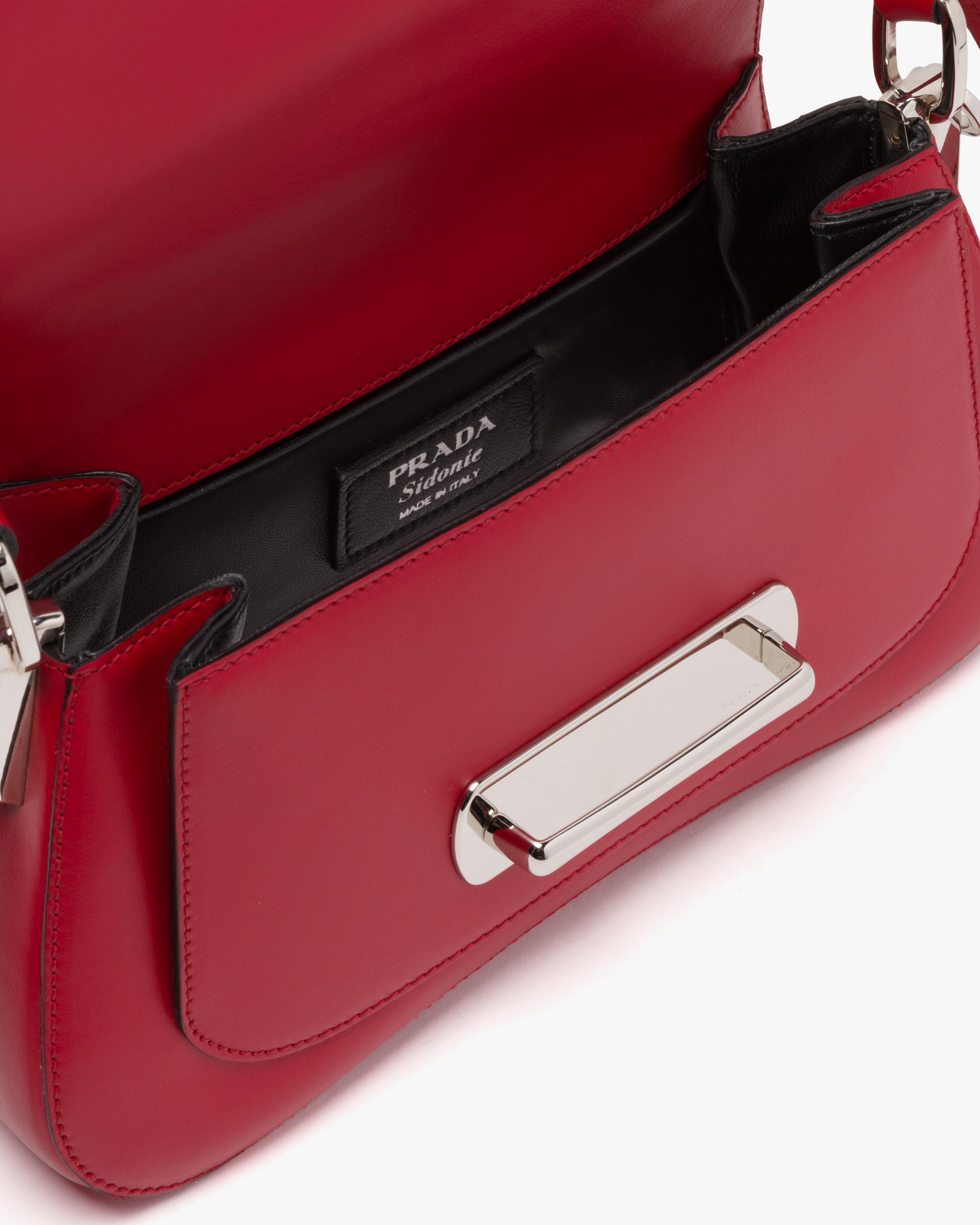 A sinuous line designs the silhouette of the Prada Sidonie bag. Made of leather, it is characterized by the front strap.