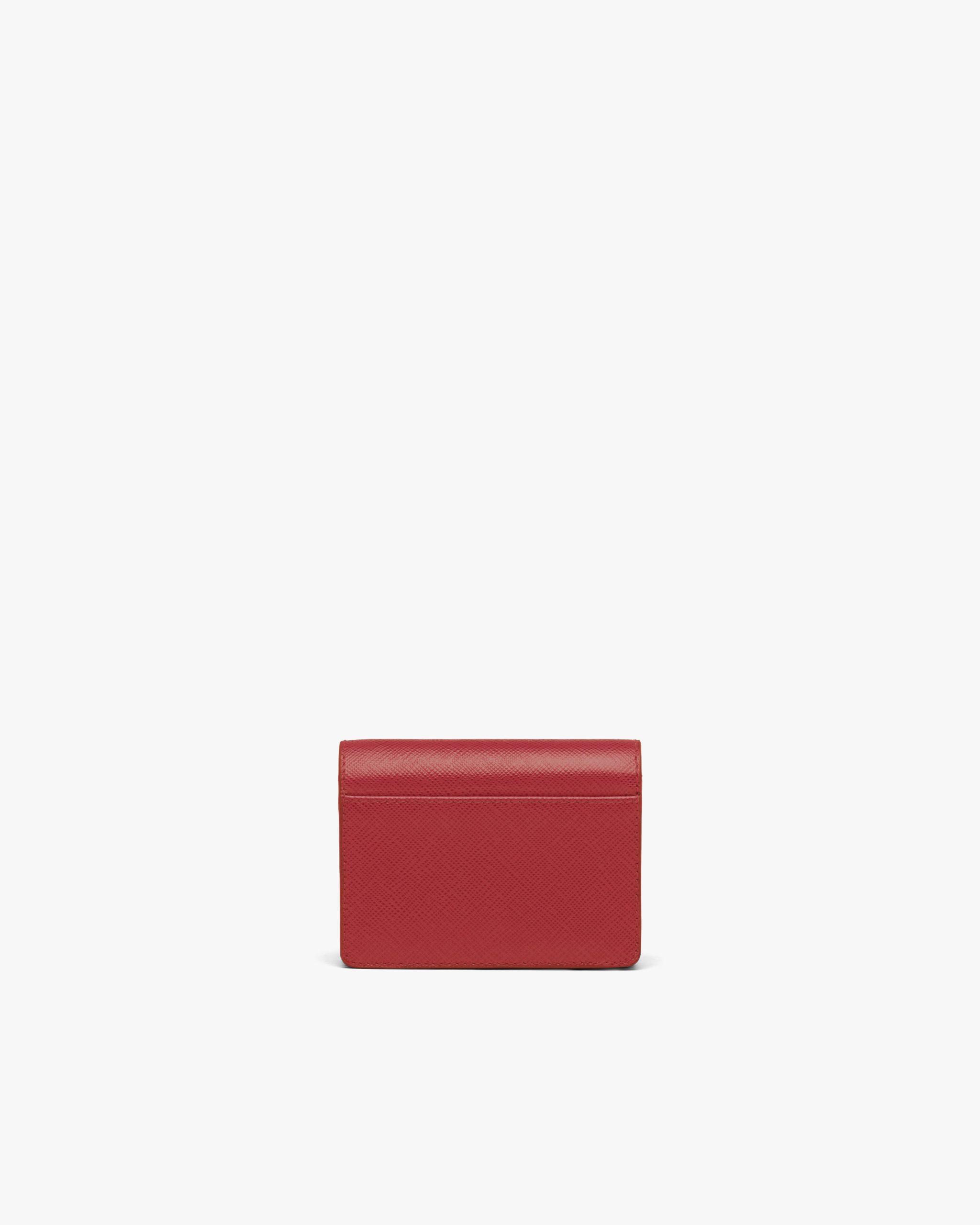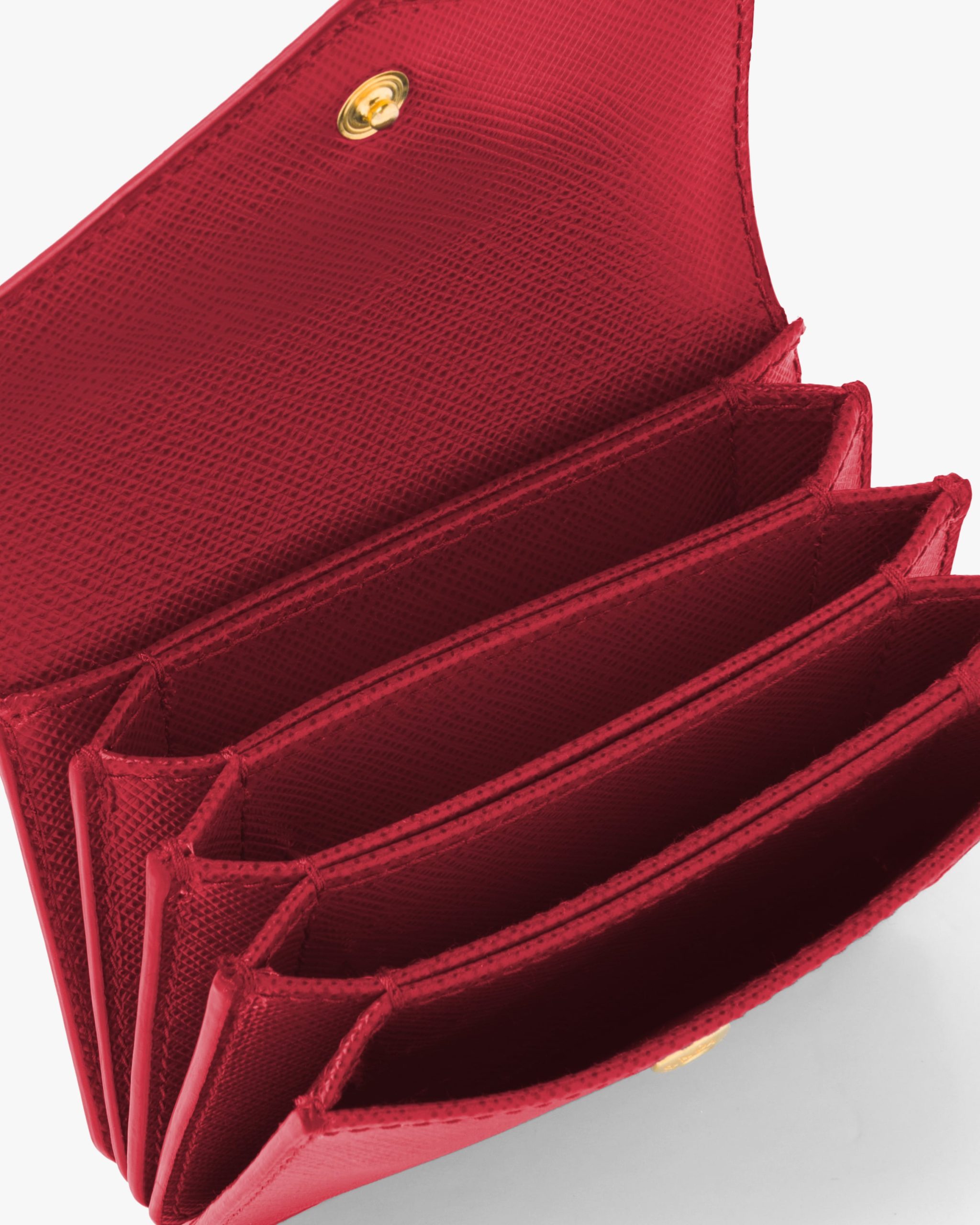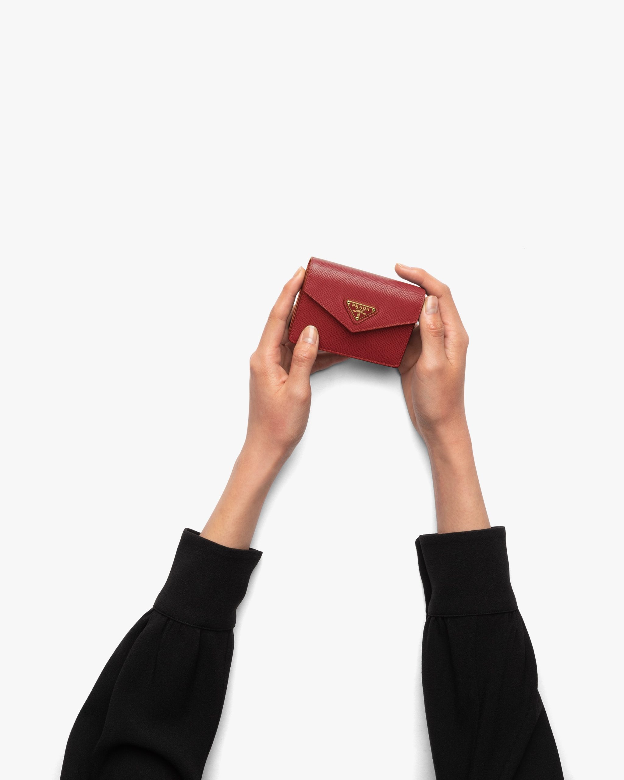With its pleated design, this Saffiano leather card holder has a snap closure and metal triangle logo2.