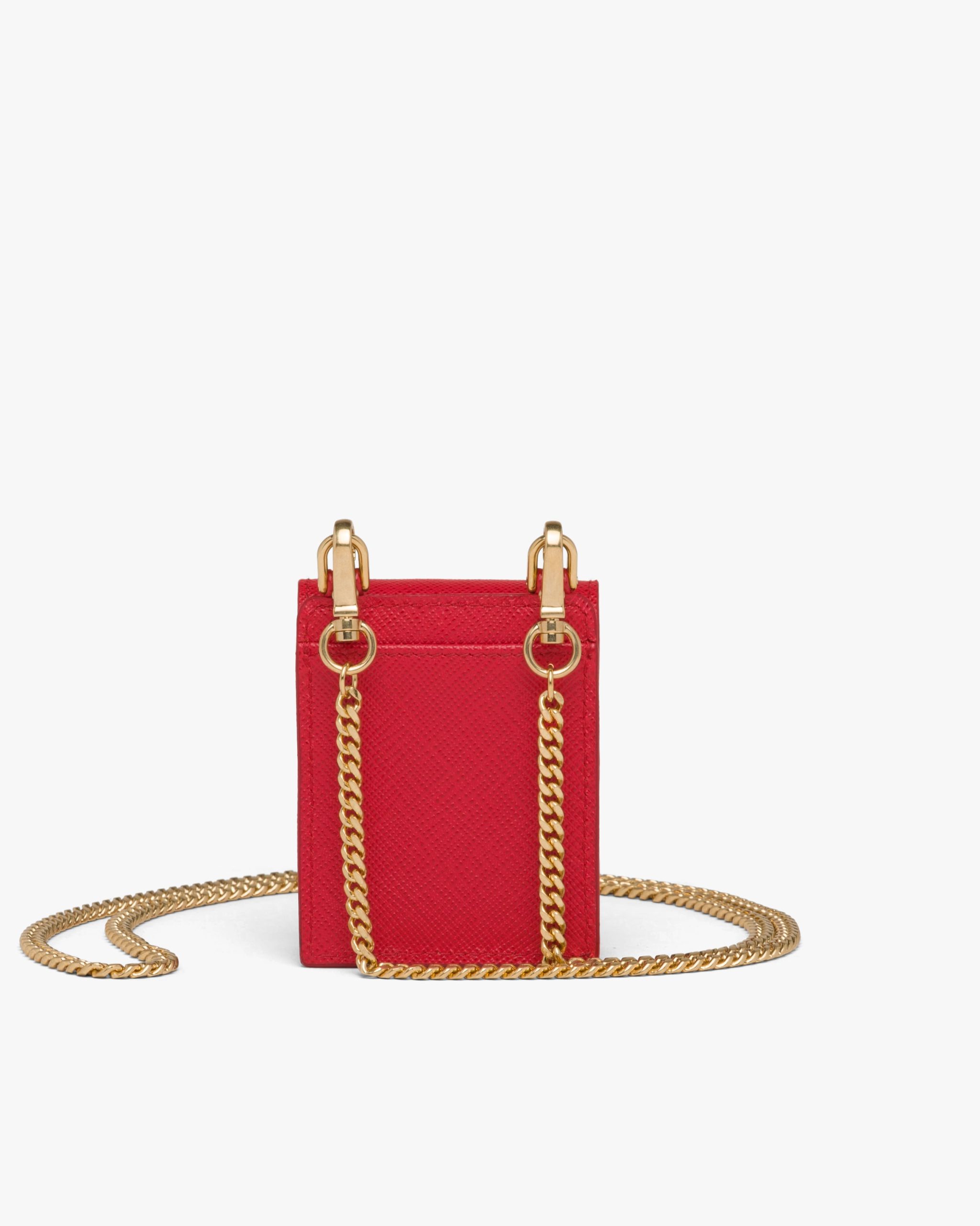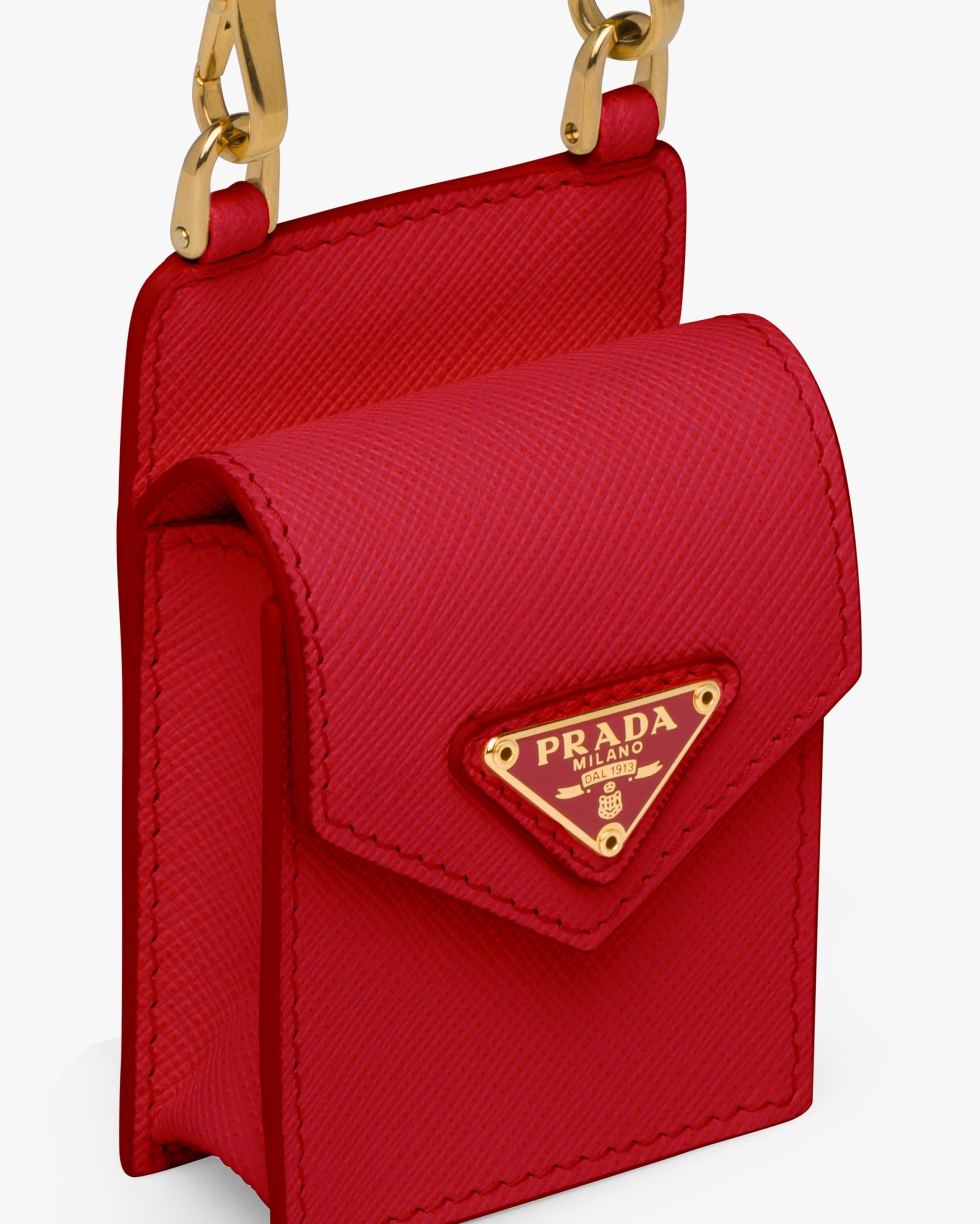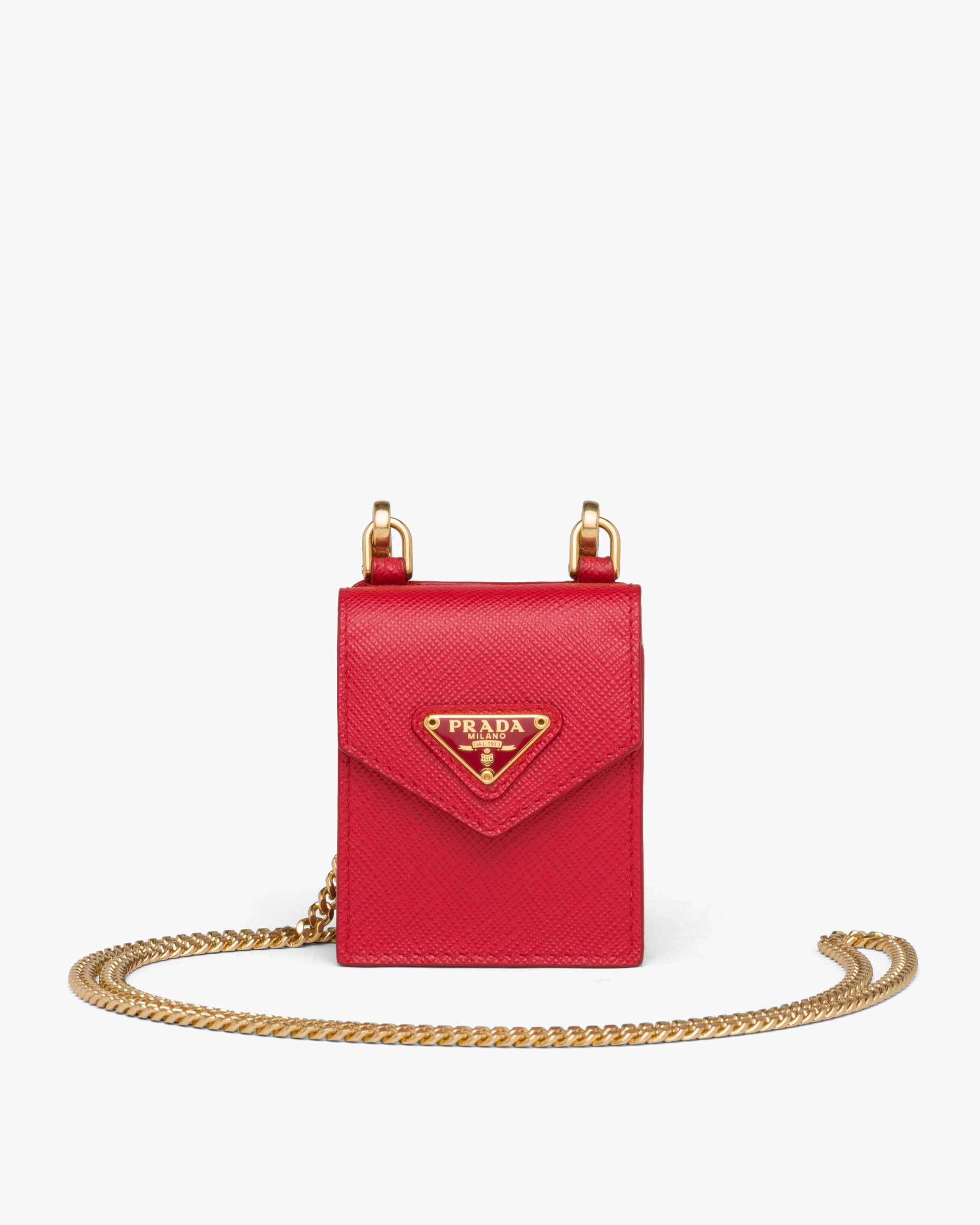 The metal triangle logo2 decorates this Saffiano leather earphone case with neck strap.