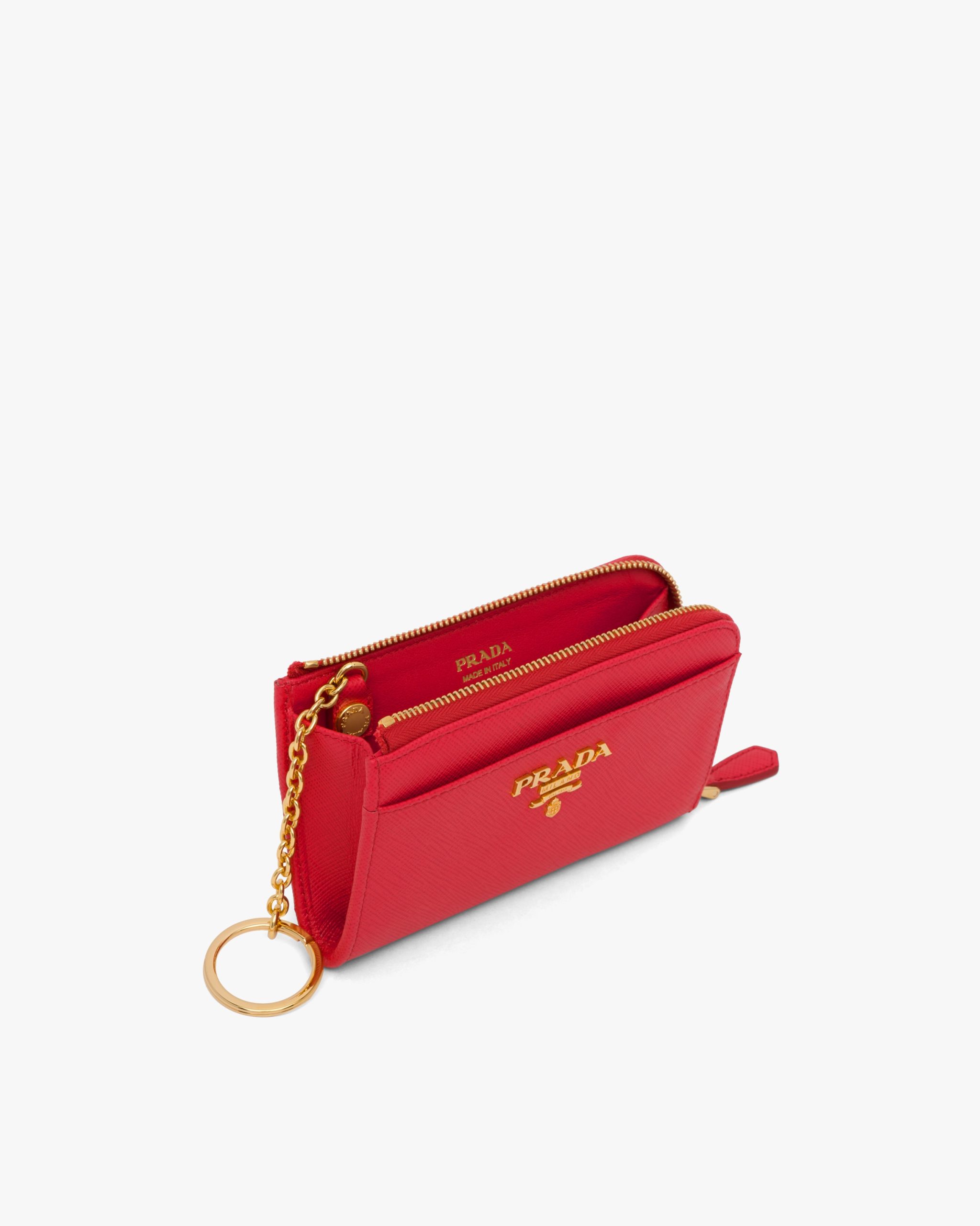 This Saffiano leather keychain is decorated with the metal lettering logo2 and has card slots.