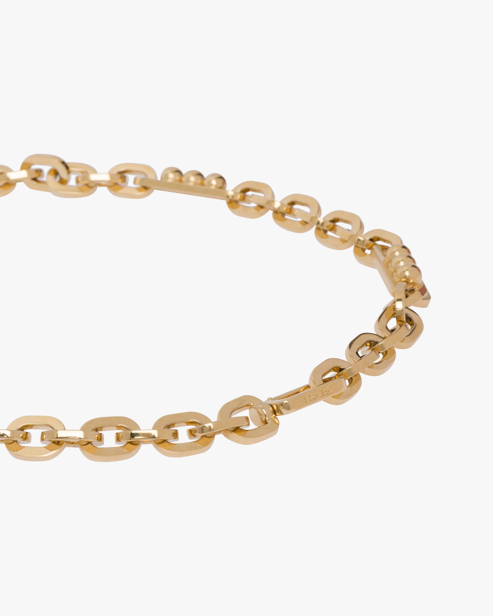This metal necklace has a chain design with geometric inserts and lobster claw clasp.