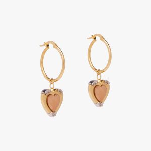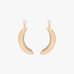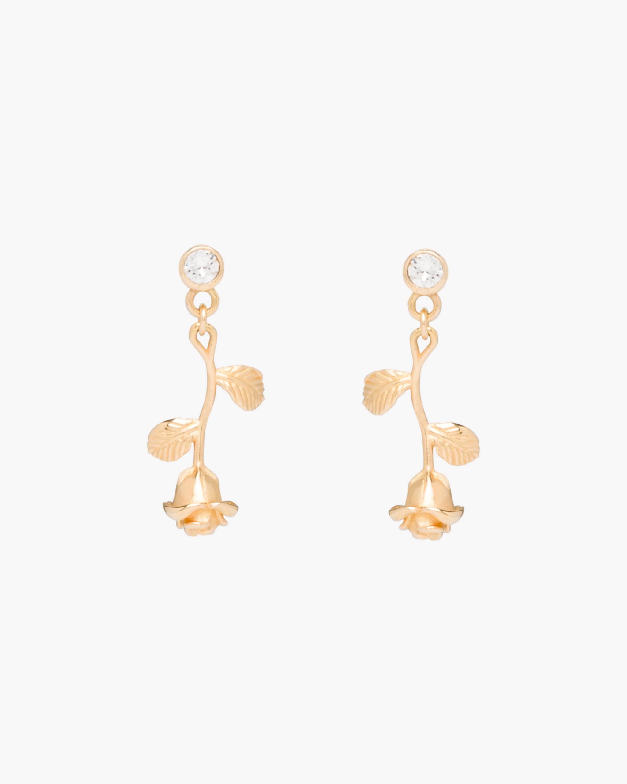 These gold earrings with rose-shaped charm are embellished with diamonds.