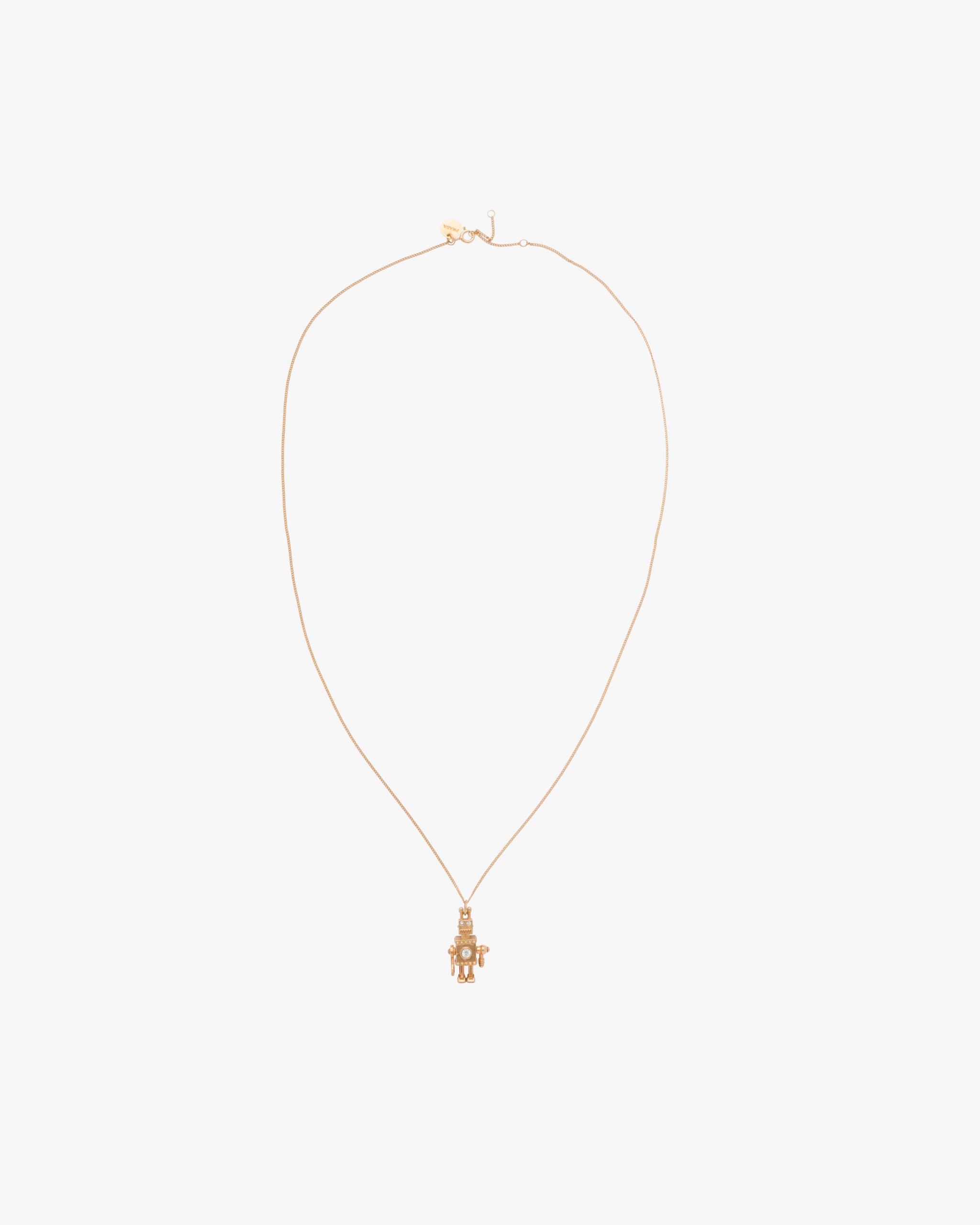 This elegant gold necklace with a contemporary design is embellished with a diamond-studded robot-shaped pendant.