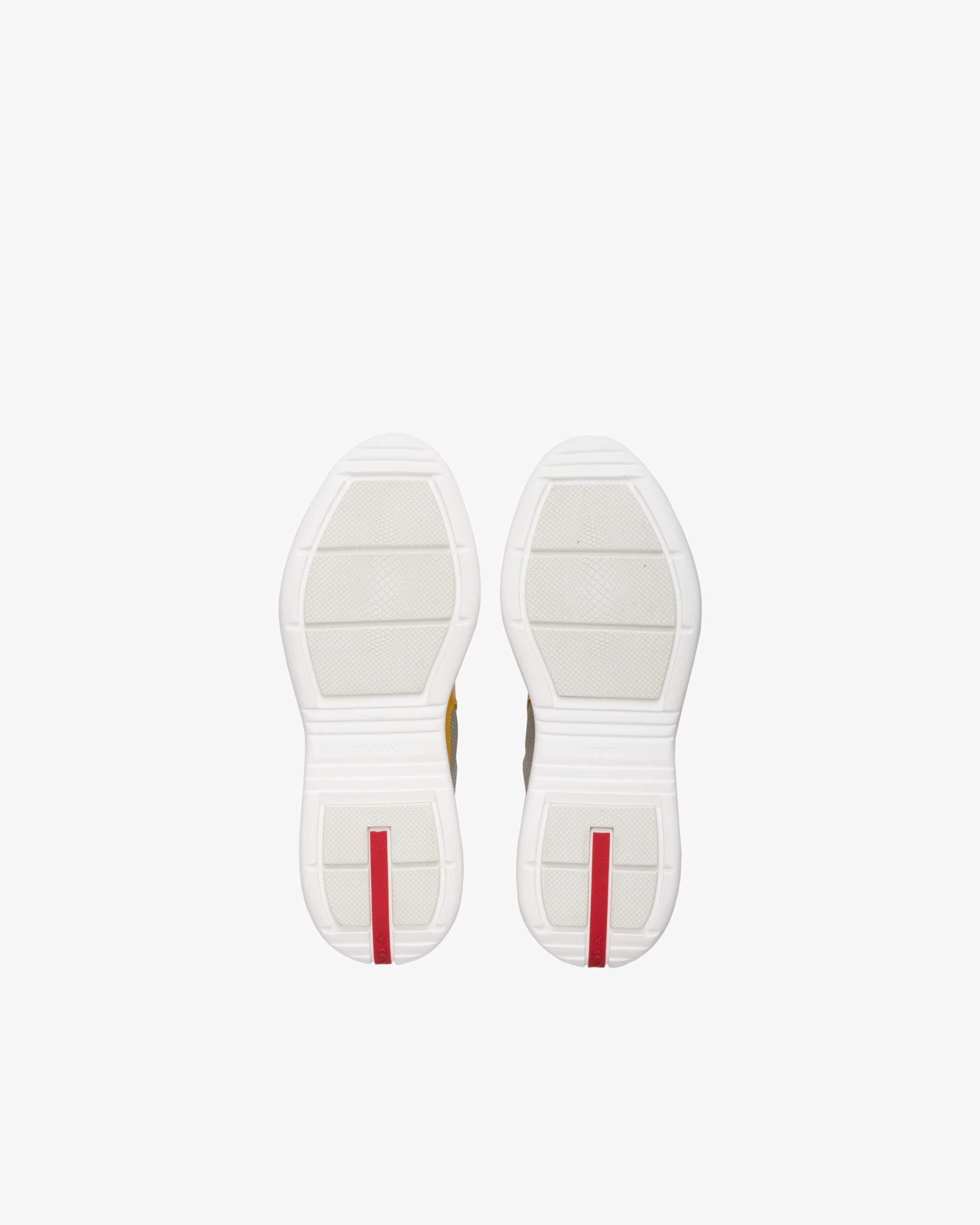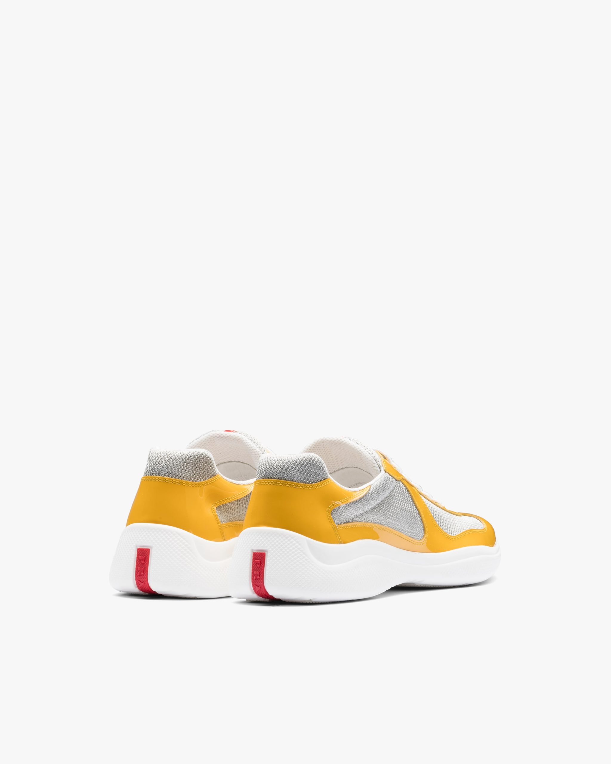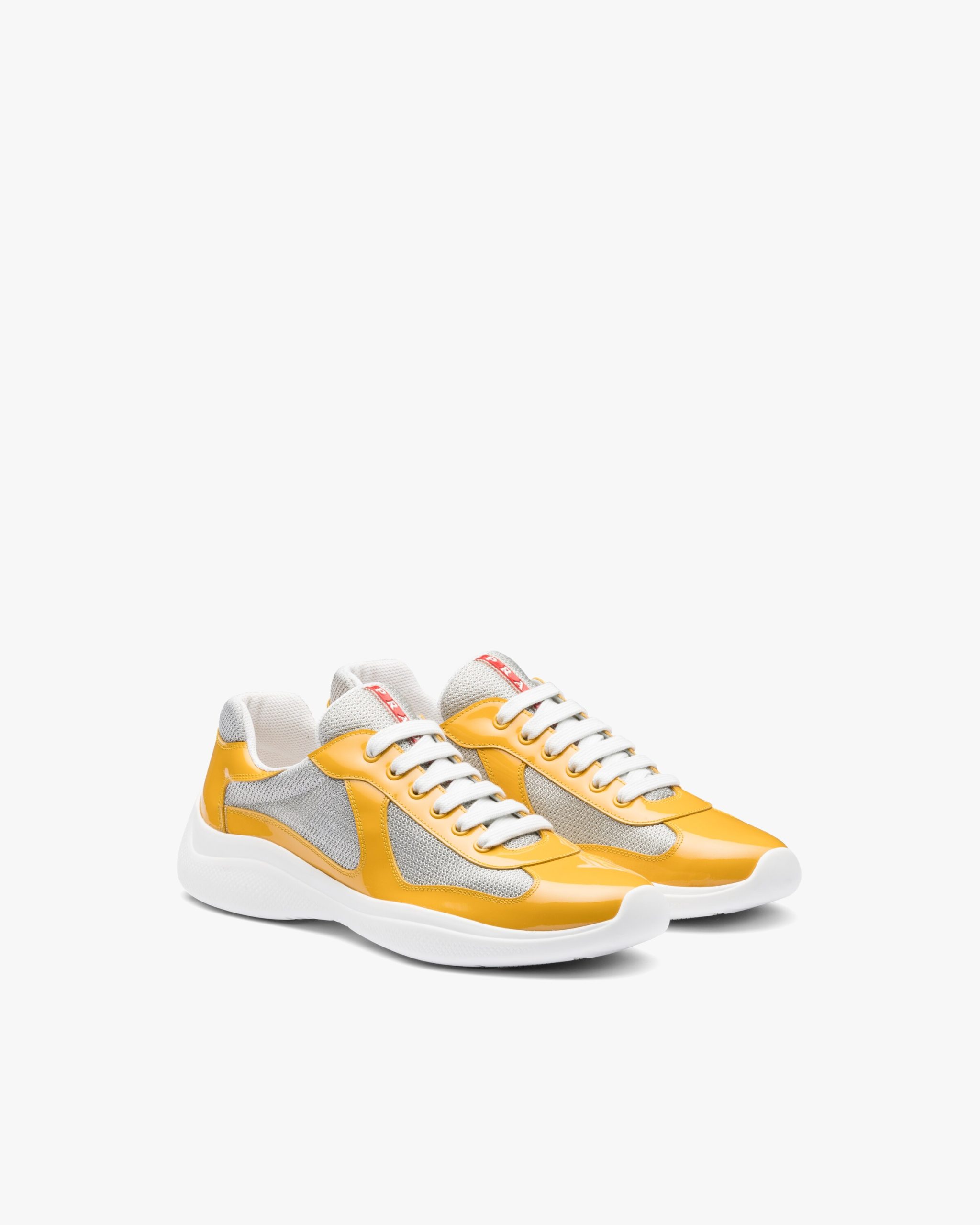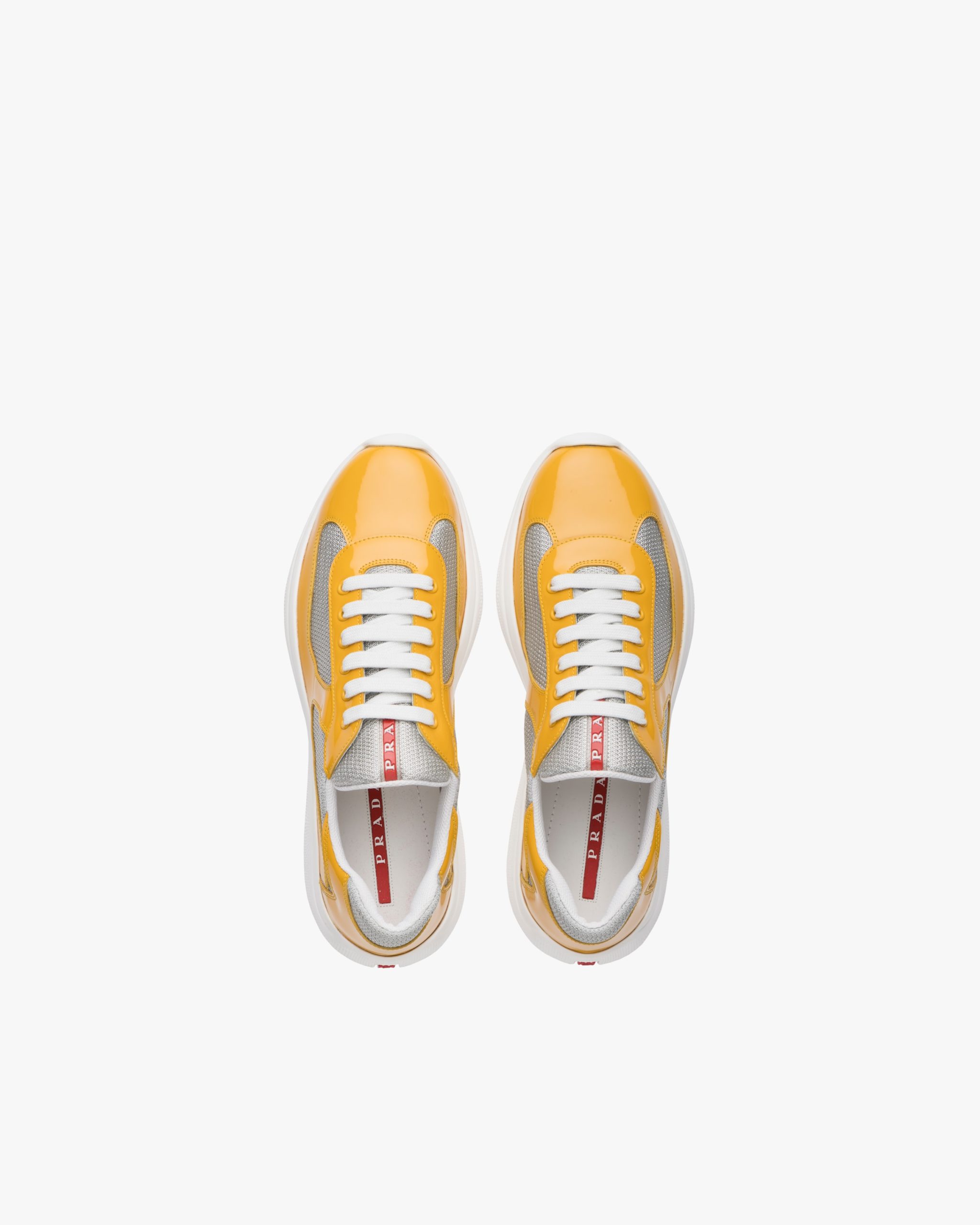 These patent leather sneakers with bike fabric inserts are inspired by an iconic aesthetic. The unmistakable Prada Linea Rossa logo2 on the tongue and sole enhances the design.