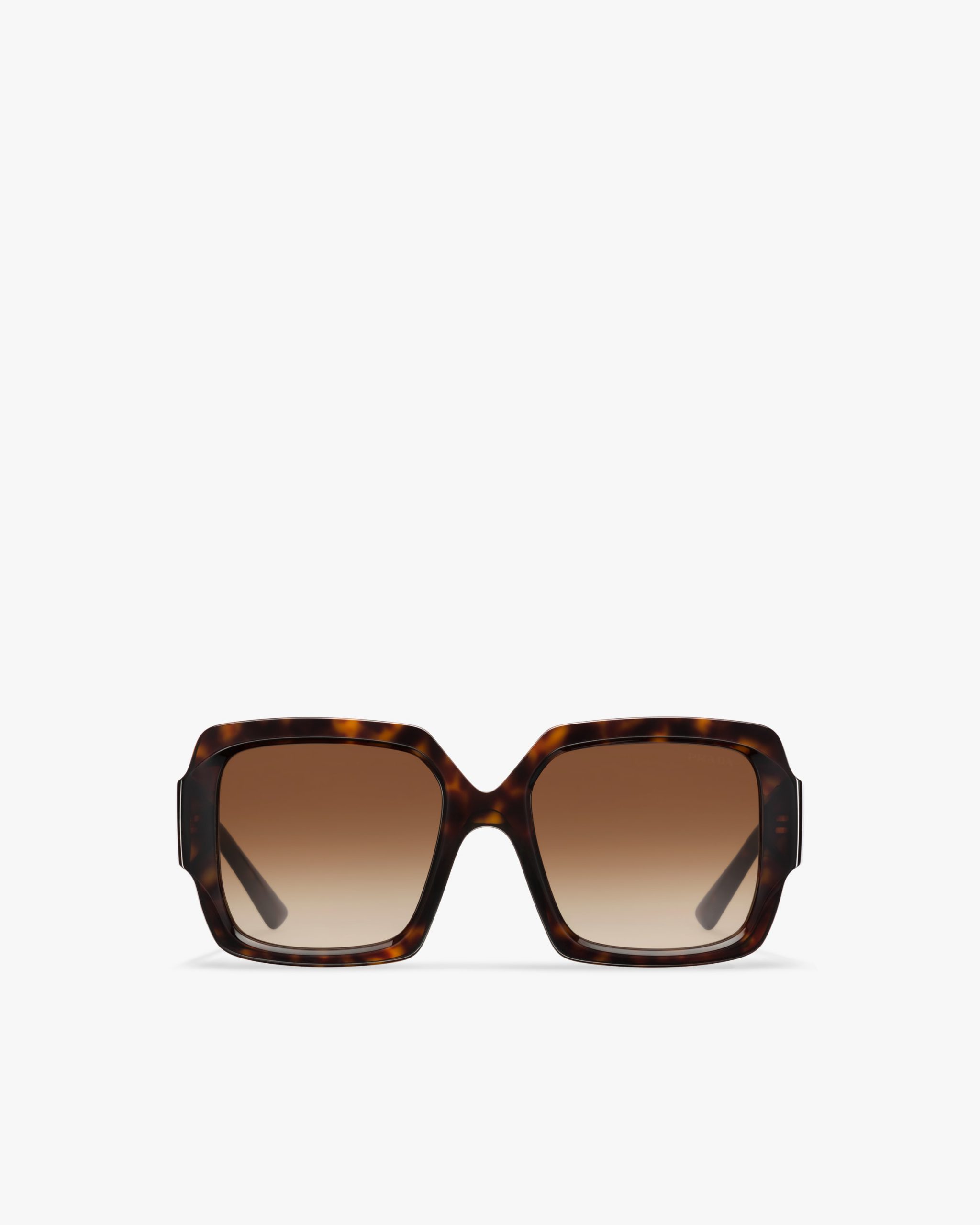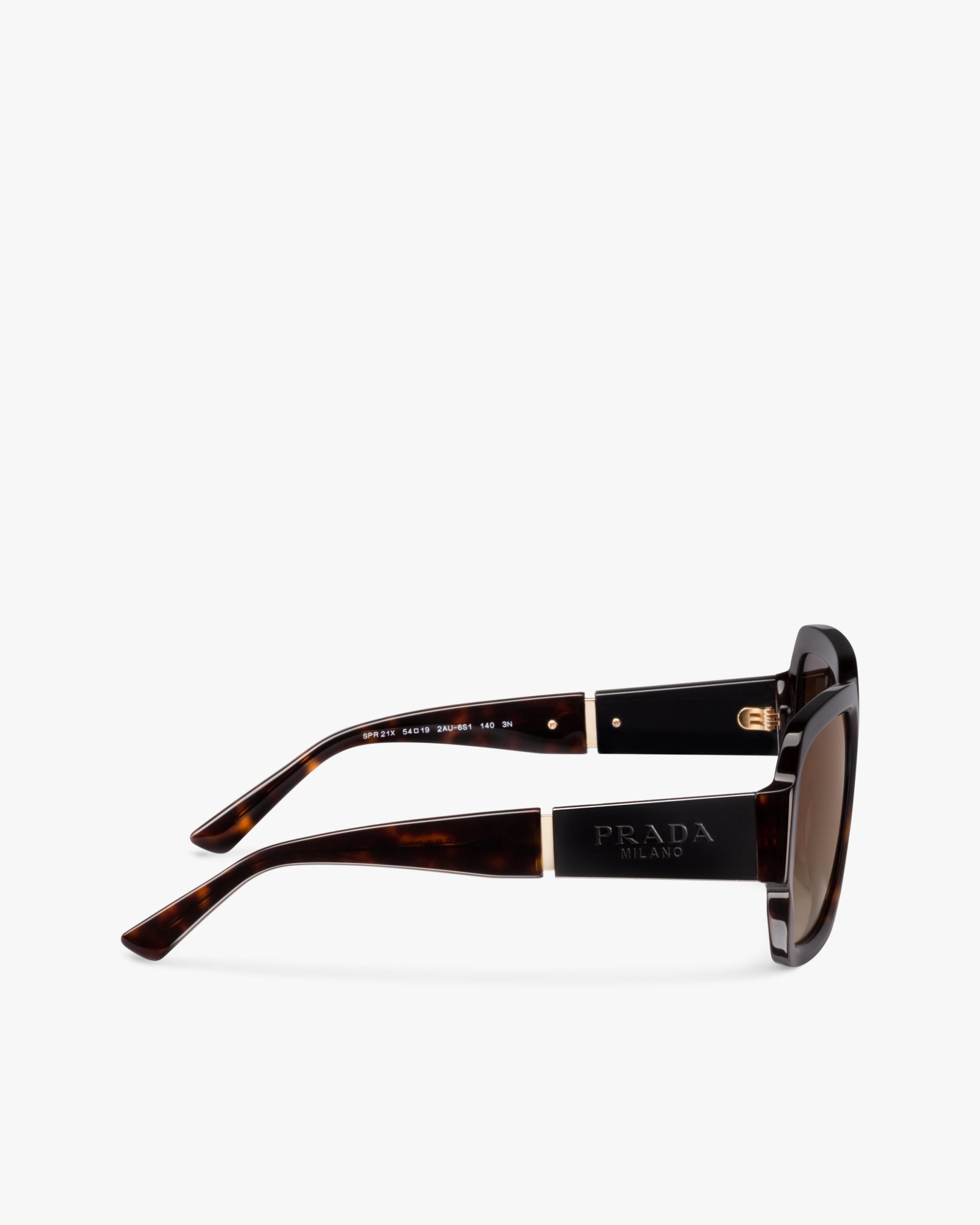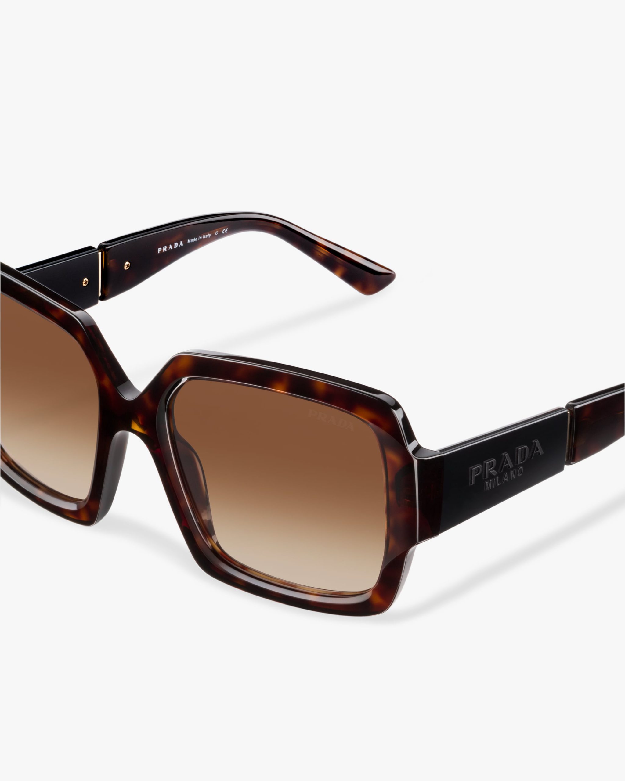 Oversized sunglasses with modern elegance. The frame is characterized by its square shape highlighted by the thick rims. The temples echo the stylistic elements of the ?Monochrome? collectsion thanks to the exclusive tonal Prada Lettering logo2.