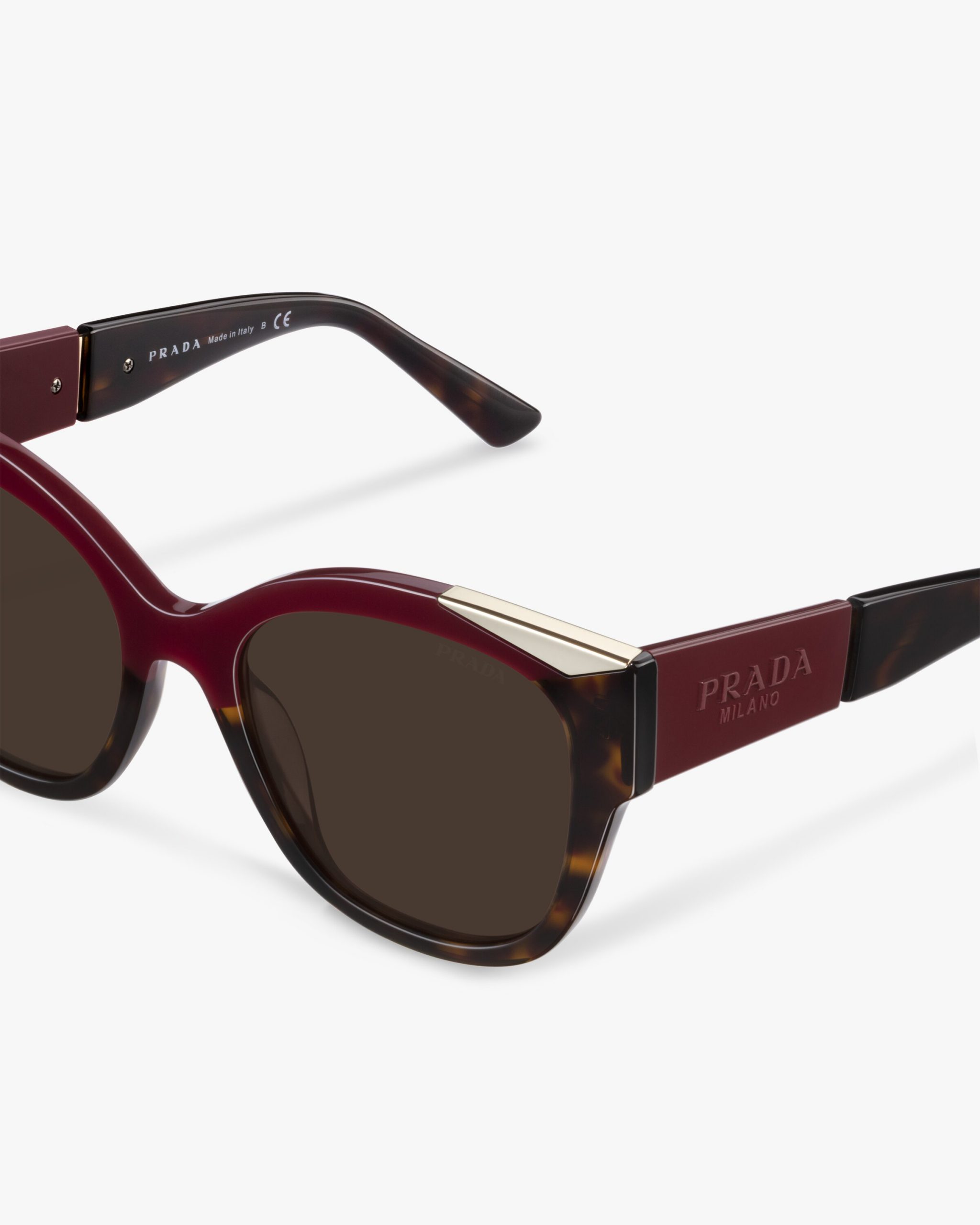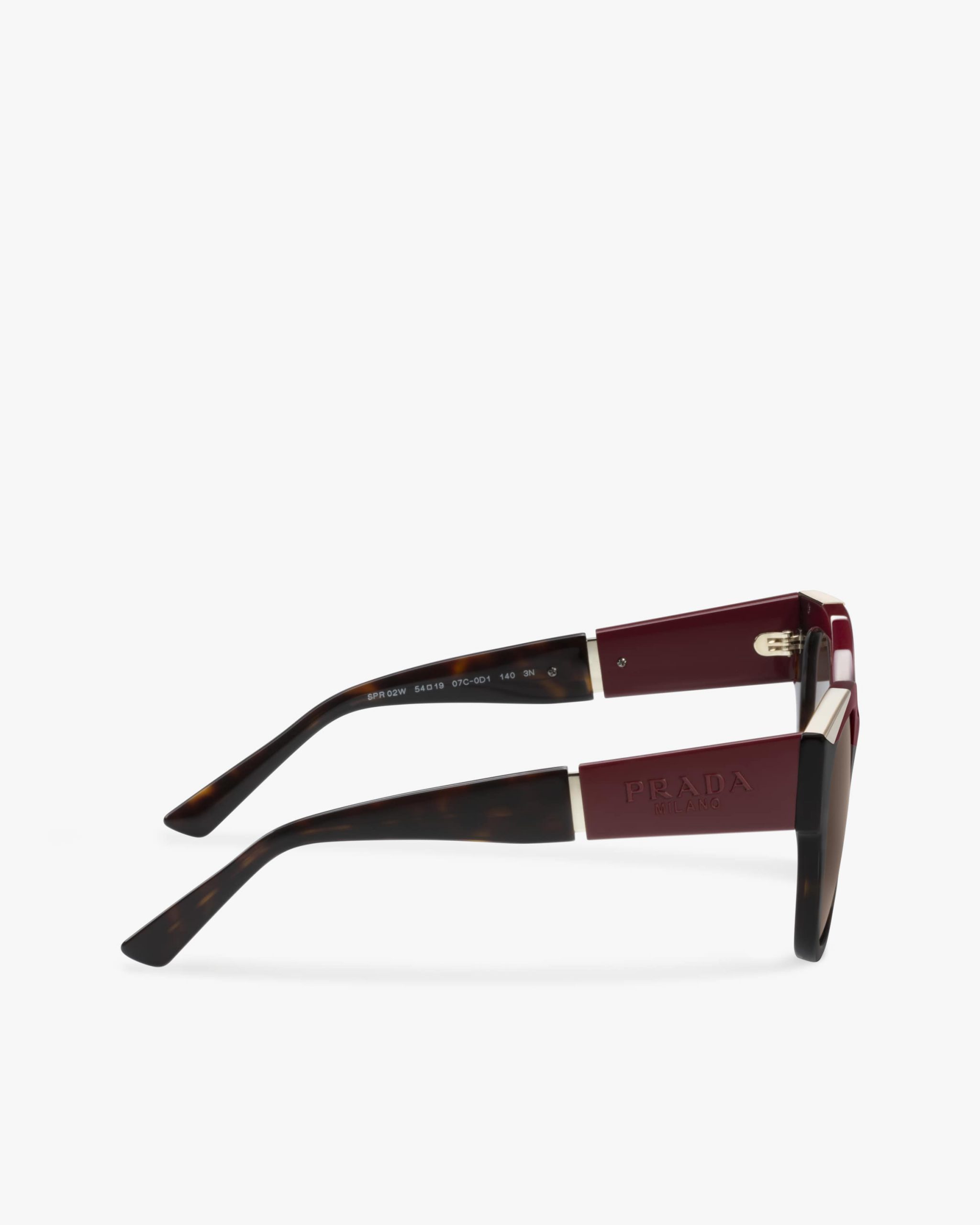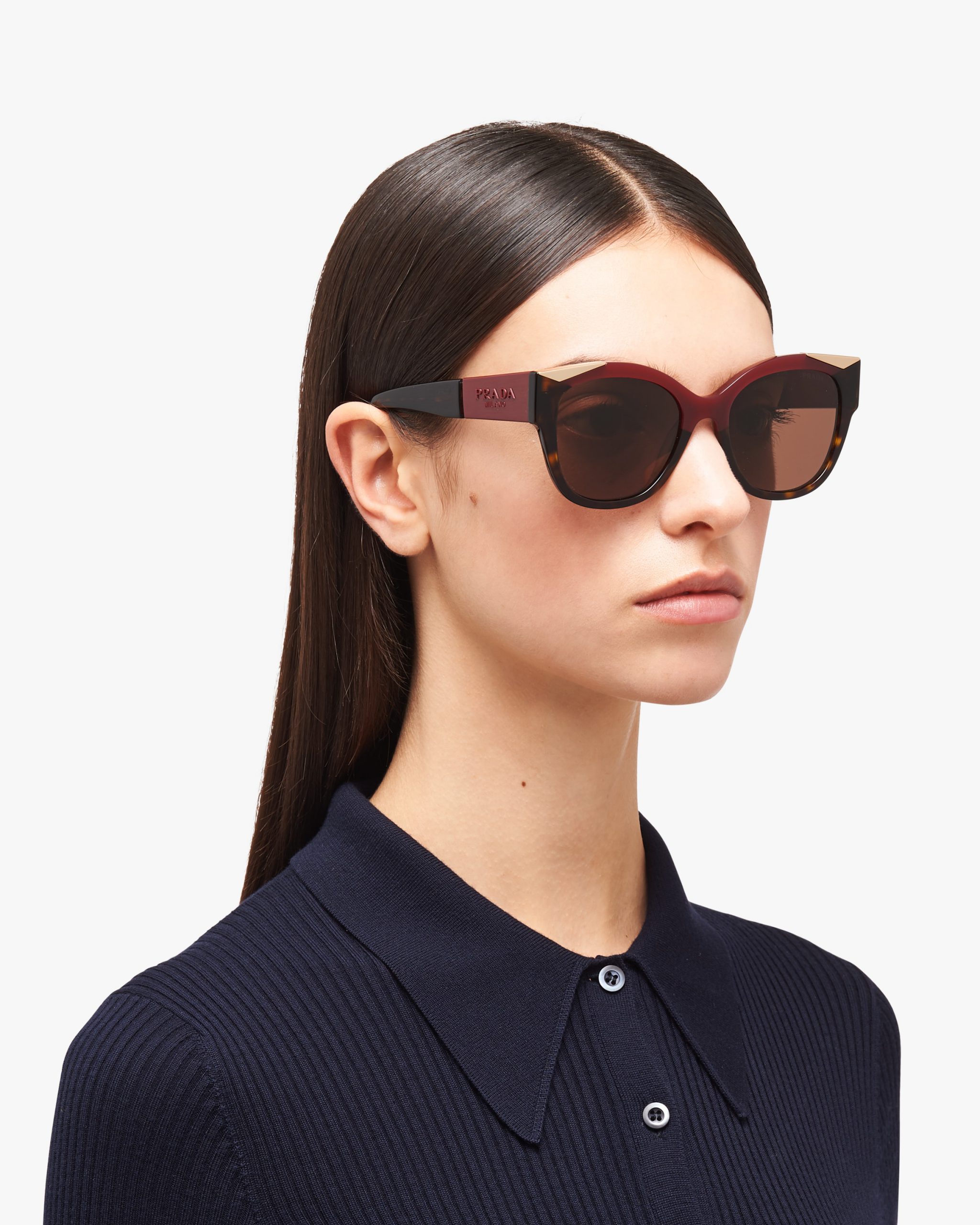 Sunglasses with a cat-eye shape featuring a sophisticated combination of acetate layers and exclusive metal details. The temples reveal the exclusive application of the tonal Prada lettering logo2 in synergy with the accessories from the ?Monochrome? collectsion.