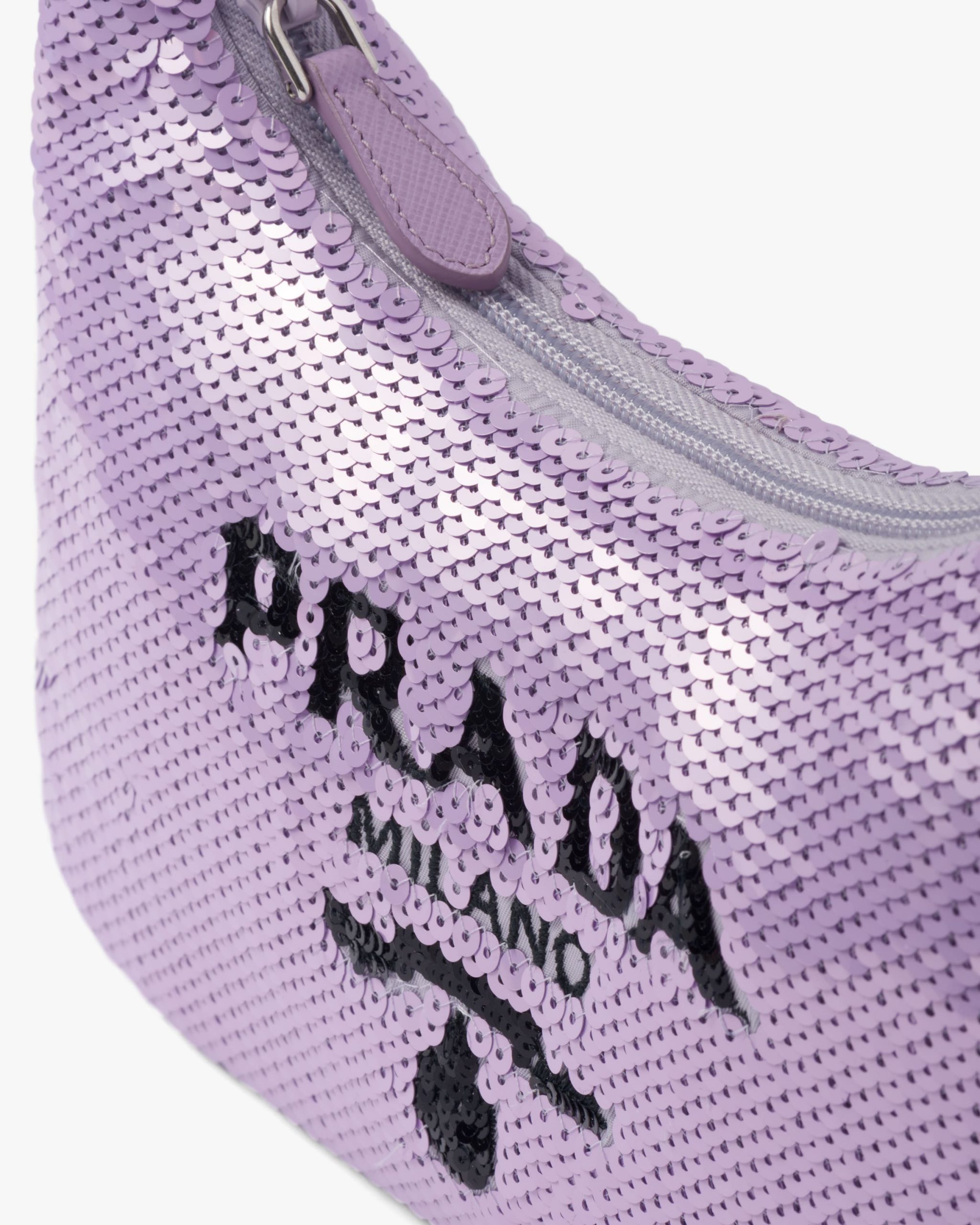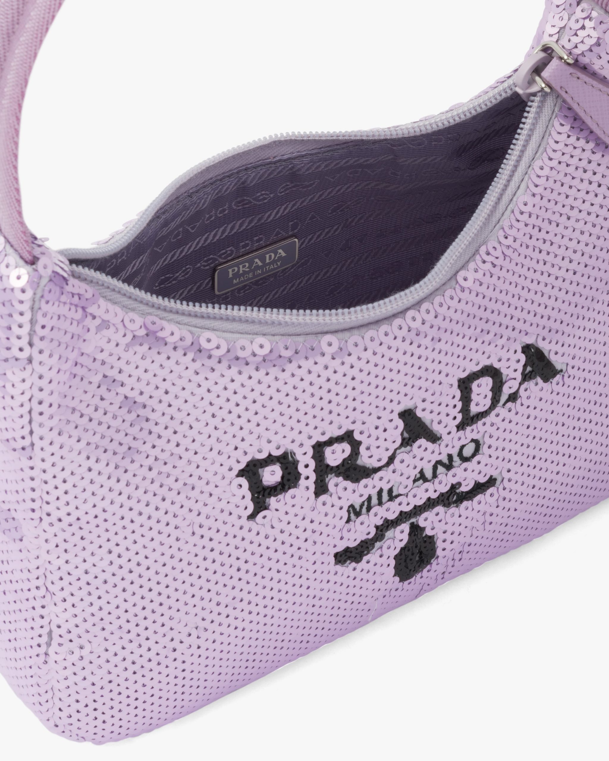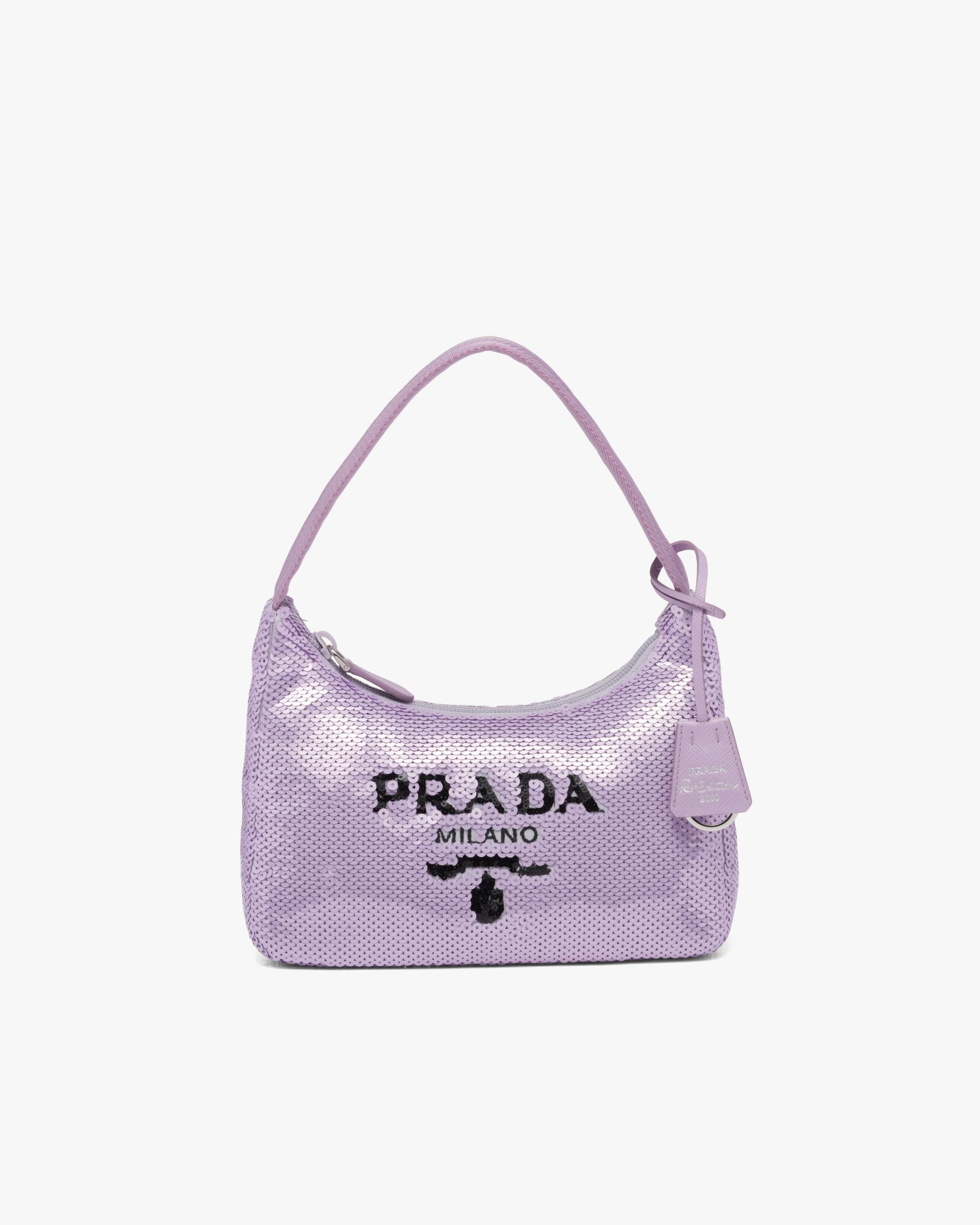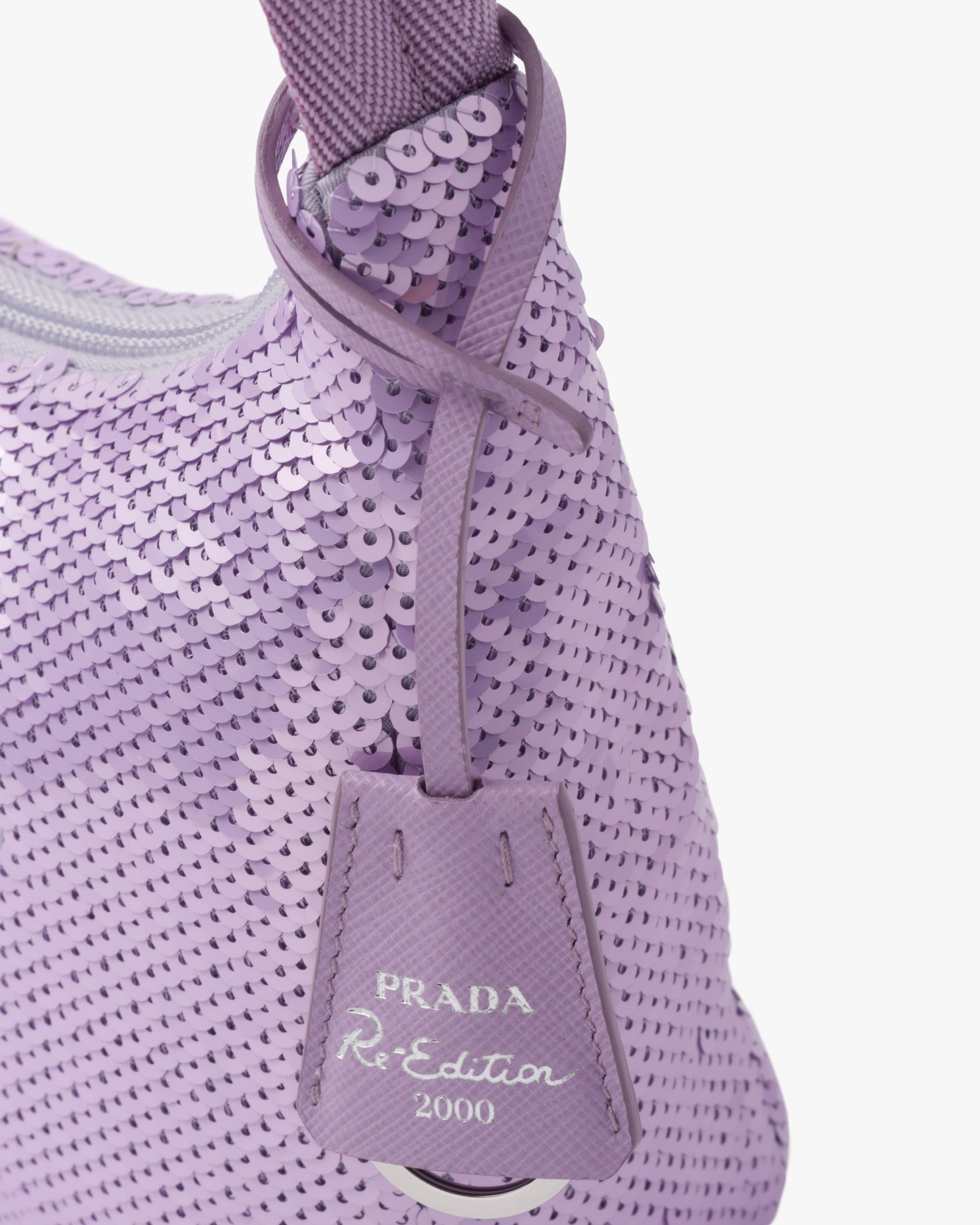 A new interpretation of an iconic Prada style, the Re-Edition 2000 mini-bag is covered with all-over sequins that create a play of light and iridescent glimmers on the surface. The design is made of innovative Re-Nylon, produced from recycled, purified plastic materials collectsed in the ocean, fishing nets, and textile fibers. The accessory with zipper closure and woven tape handle is enhanced with the distinctive enameled metal triangle logo2.