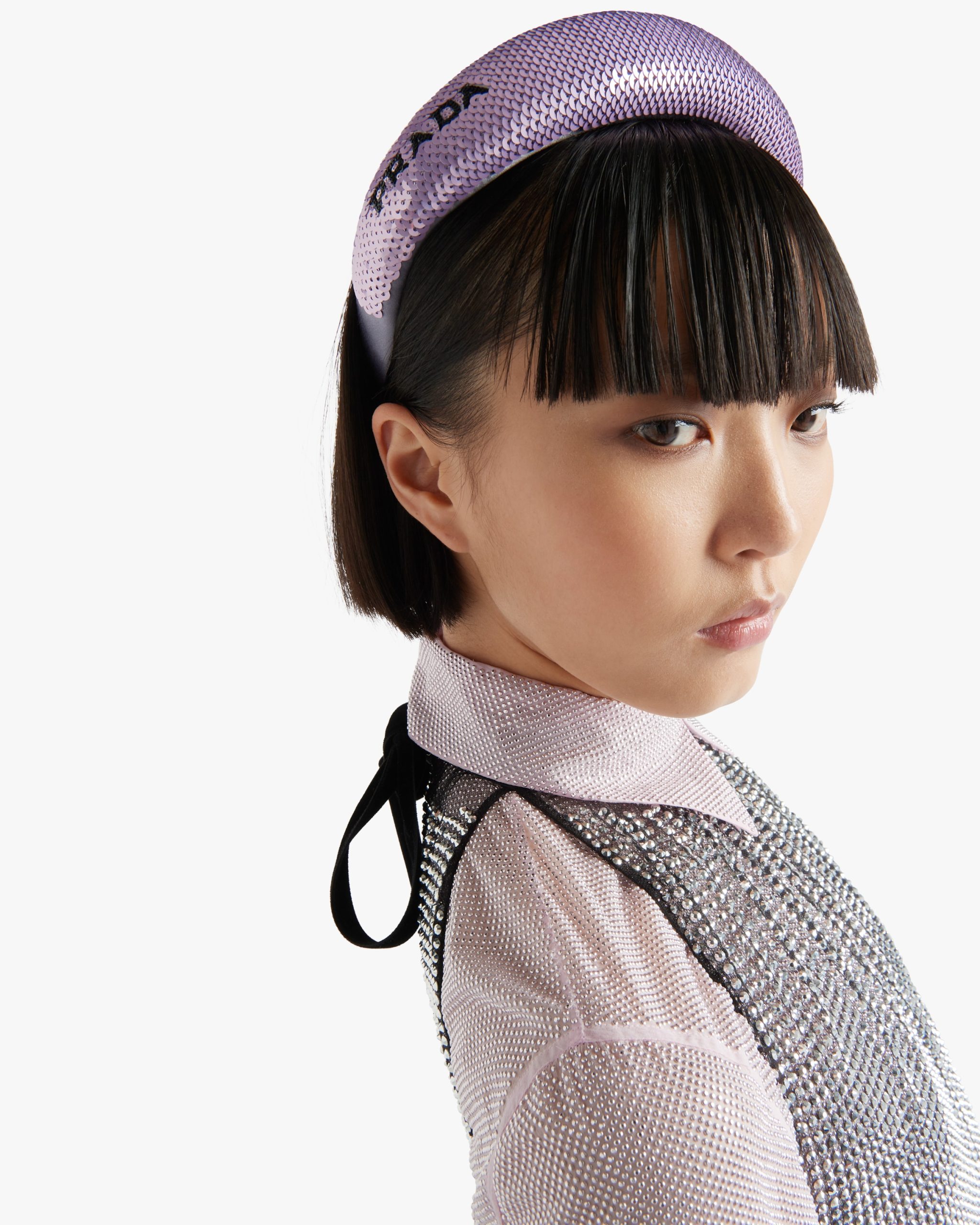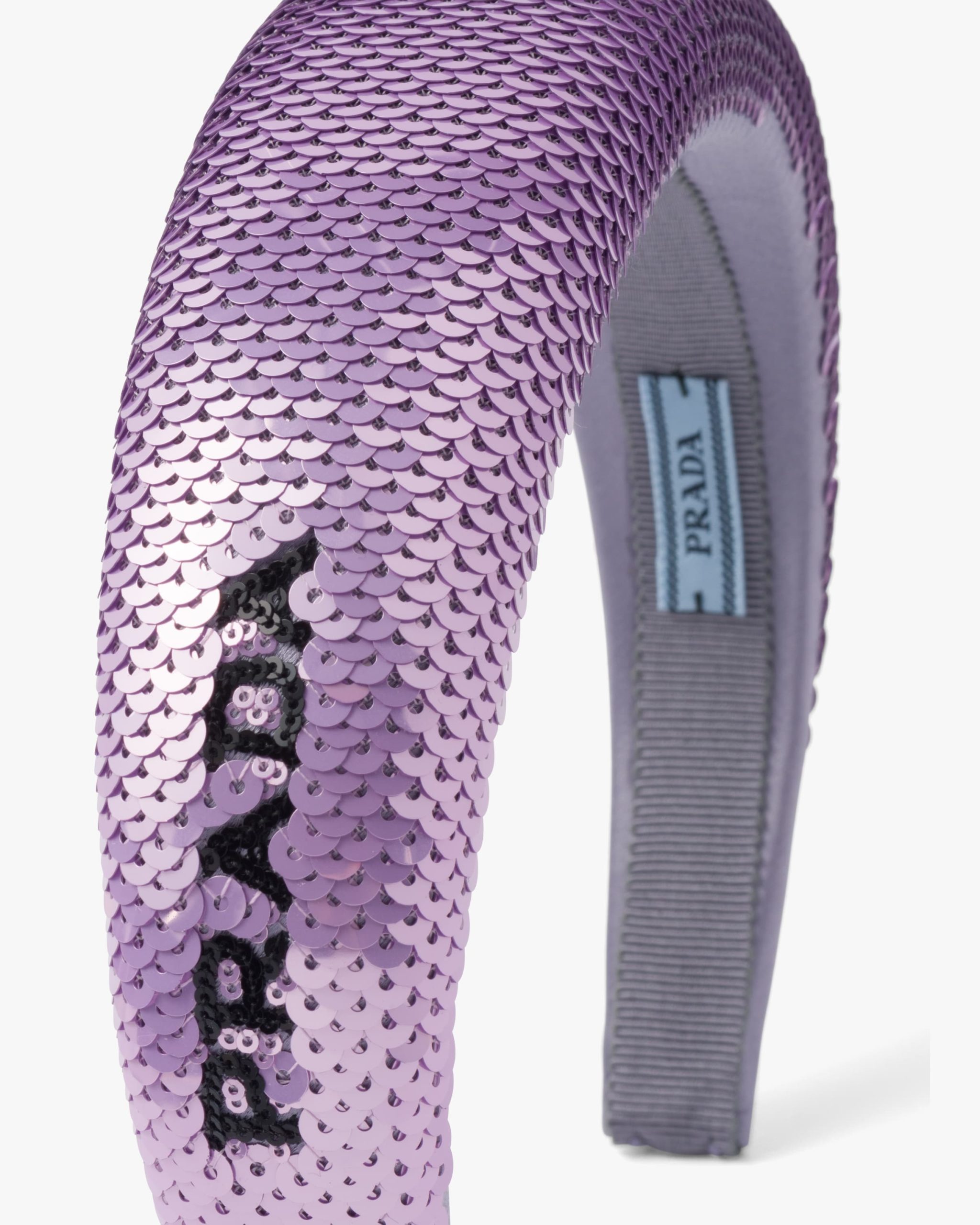 The puffy maxi headband, a sophisticated and emblematic accessory of Prada collectsions, comes in a luxurious version entirely covered in sequins and decorated with the Prada lettering logo2 embroidered on the side for a contemporary touch.