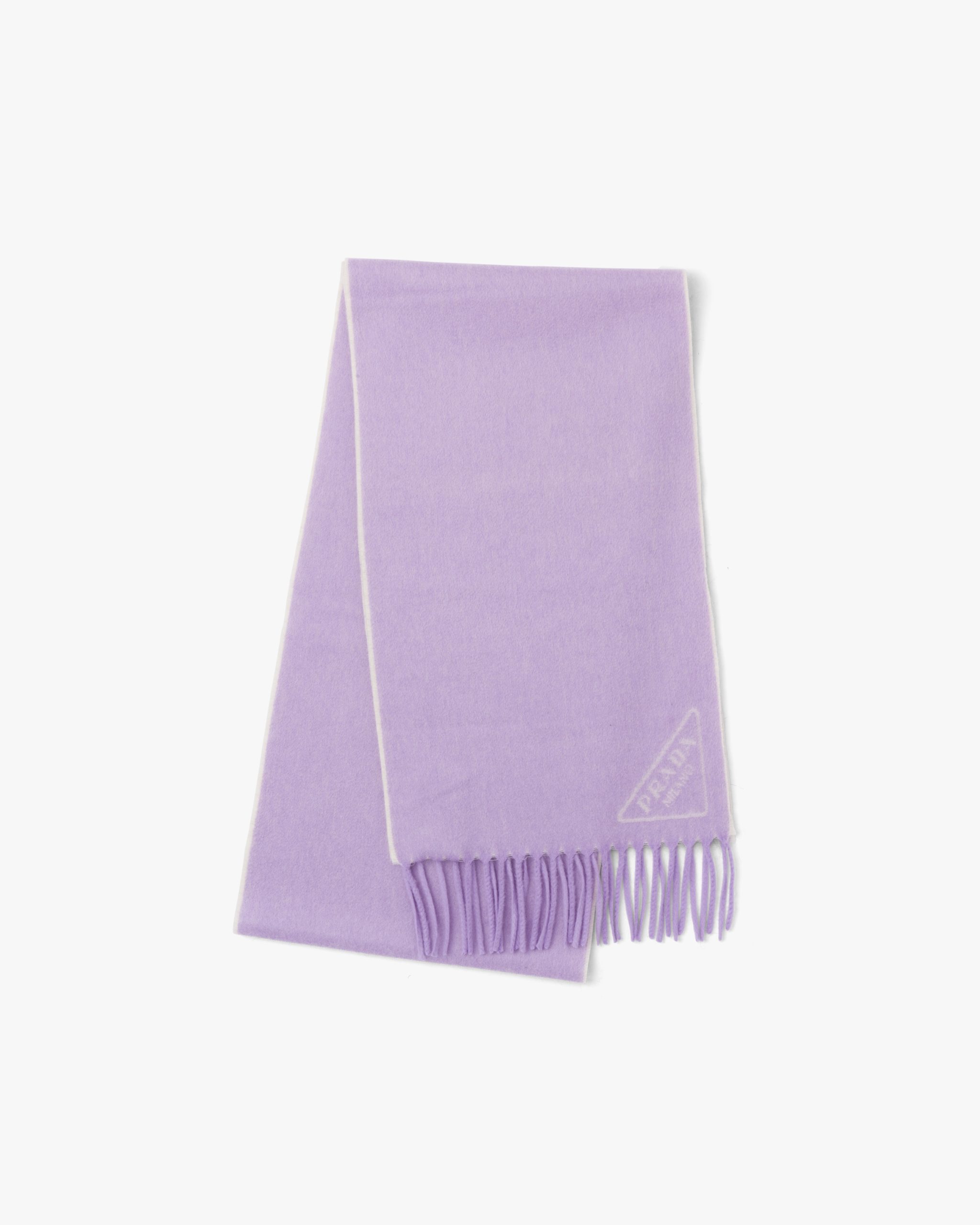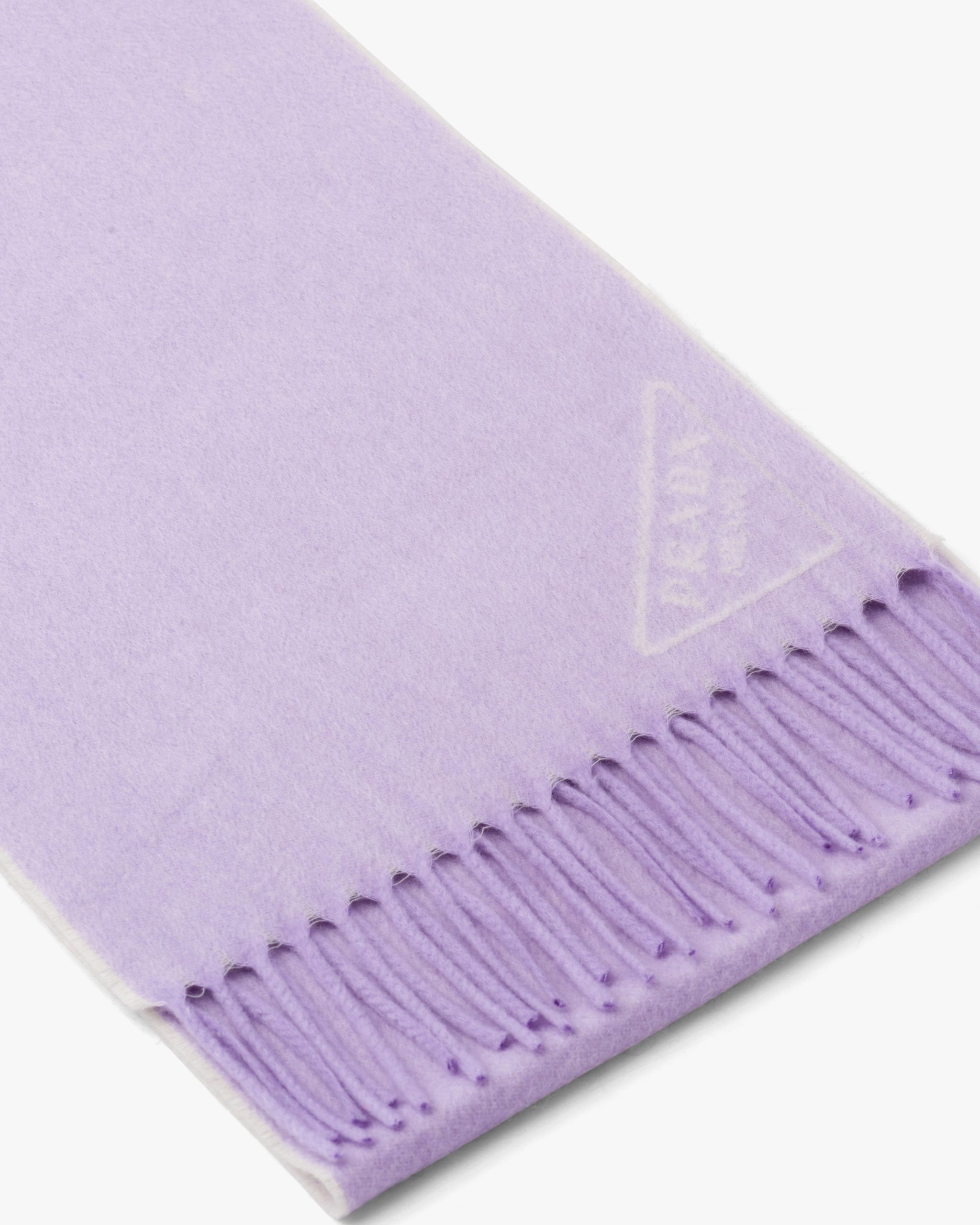 This soft double cashmere scarf is enhanced by Prada’s iconic lettering logo2 reinterpreted as a jacquard detail. Fringe trim on the edge completes the accessory.