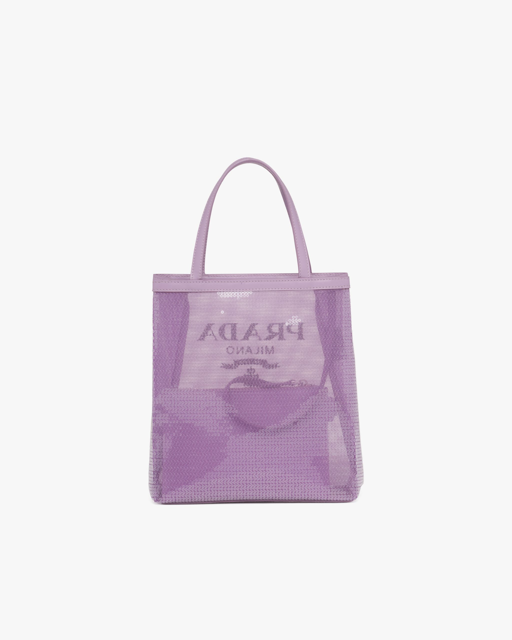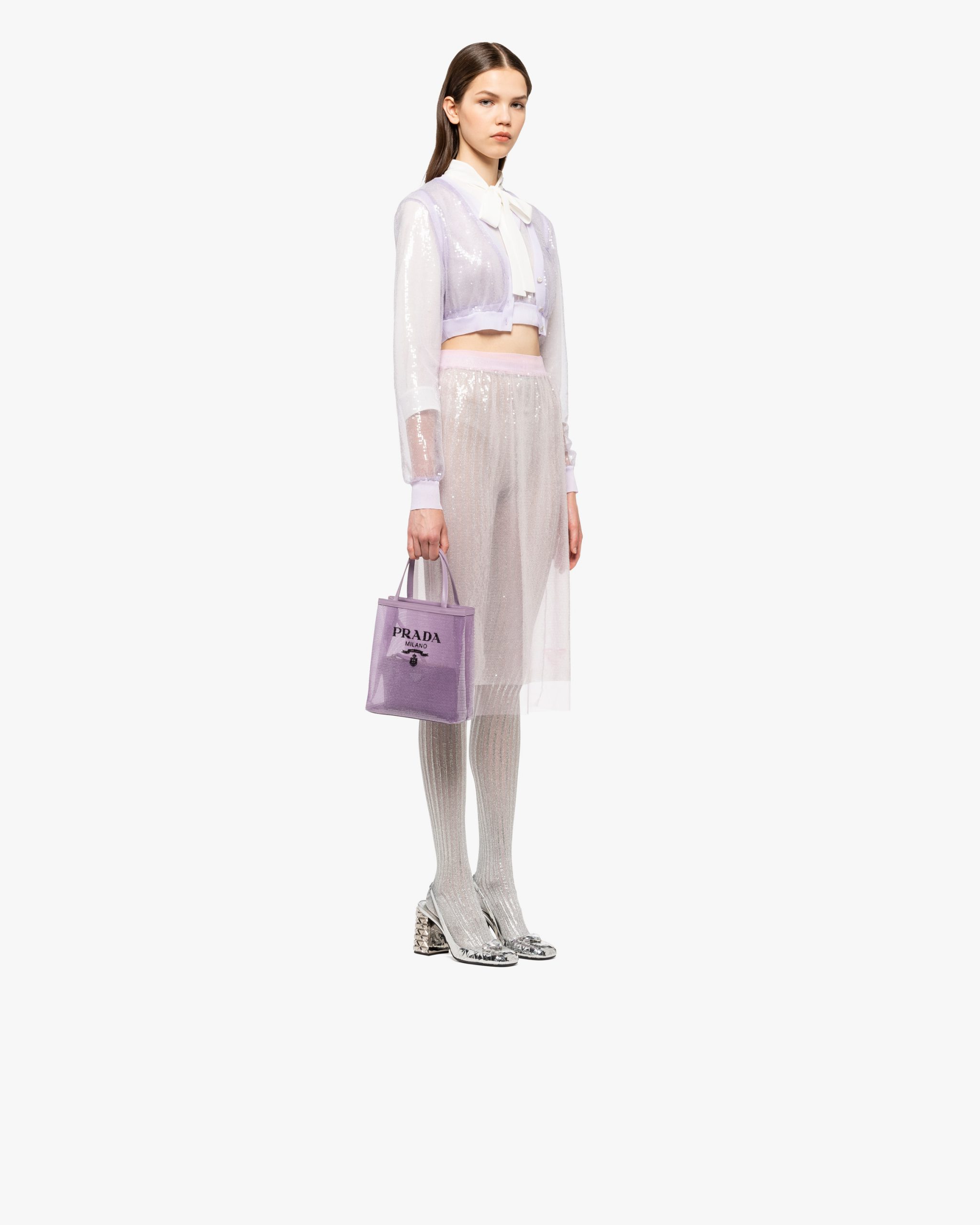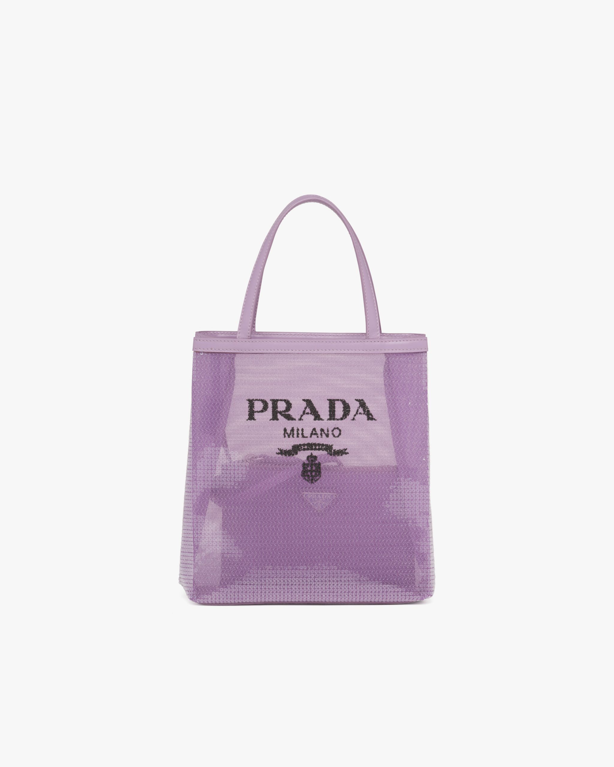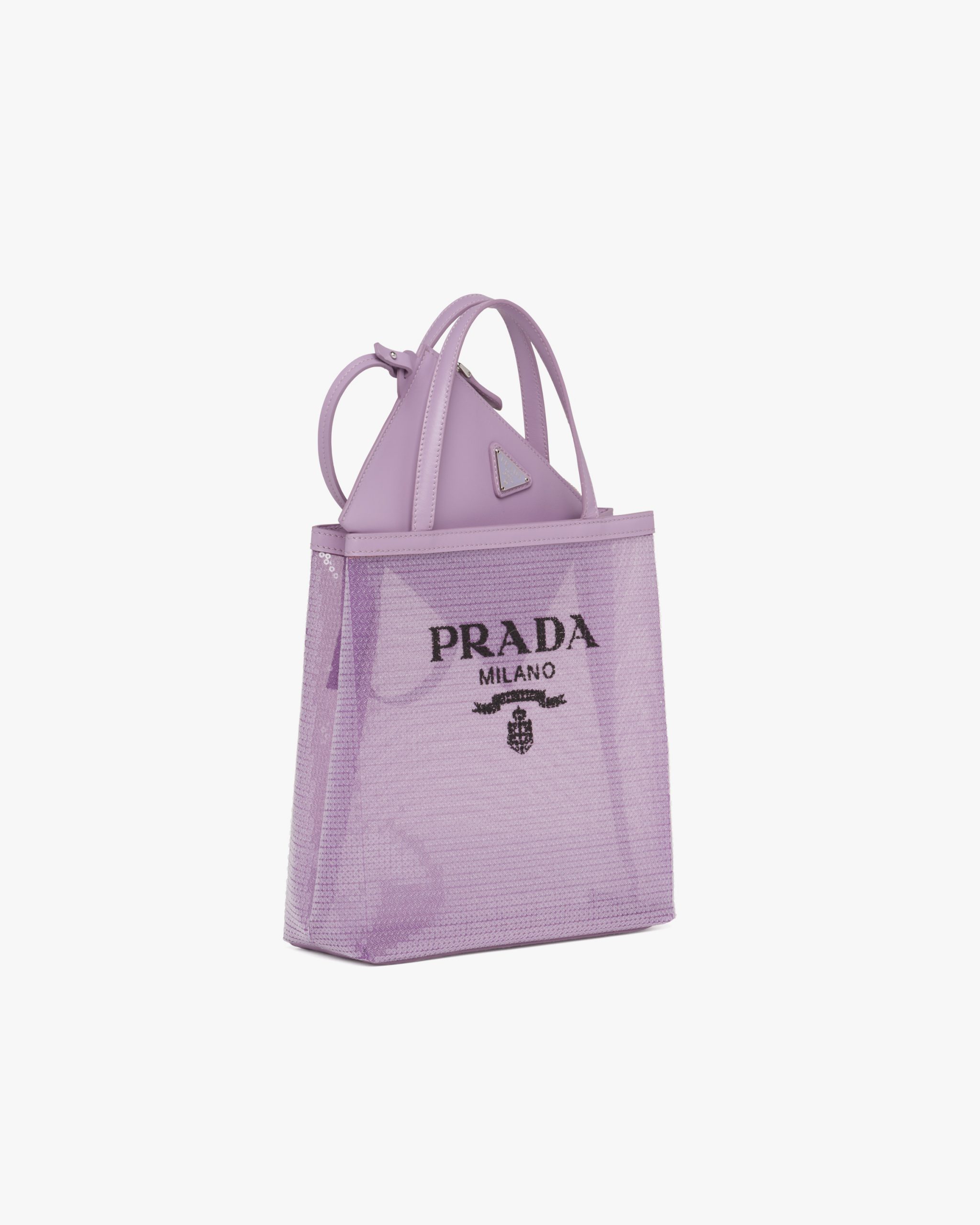 A contemporary soul and precious accents characterize this small tote bag entirely covered with sequins and embellished with the lettering logo2 printed on the front. Provided with a double handle and defined by its sleek design, the accessory with leather trim has a removable pouch inside.