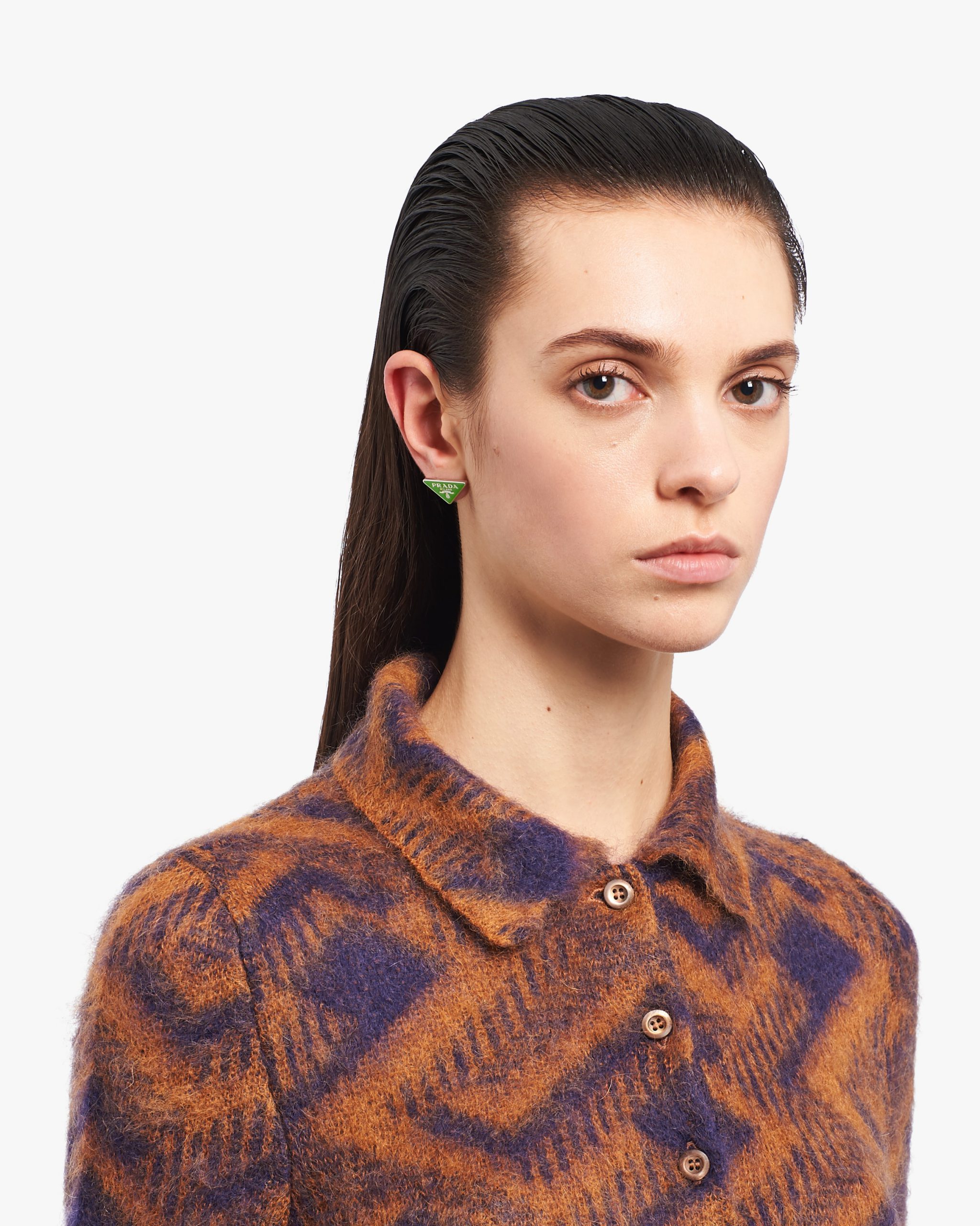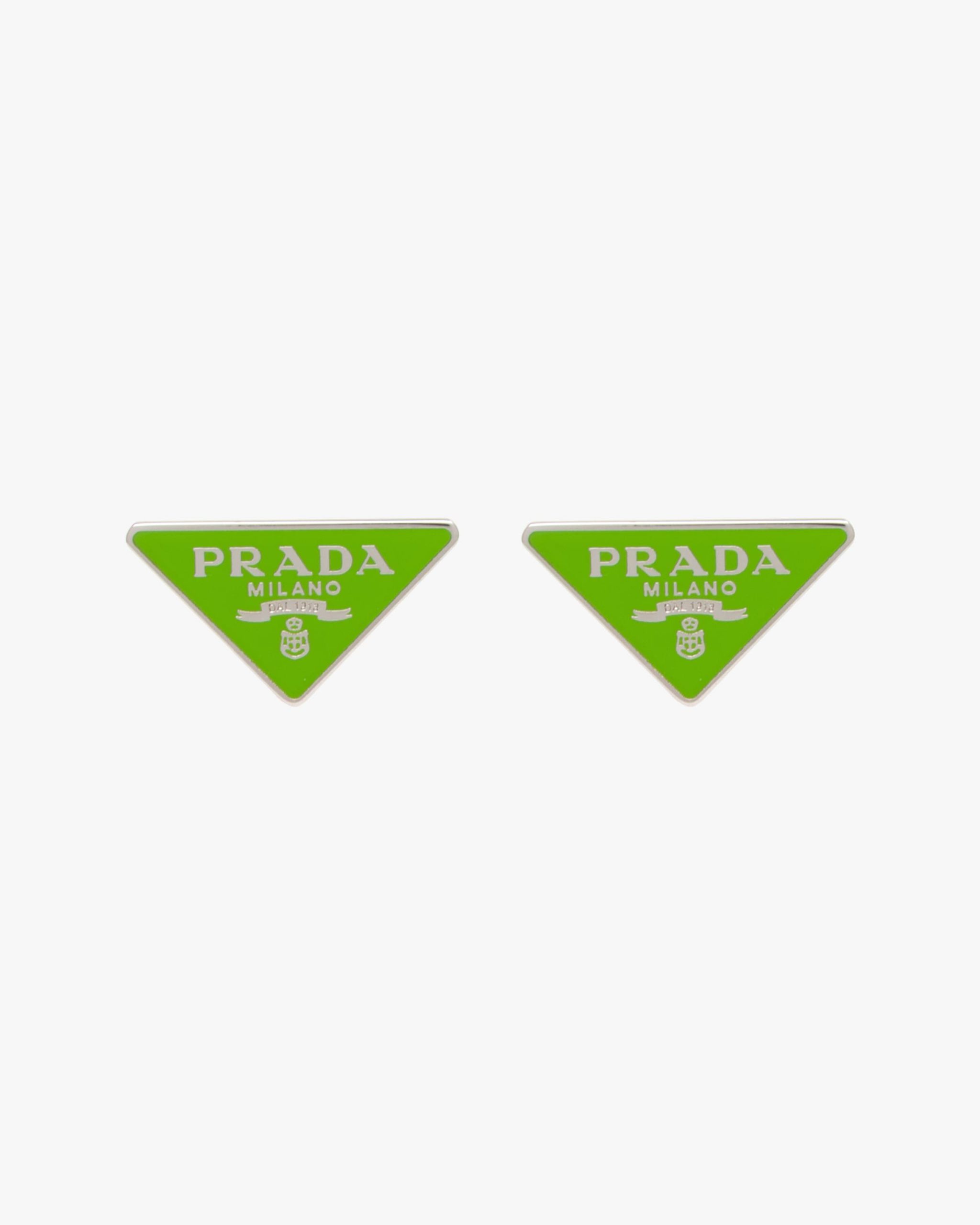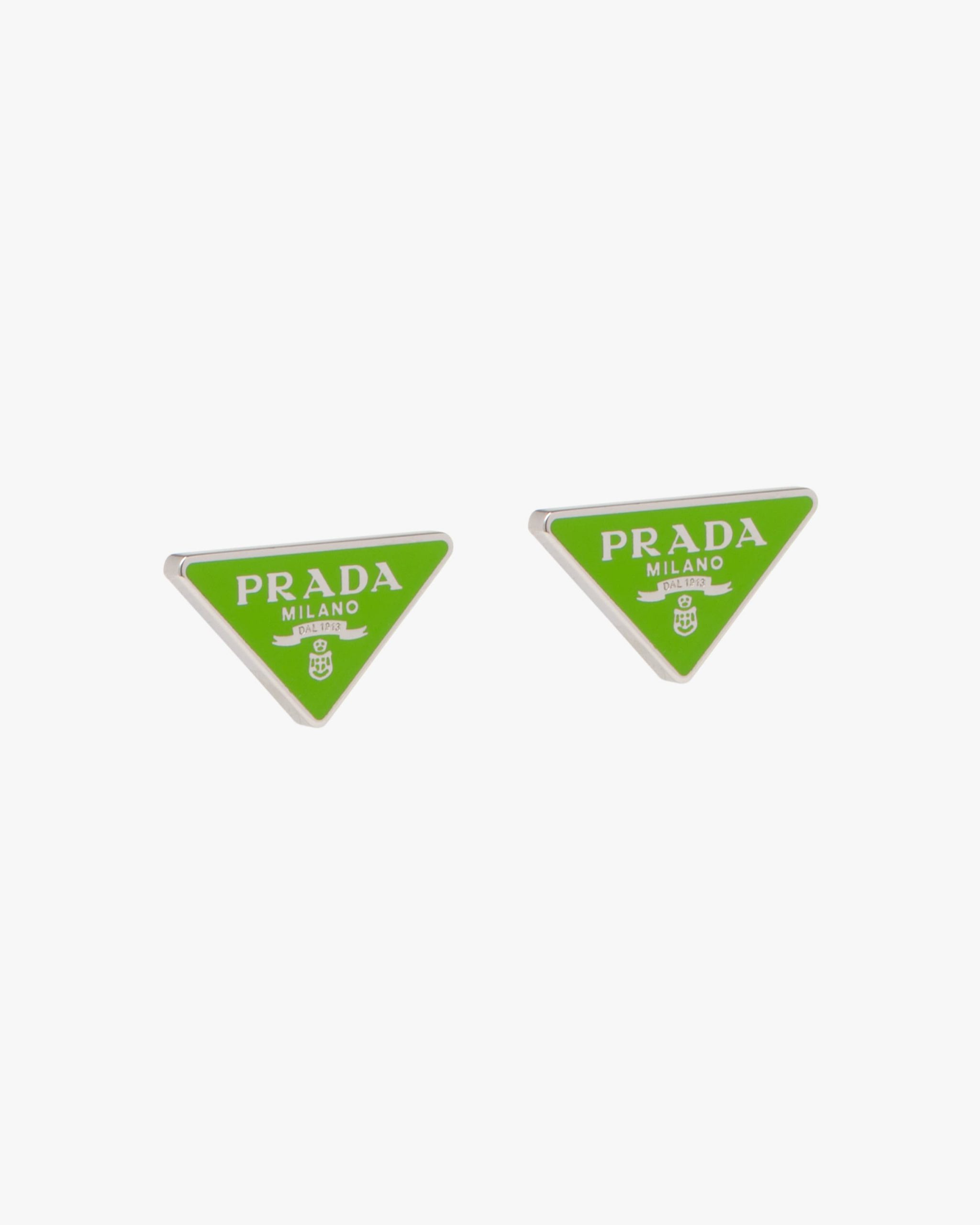 Prada’s historic symbol decorated with enamel defines this pair of earrings. Iconic and sleek, the triangle logo2 is the protagonist of a new line of jewelry made of 925 sterling silver that reinterprets punk influences in a modern way.