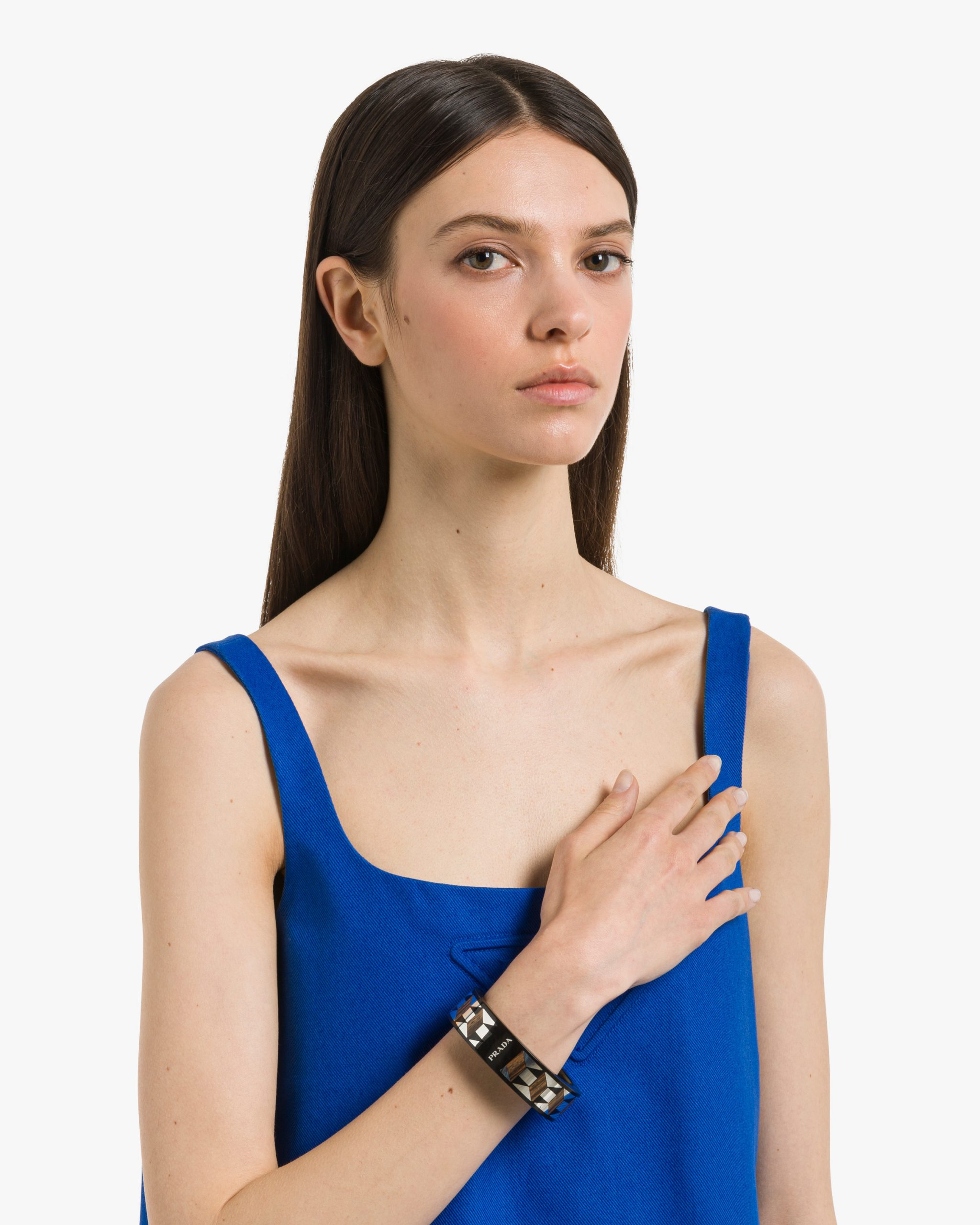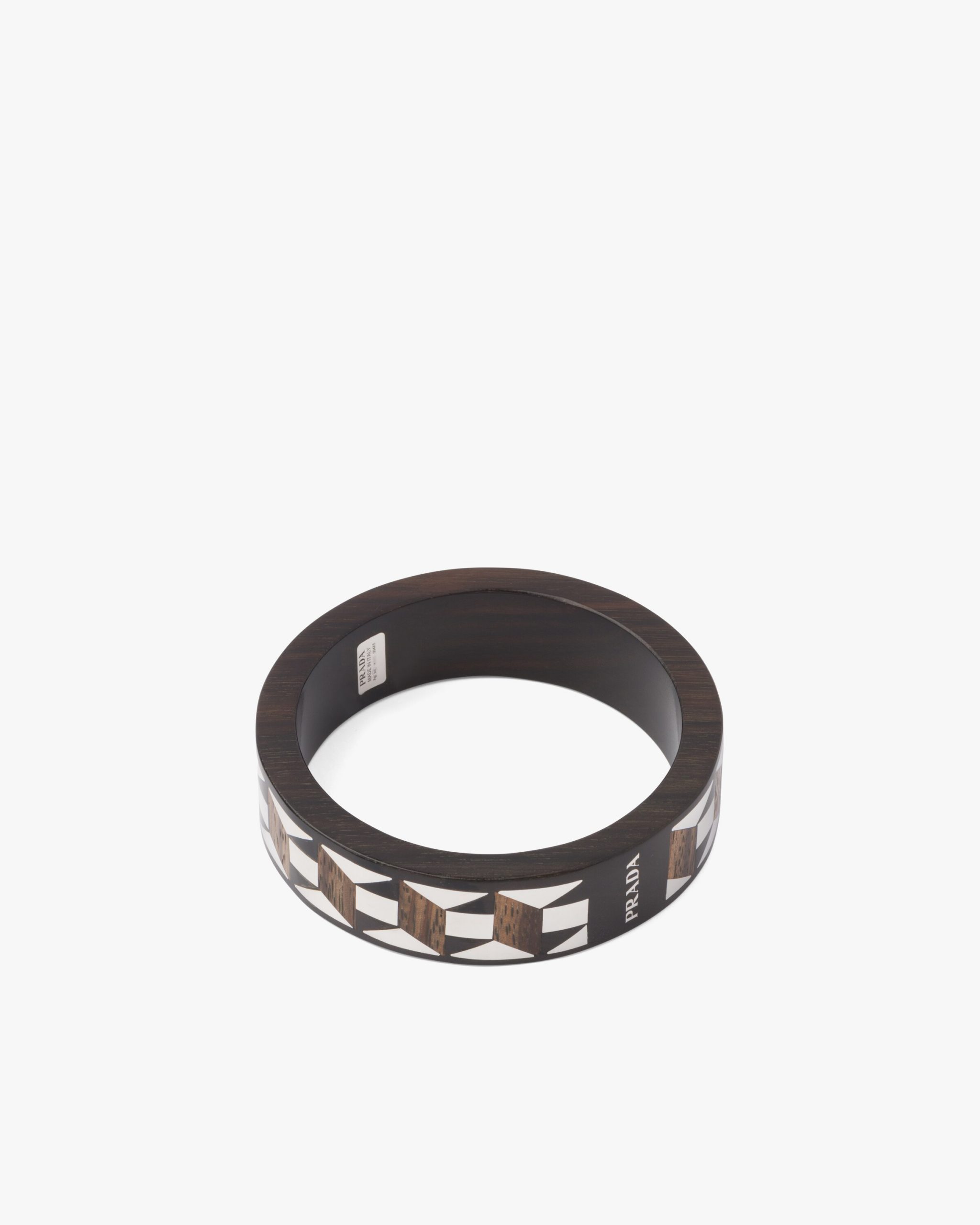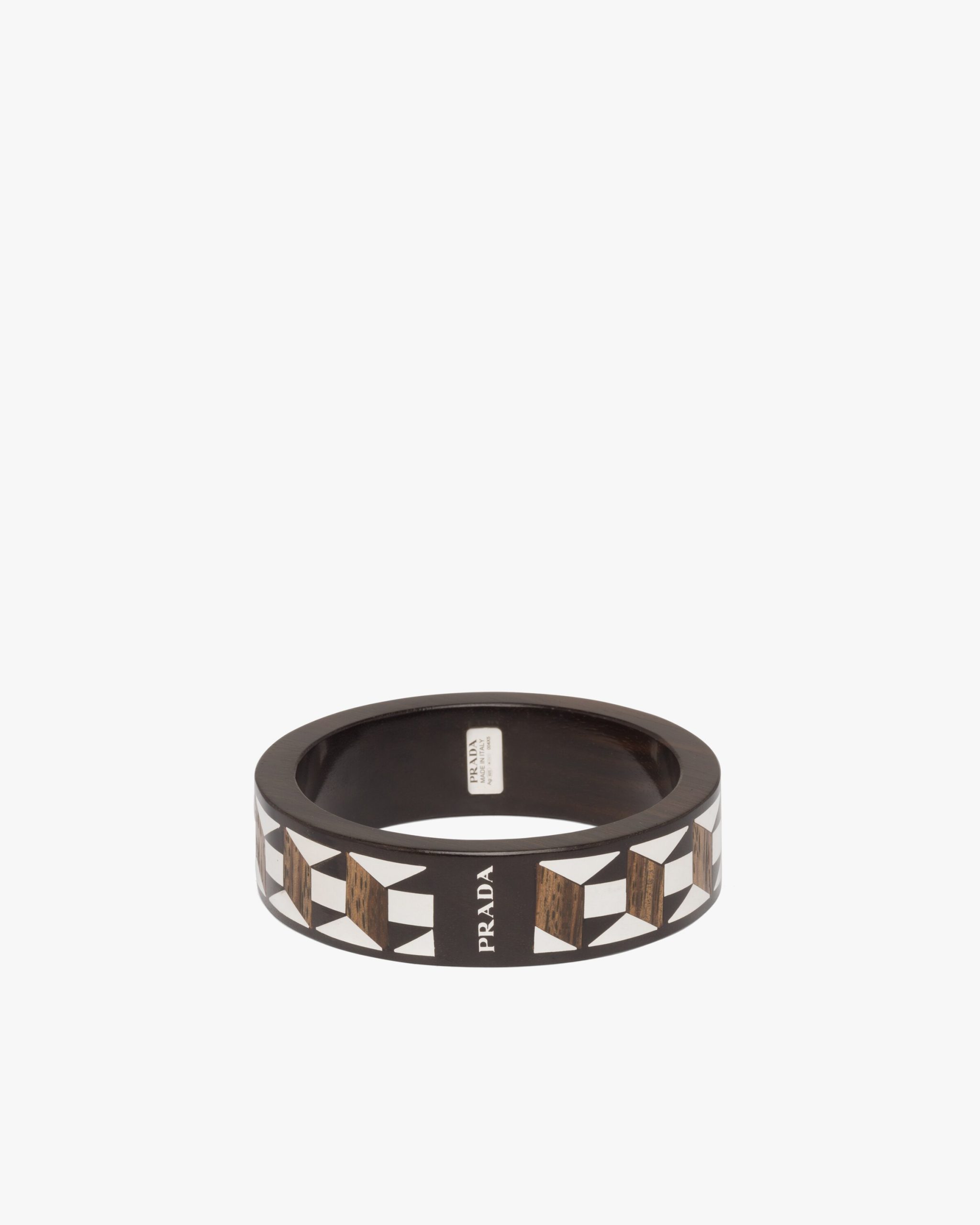 Geometric shapes and precious contrasts in materials and textures animate this cuff bracelet made of wood and silver. The bracelet with sophisticated, modern allure is decorated with the lettering logo2 in a contrasting color.