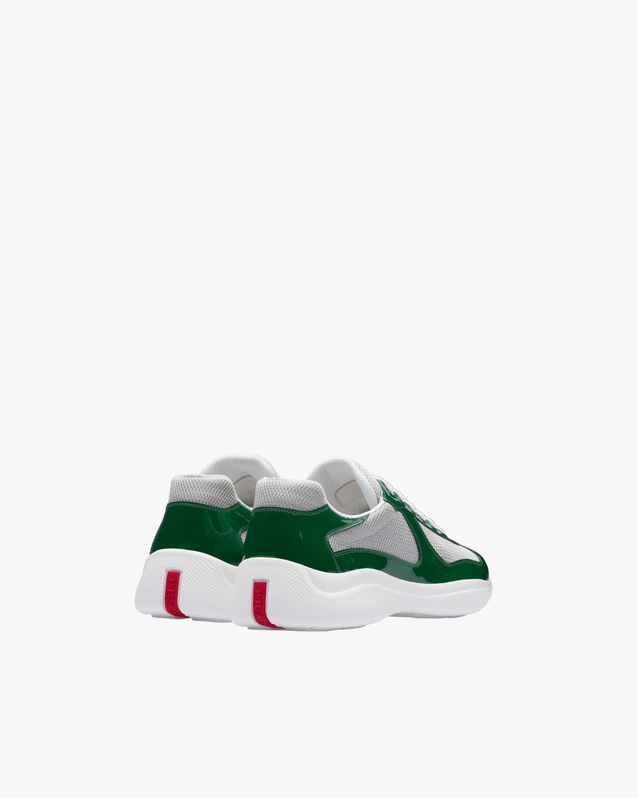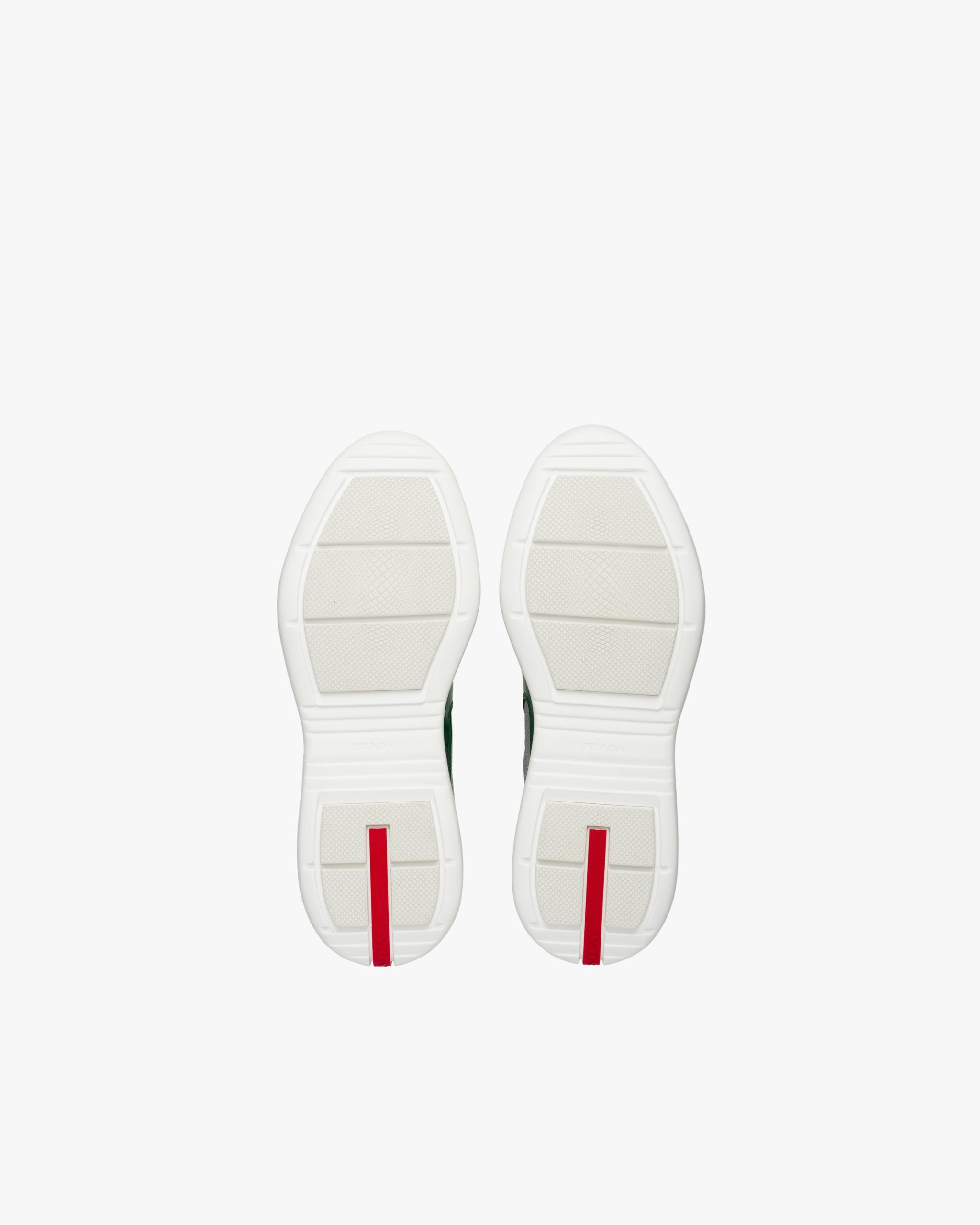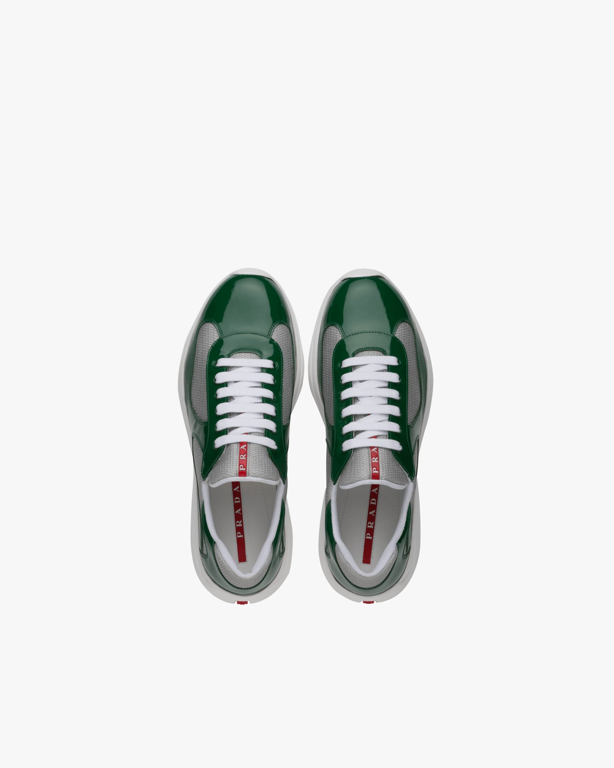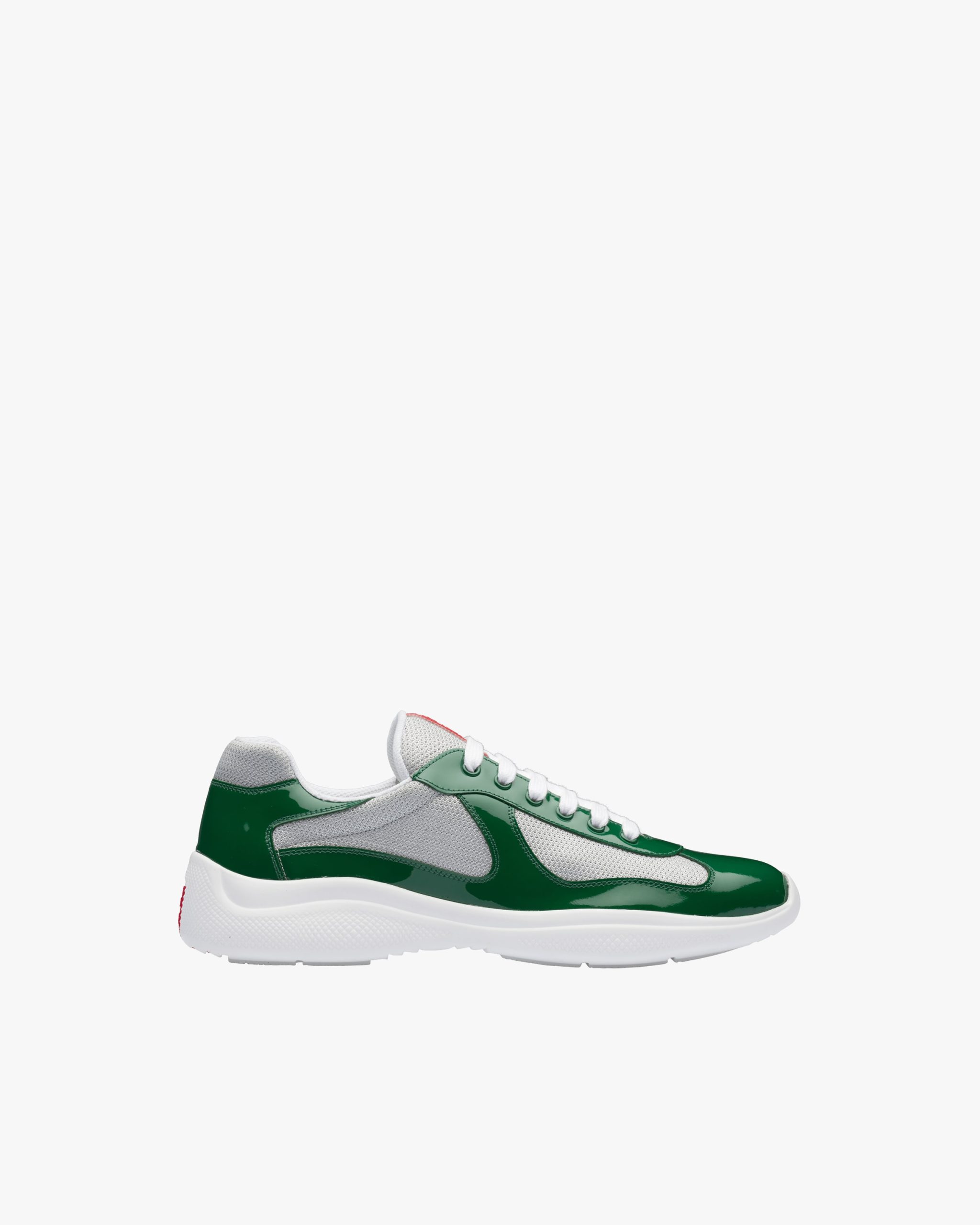 These patent leather sneakers with bike fabric inserts are inspired by an iconic aesthetic. The unmistakable Prada Linea Rossa logo2 on the tongue and sole enhances the design.
