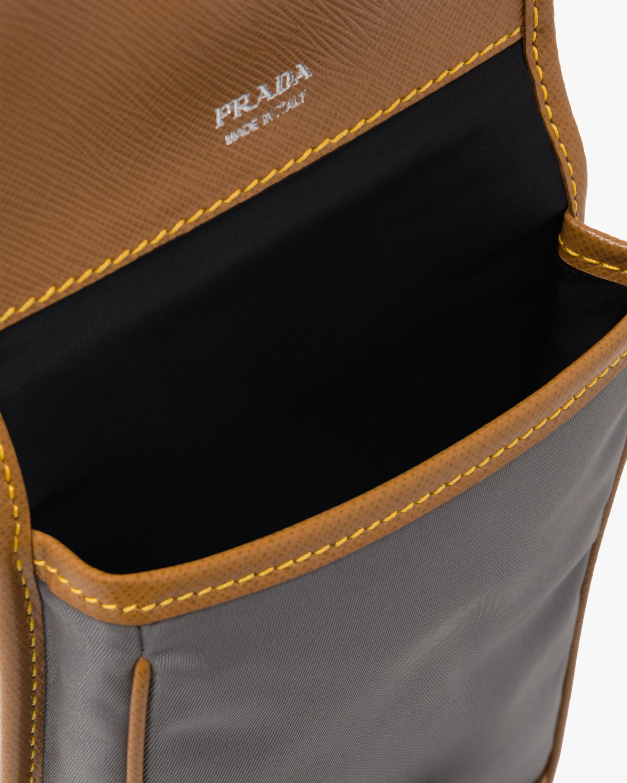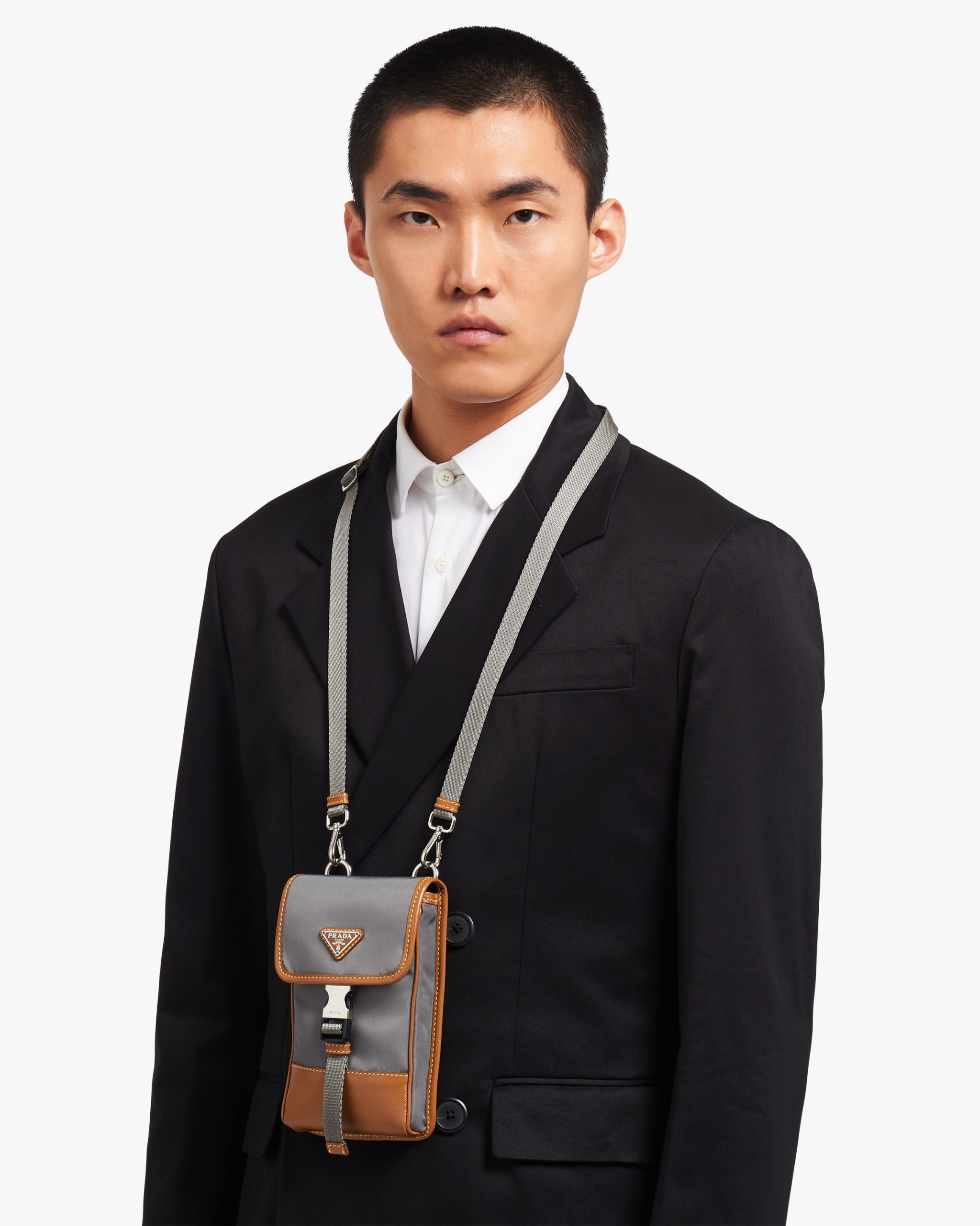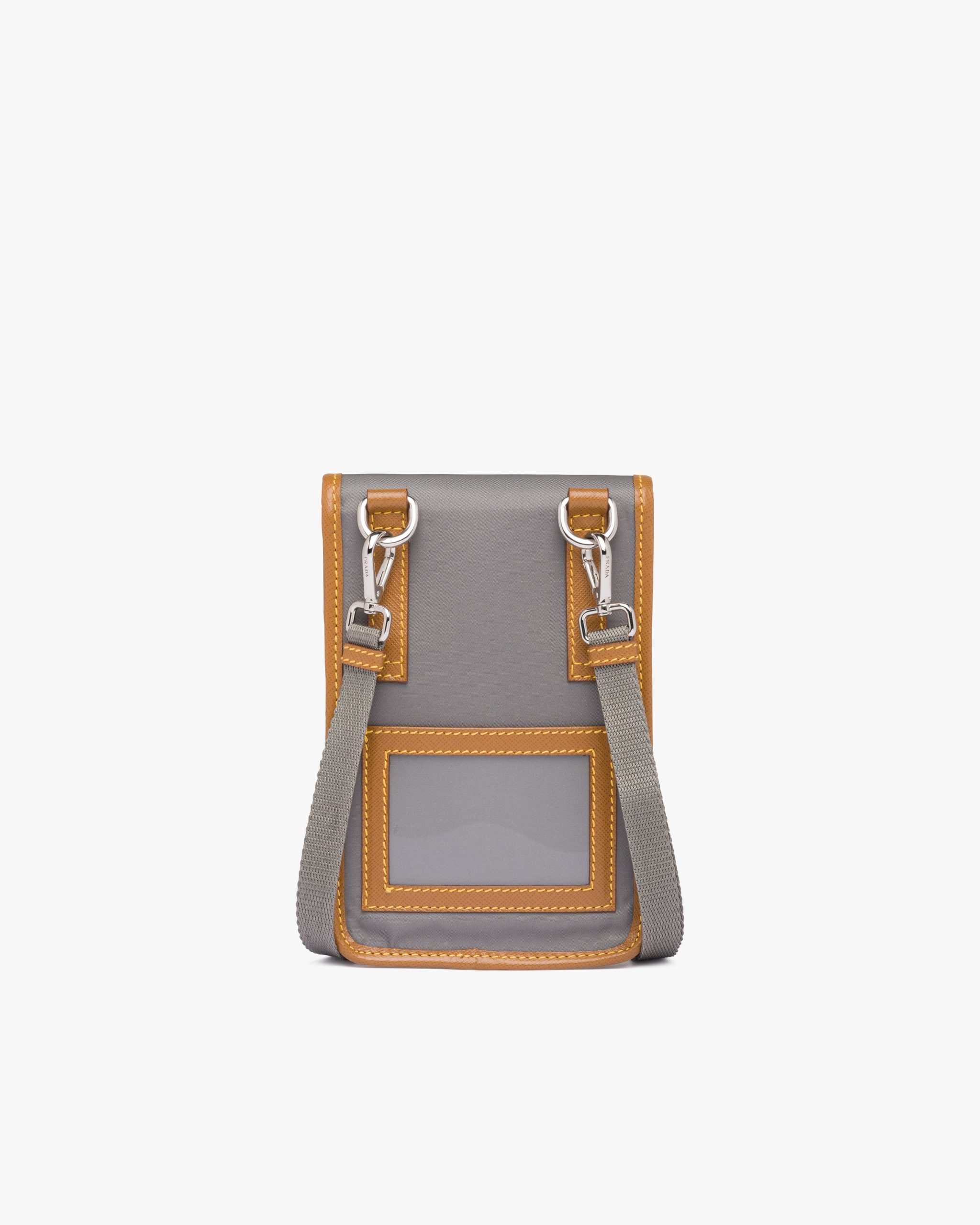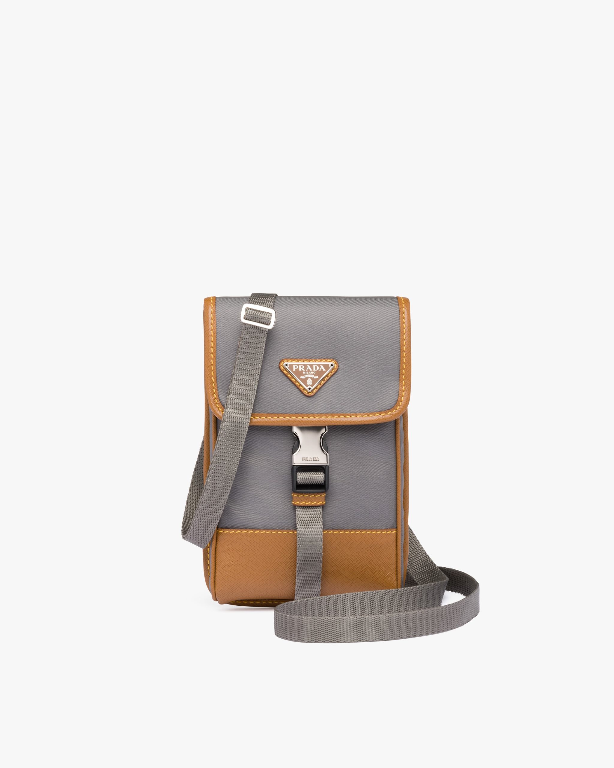 This nylon mobile phone case with detachable shoulder strap has Saffiano leather trim. The design of the accessory is completed by the metal side-release buckle and enameled triangle logo2.