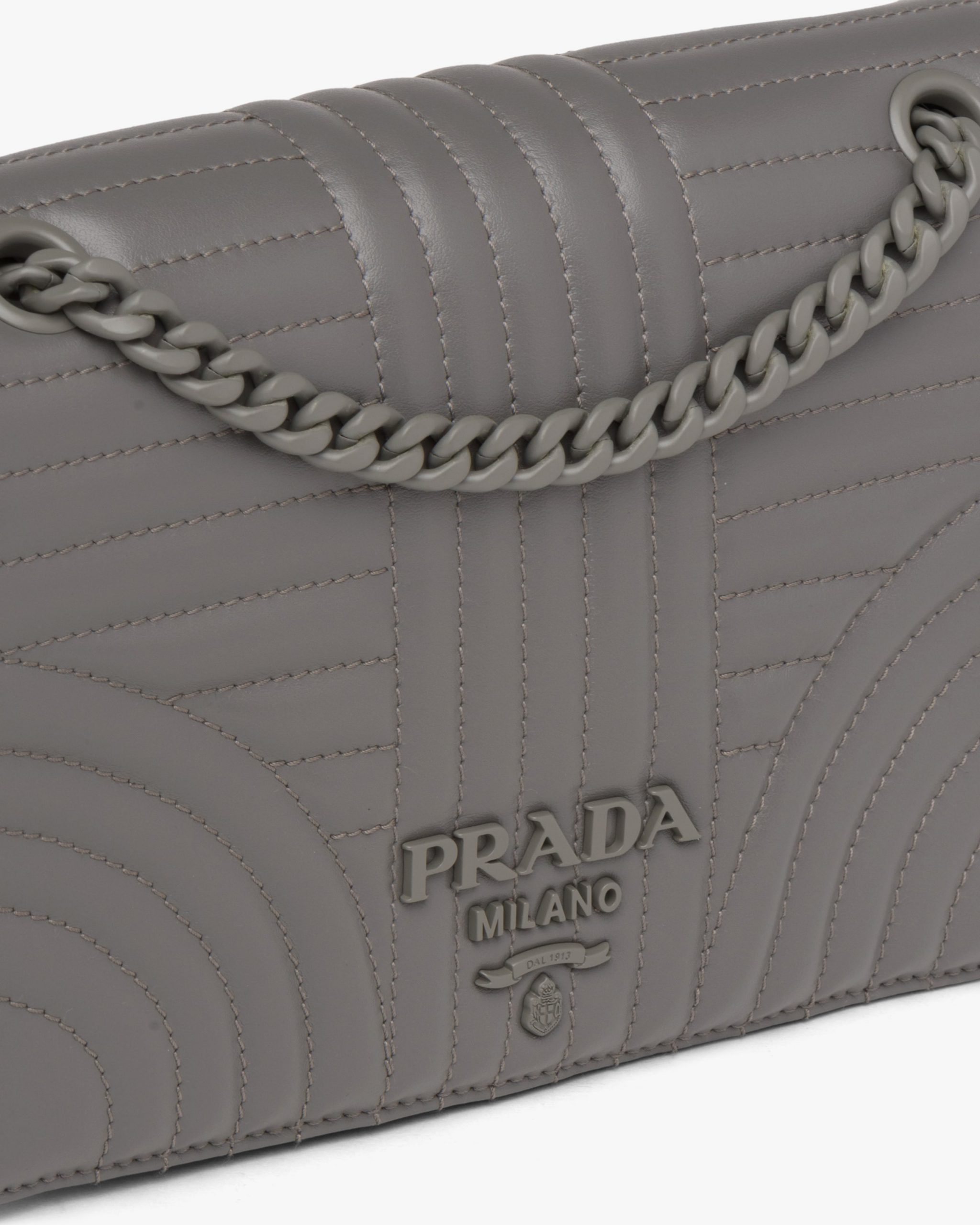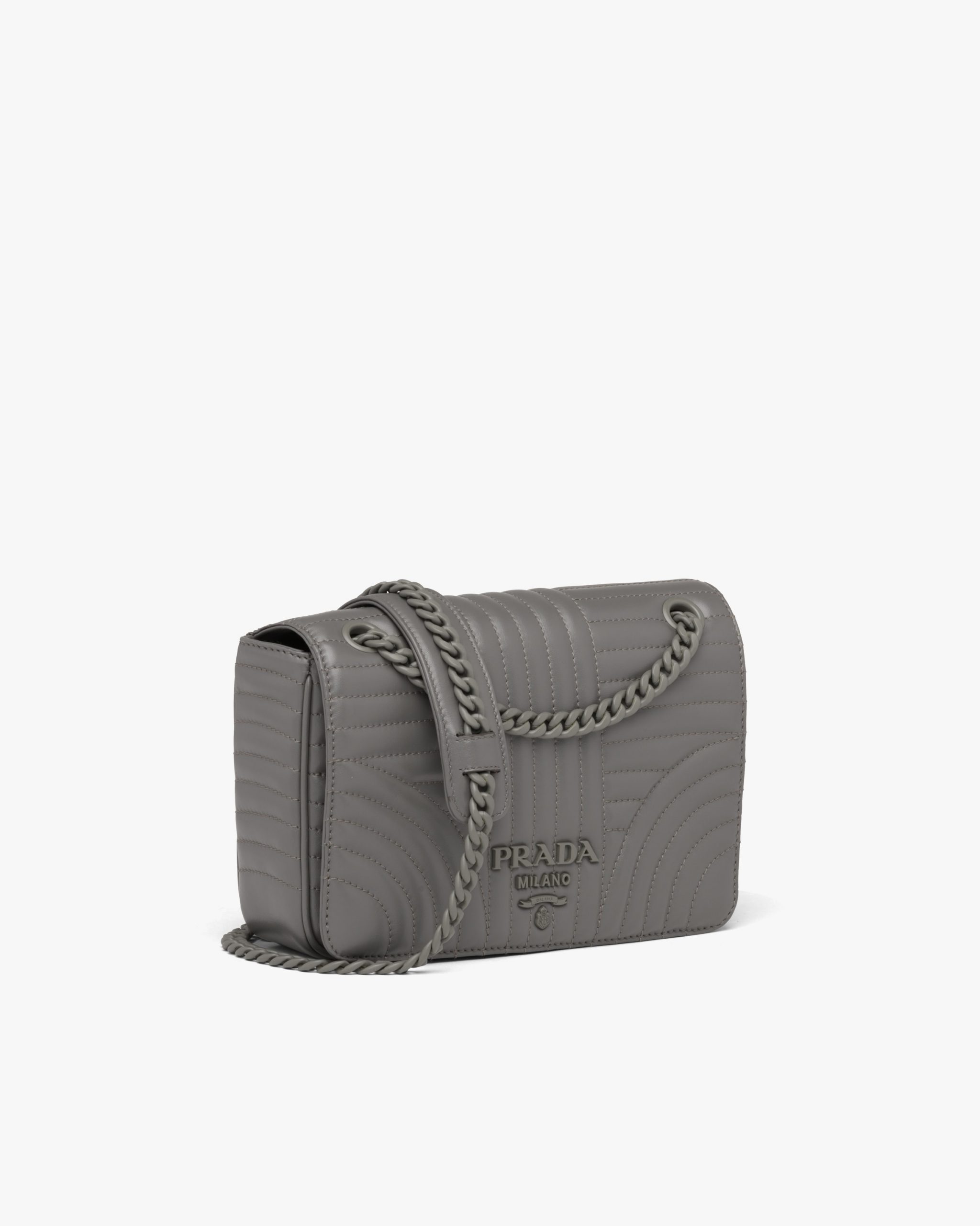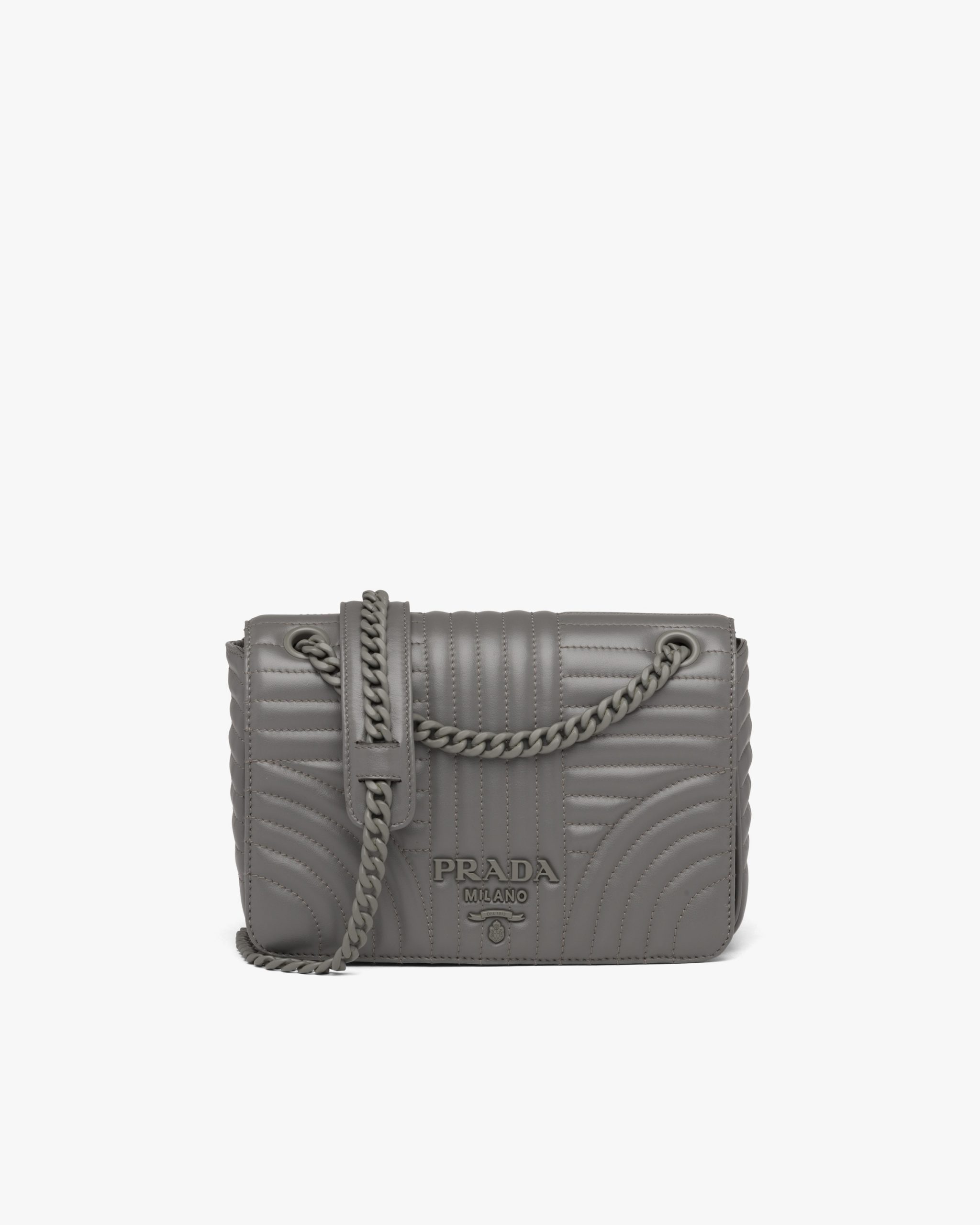 A refined stitched motif enhances the Prada Diagramme leather bag. The accessory comes with a metal chain shoulder strap with leather shoulder pad. A tonal metal logo2 decorates the bag.