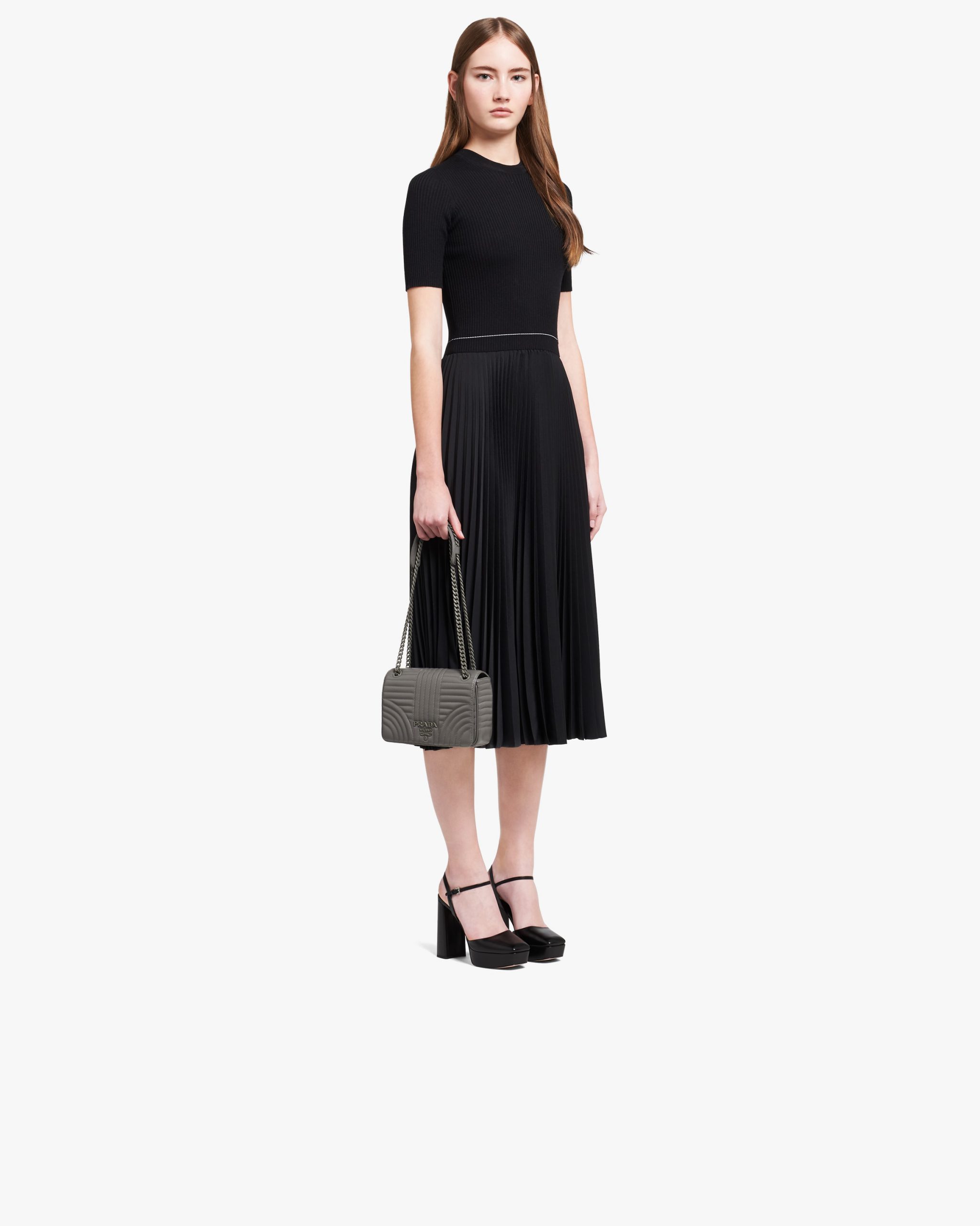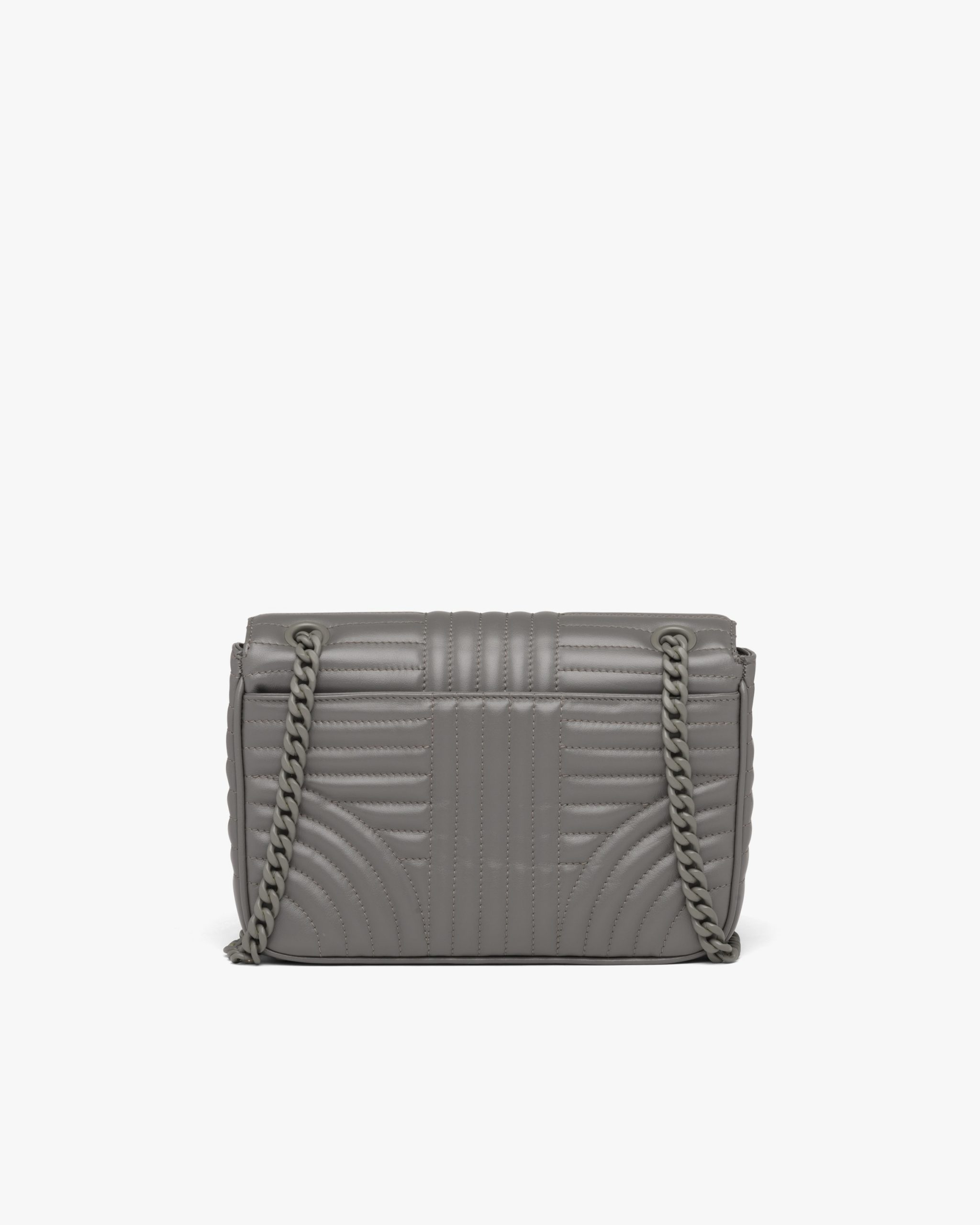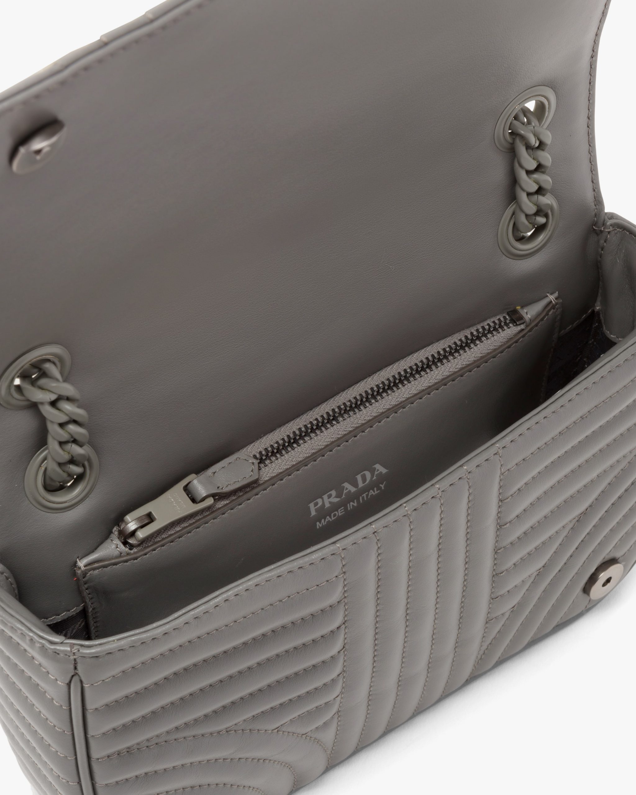A refined stitched motif enhances the Prada Diagramme leather bag. The accessory comes with a metal chain shoulder strap with leather shoulder pad. A tonal metal logo2 decorates the bag.