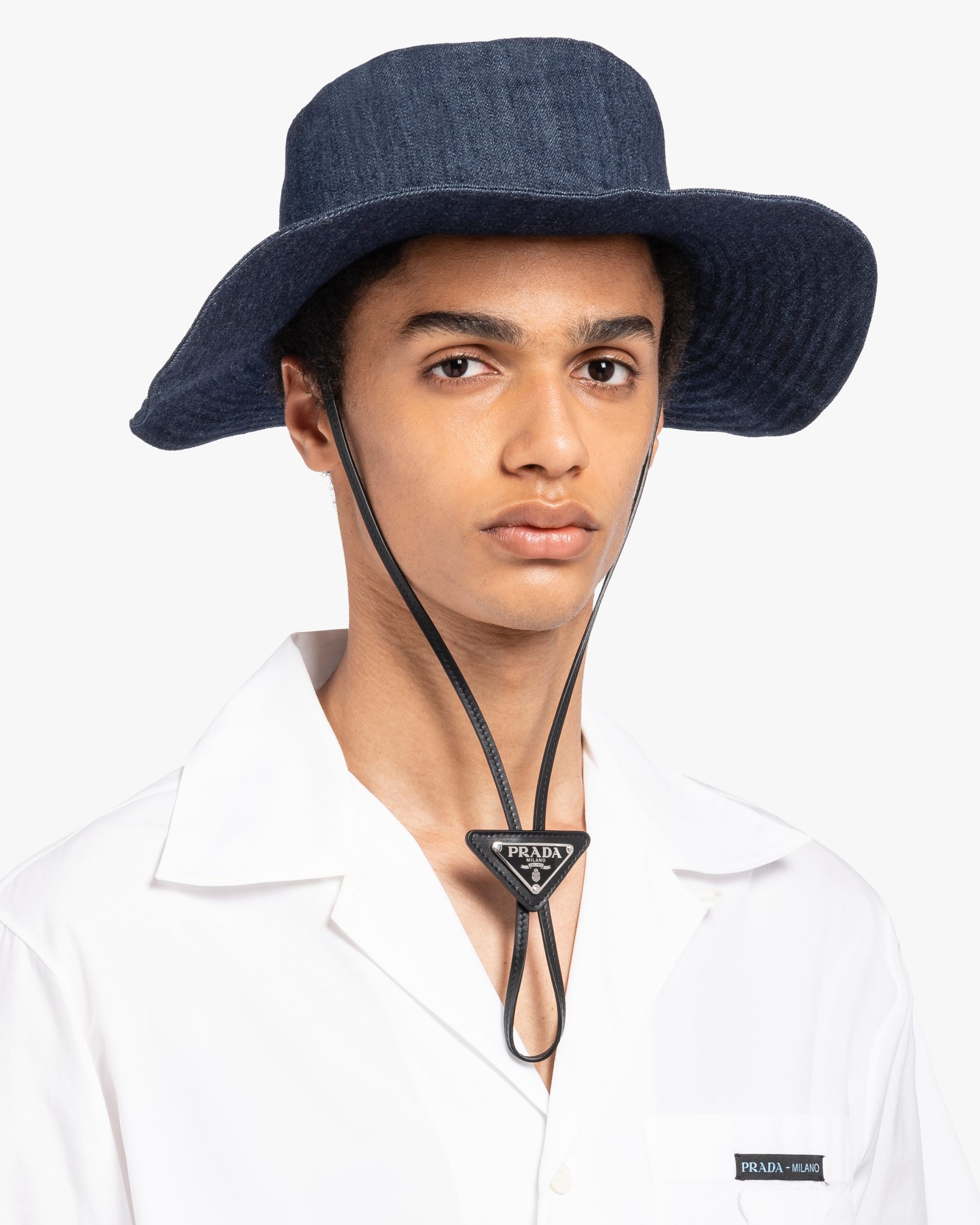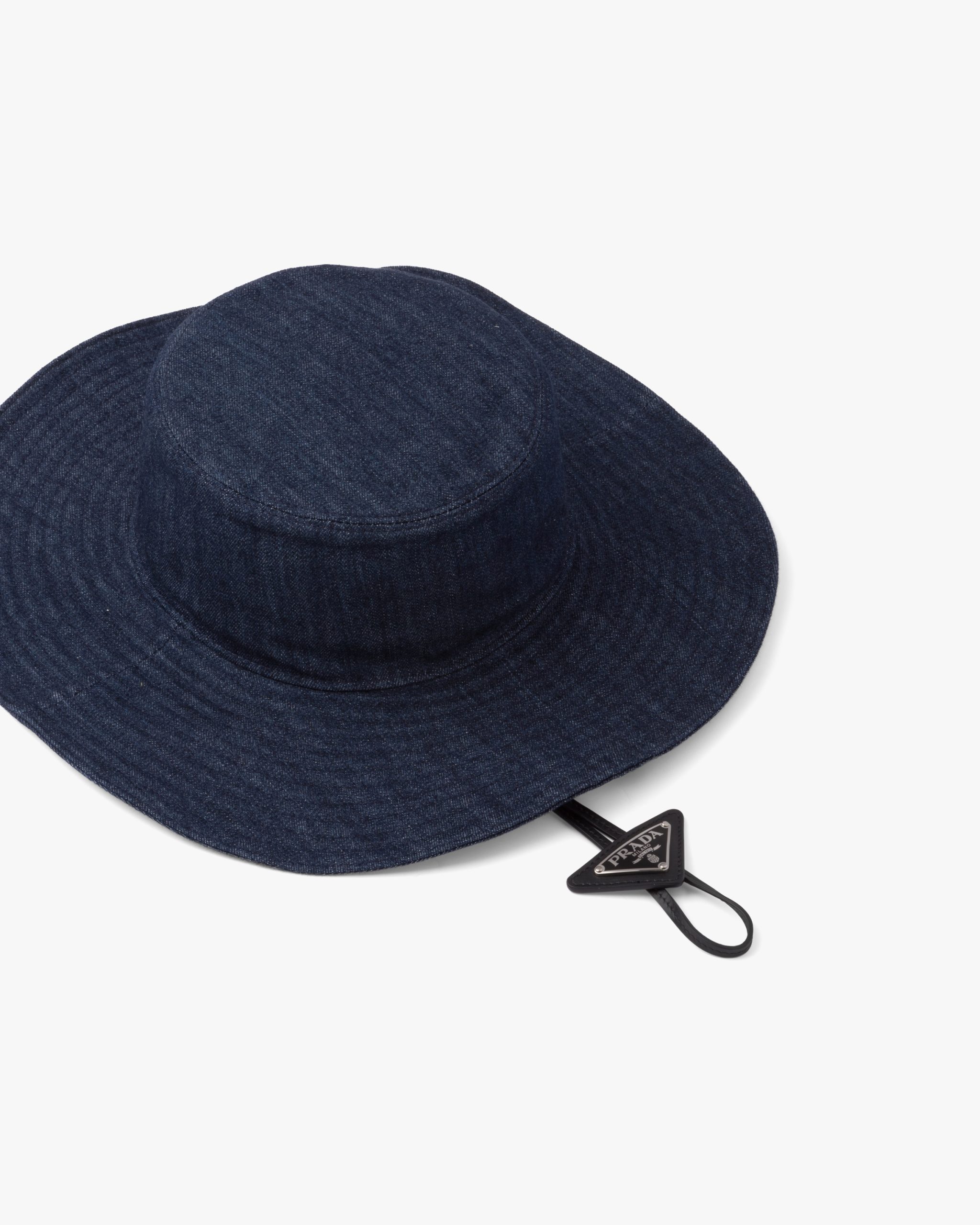A cult fabric for streetwear and casual apparel, denim is reinterpreted by Prada on new garments and accessories with contemporary spirit like this wide-brimmed hat with adjustable cord under the chin. The enameled metal triangle logo2 accents the design with an iconic note.