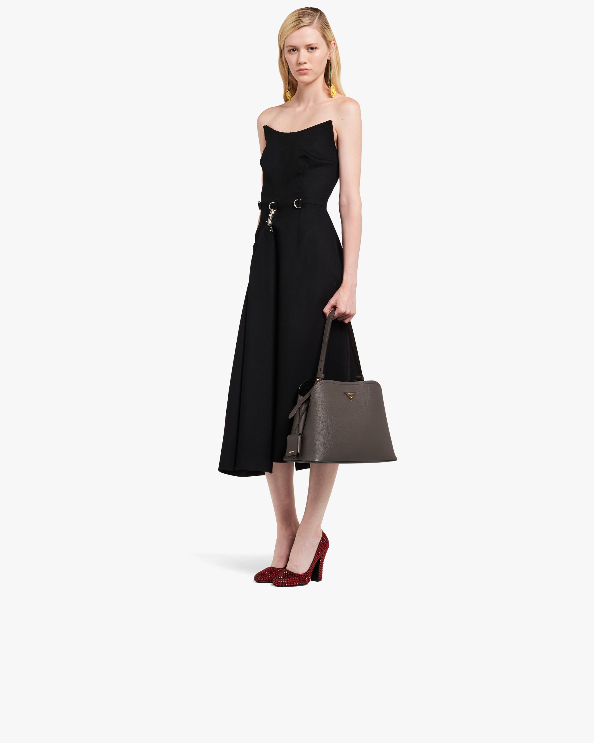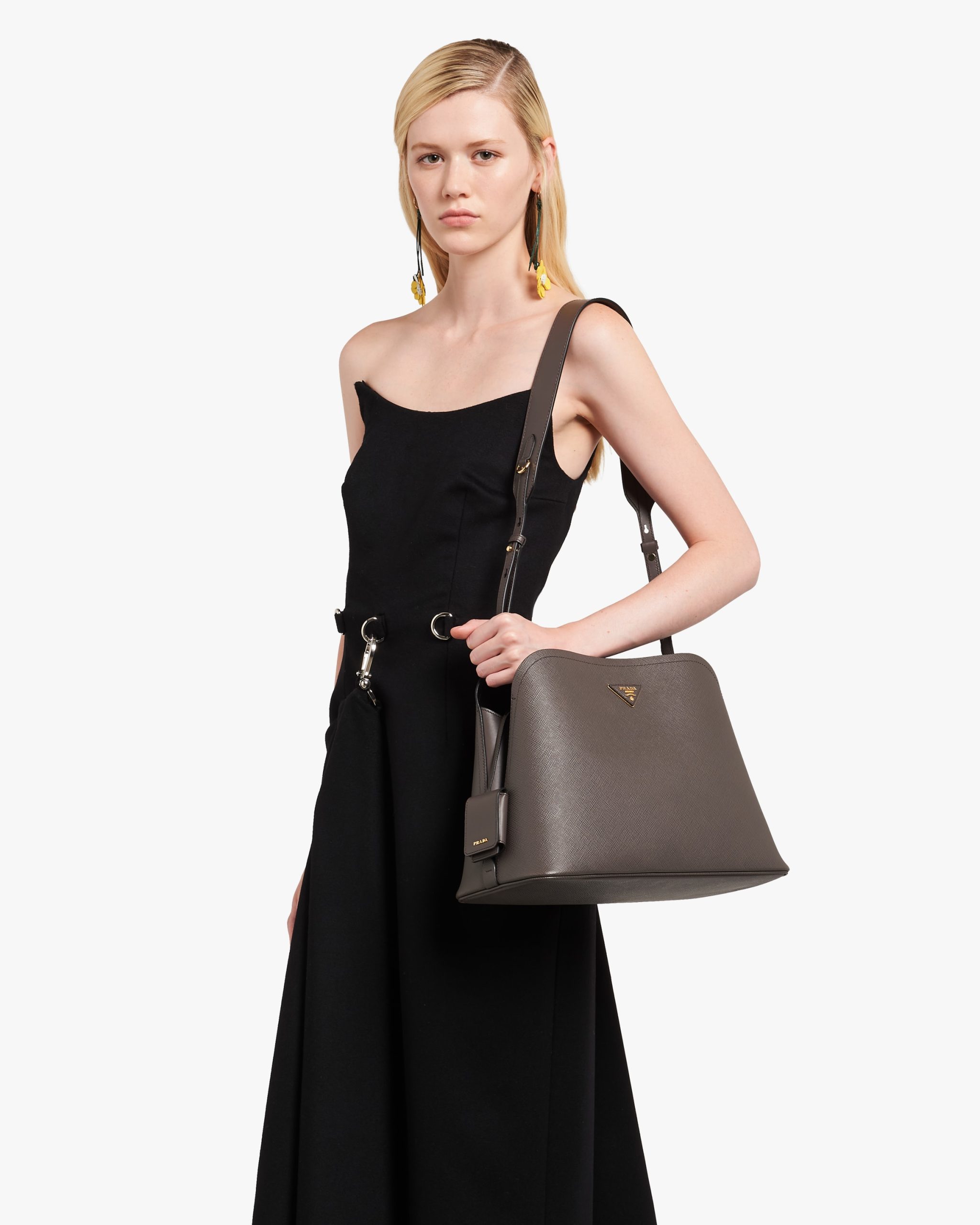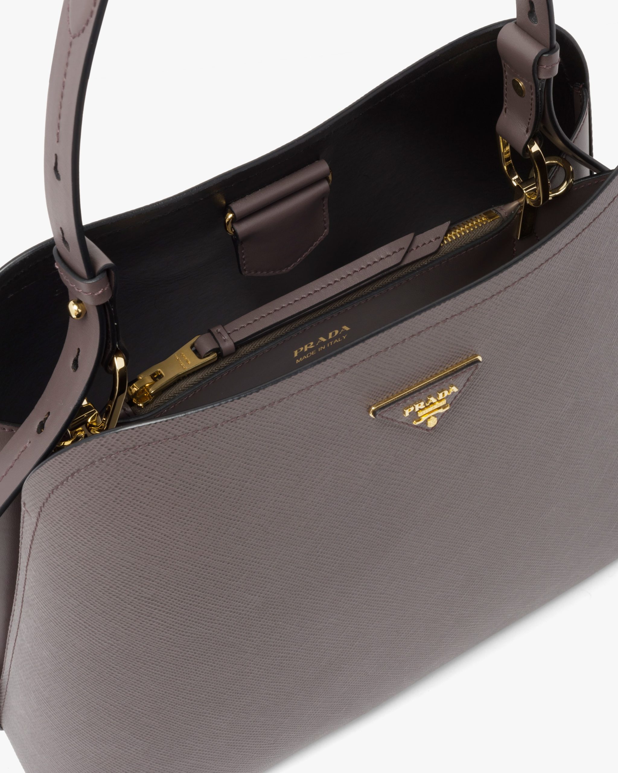 The Prada Matin?e handbag made of Saffiano leather stands out for its metal triangle logo2 and detachable adjustable leather shoulder strap.