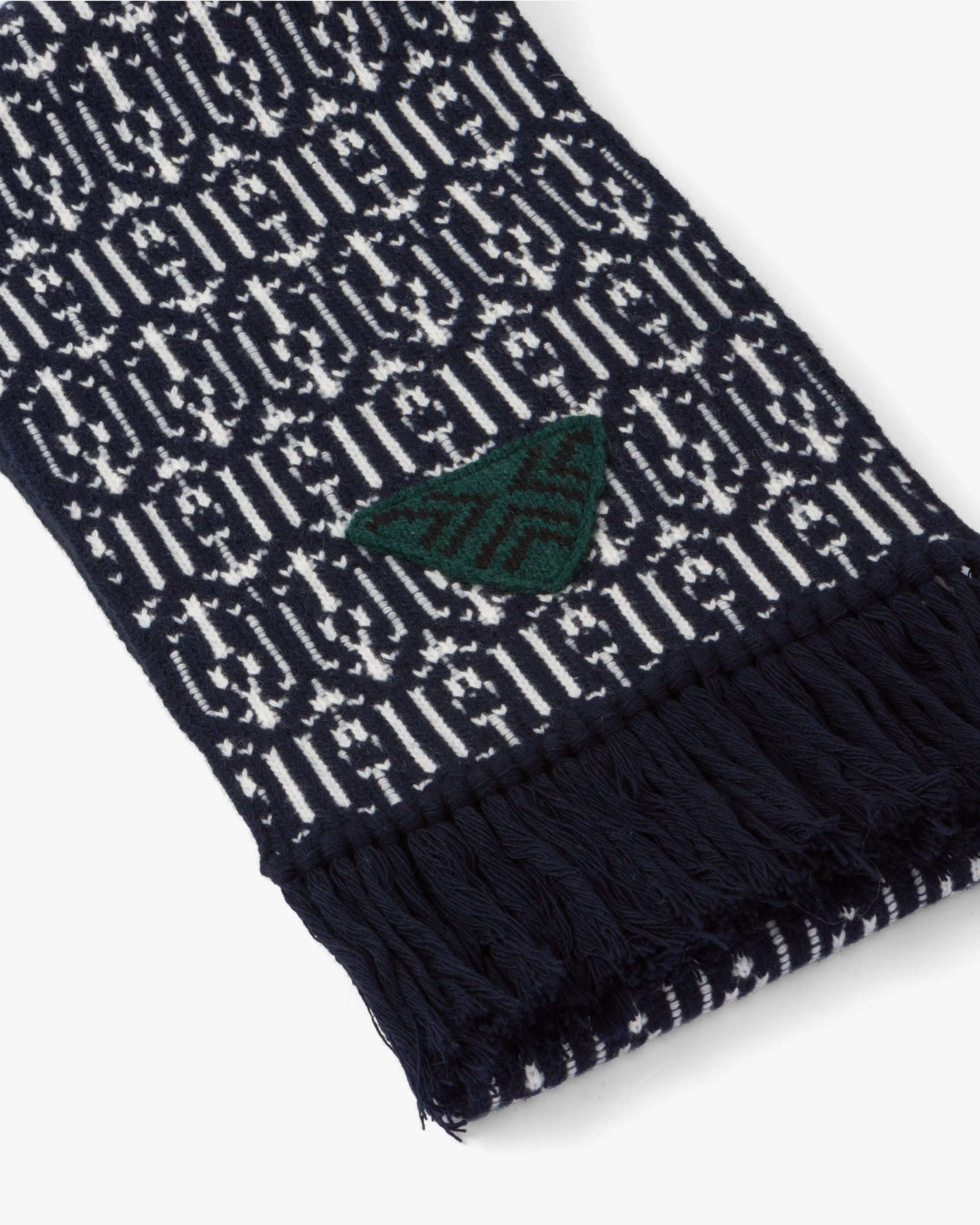 This scarf full of eclectic allure brings jacquard geometric motifs to life, evoking designs from the sixties. The cashmere and wool accessory features Prada’s iconic triangle logo2 in a new knit version animated by an elaborate pattern.