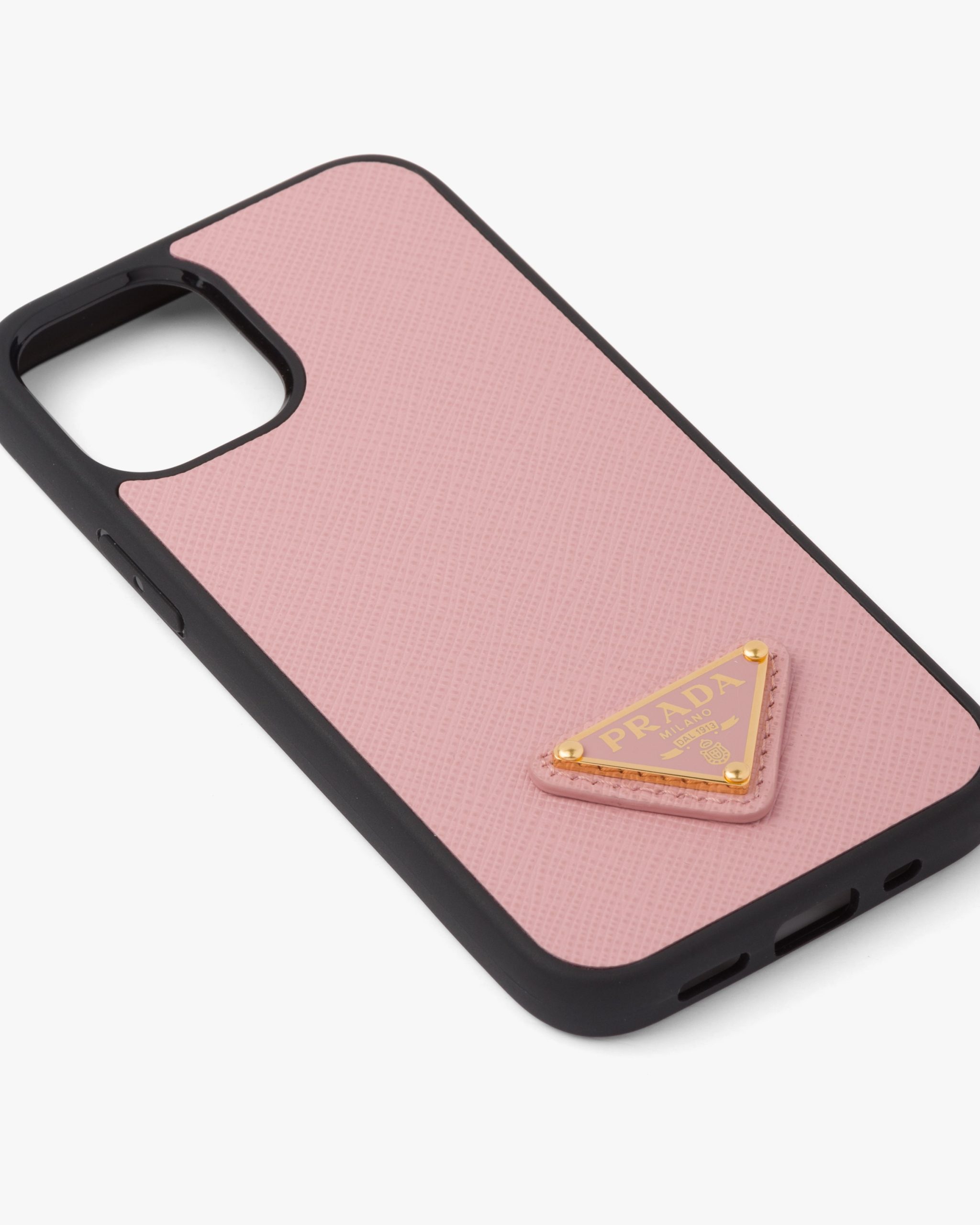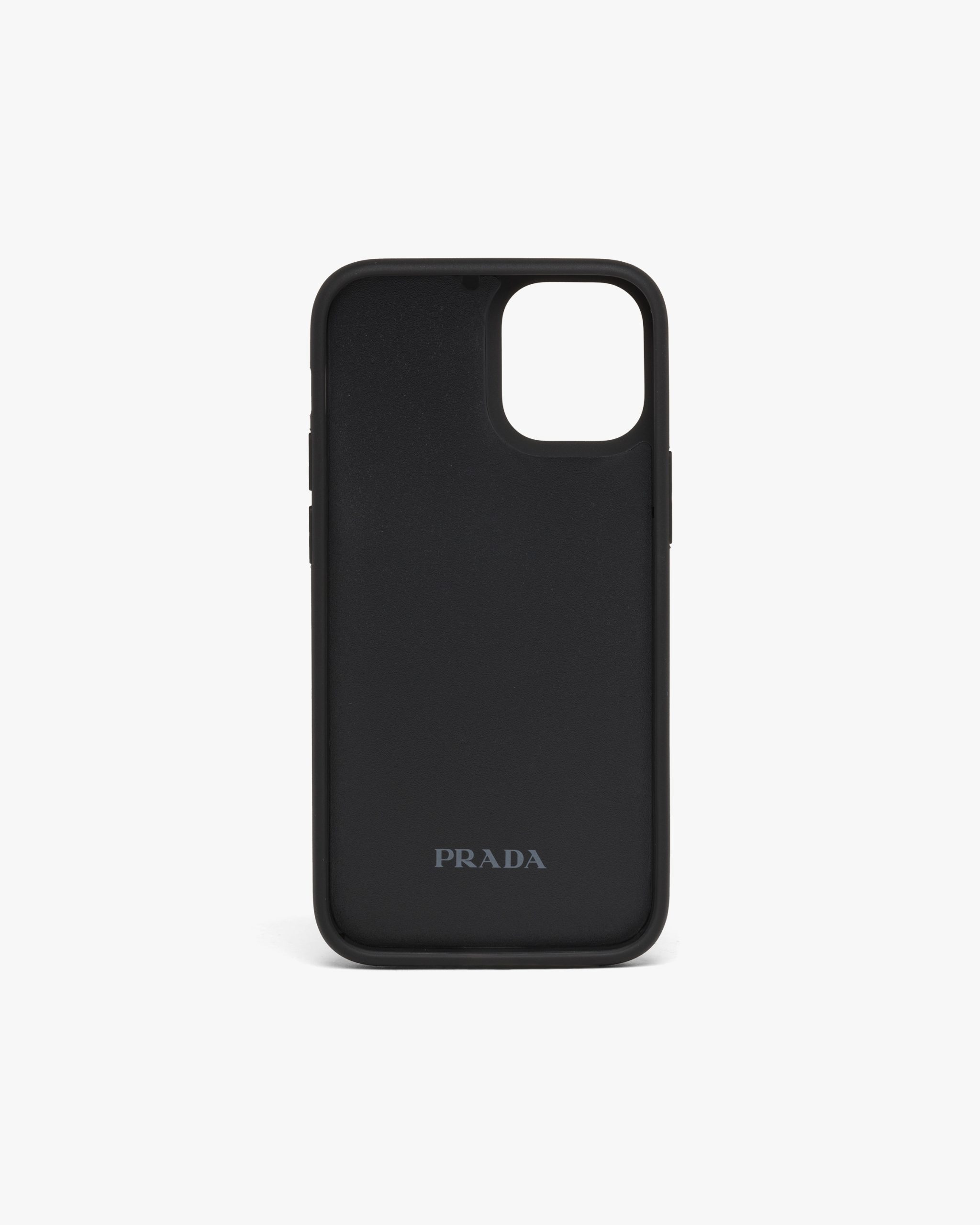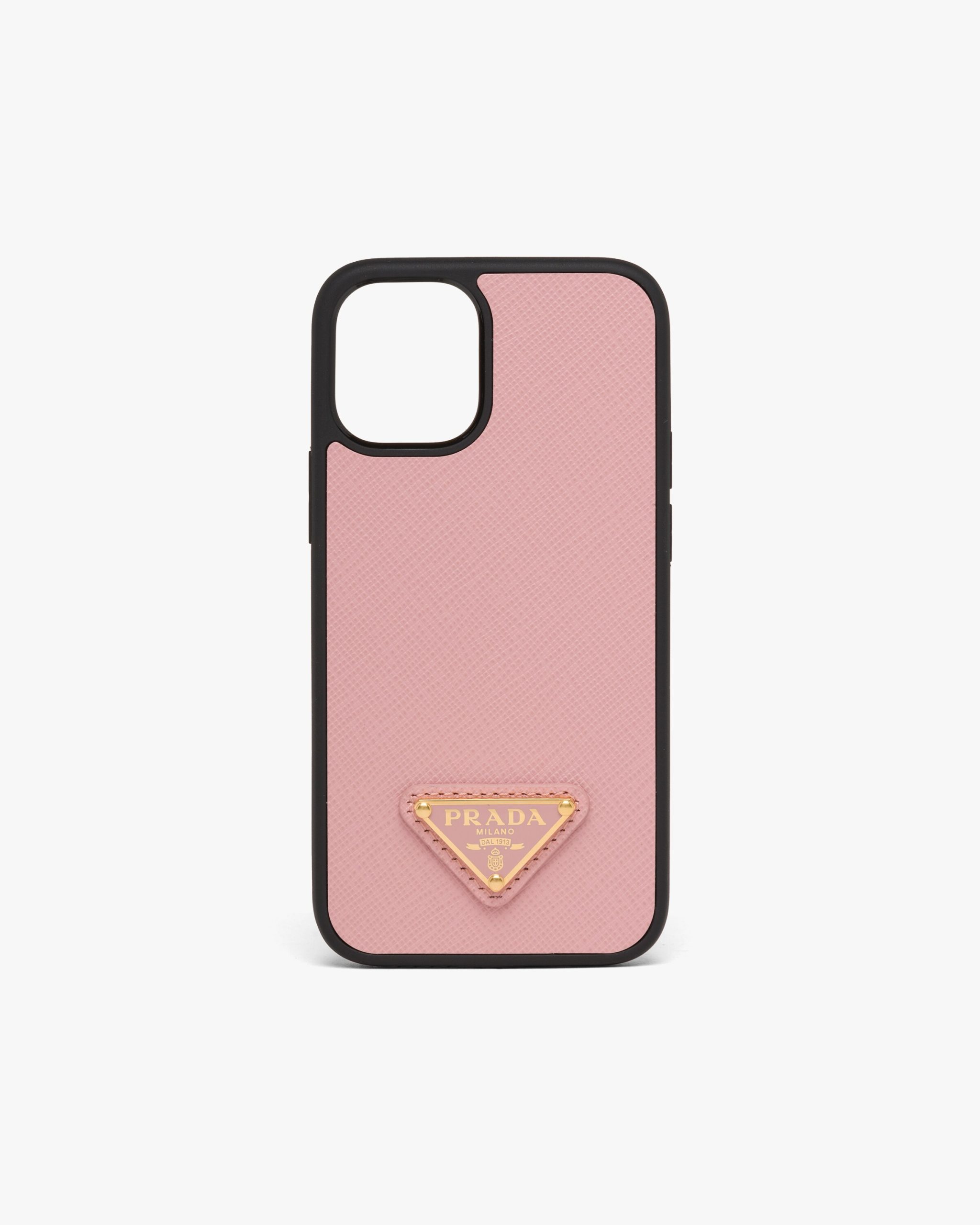 This cover for iPhone 12 Mini is made of Saffiano, an iconic Prada material: calf leather of the highest quality, defined by a crosshatch texture and waxed finish. The enameled metal triangle logo2 decorates the accessory.