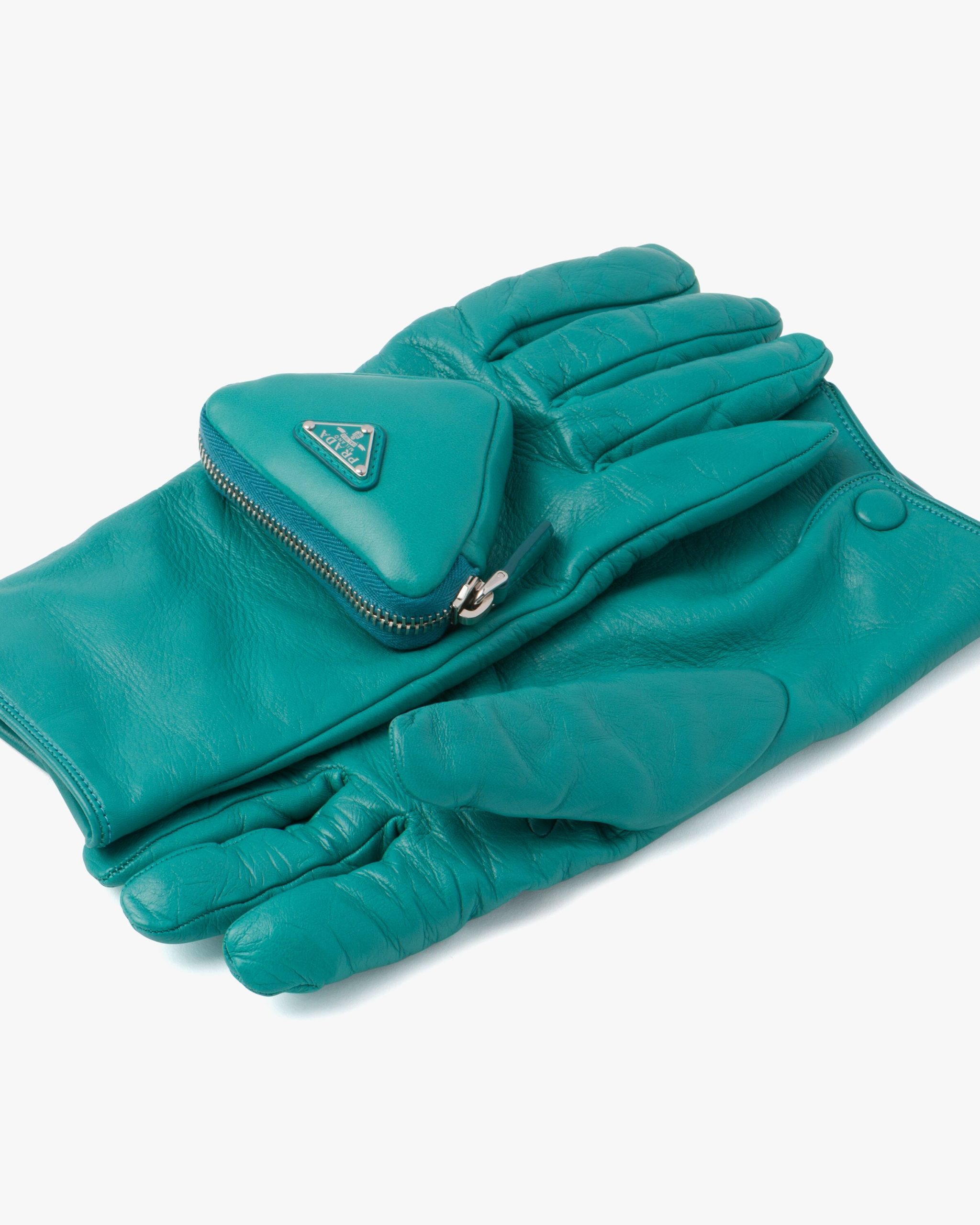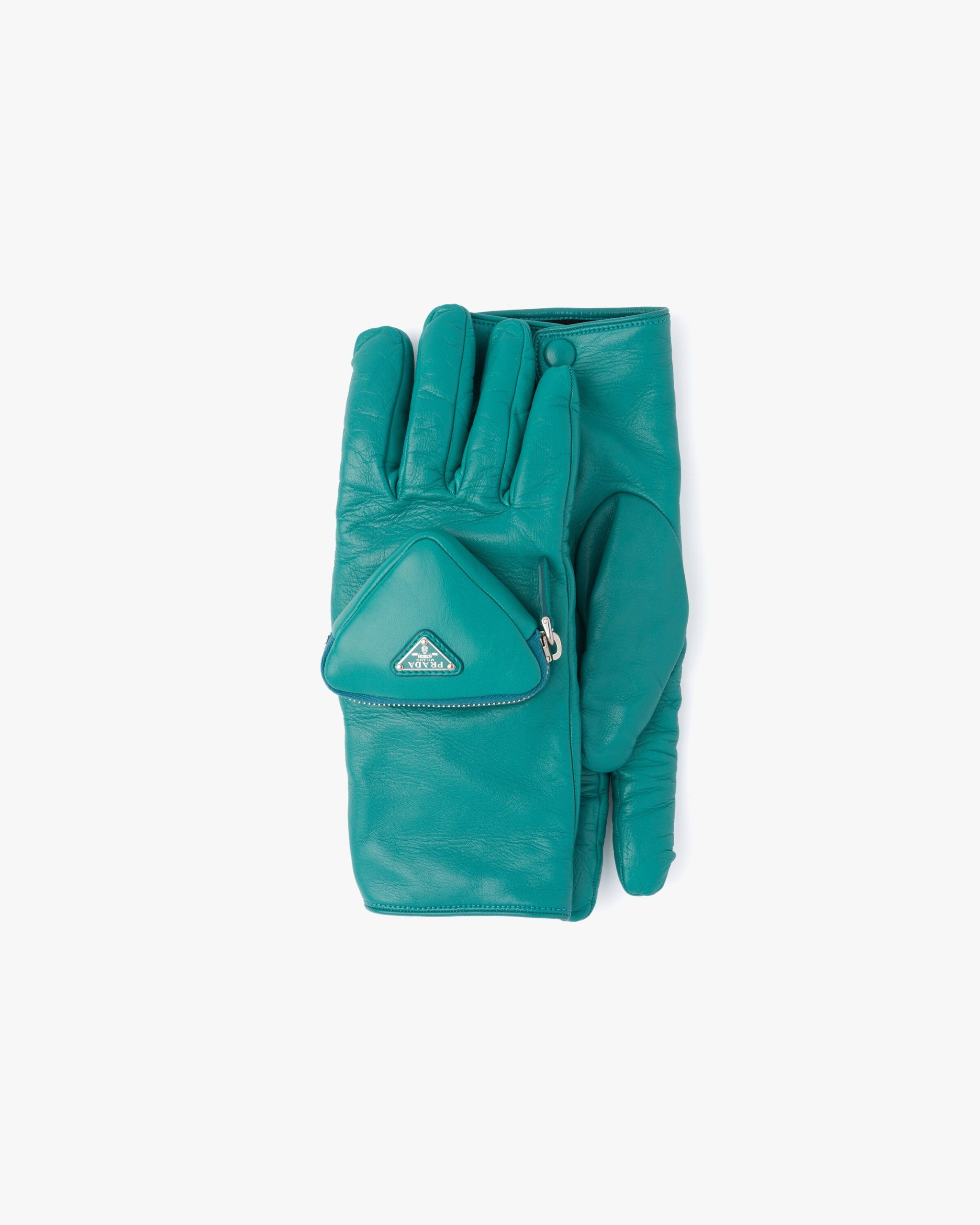 These gloves made of shiny nappa leather with a slightly irregular surface reminiscent of the leather used in the seventies come in a series of vibrant colors and more classic dark shades. The design is made modern by the small zipper pouch with enameled metal logo2 on one of the two gloves, an element that plays with the iconic triangle shape.