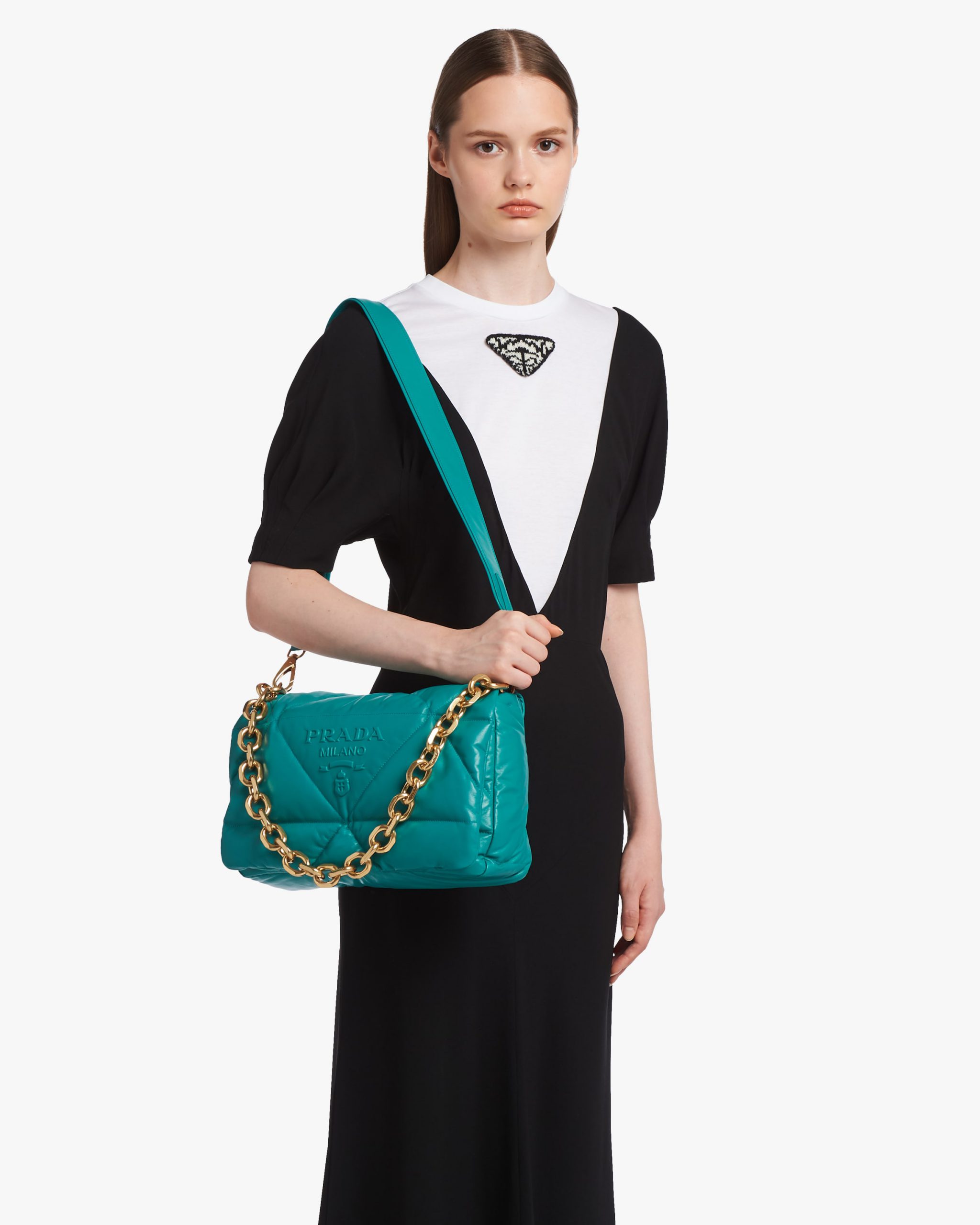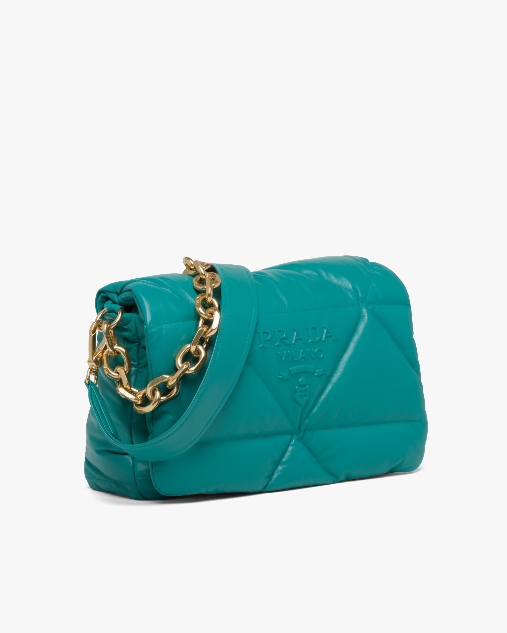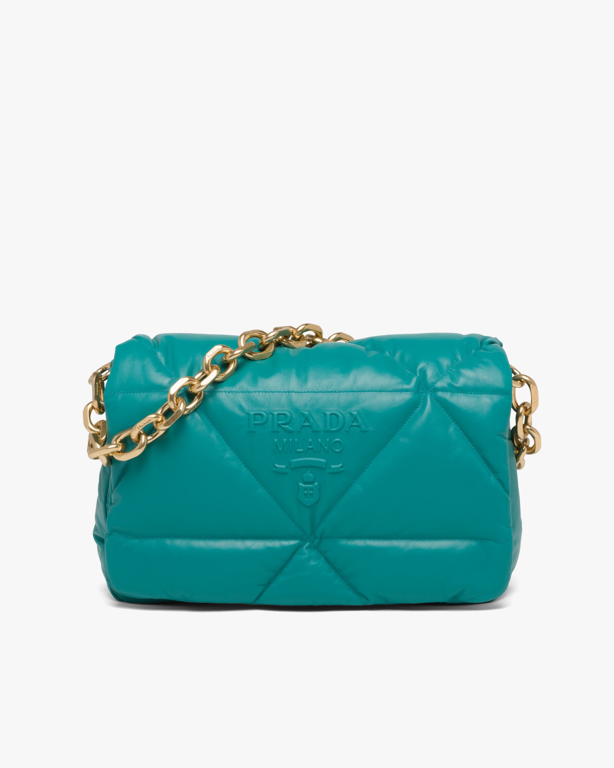 Reinterpreted in always new ways, Prada’s iconic triangle is repeated in the quilted motif of this soft padded nappa leather bag to create a patchwork motif. The chain handle is decorated with the engraved lettering logo2.