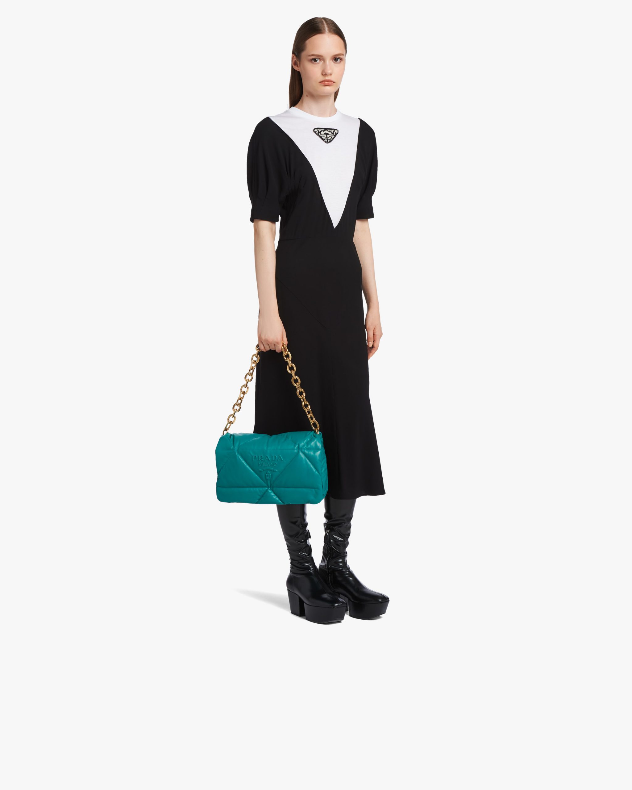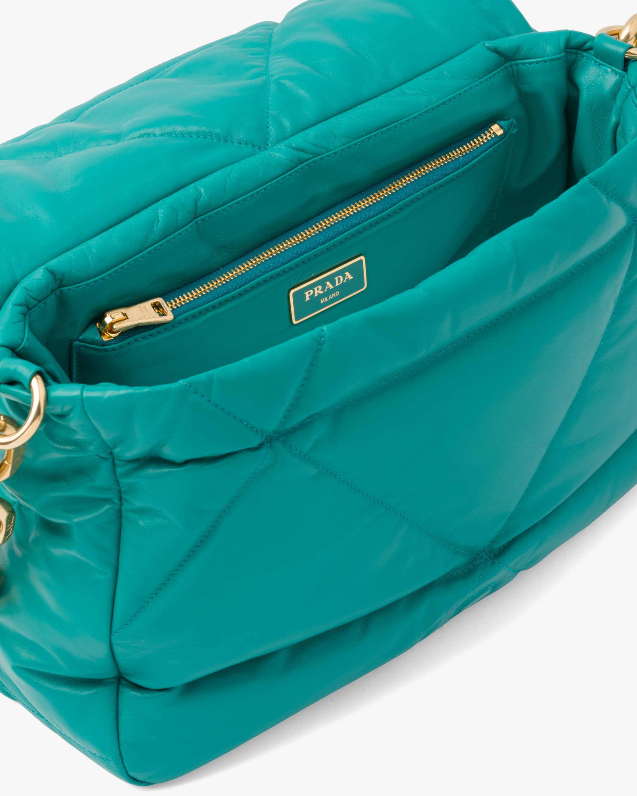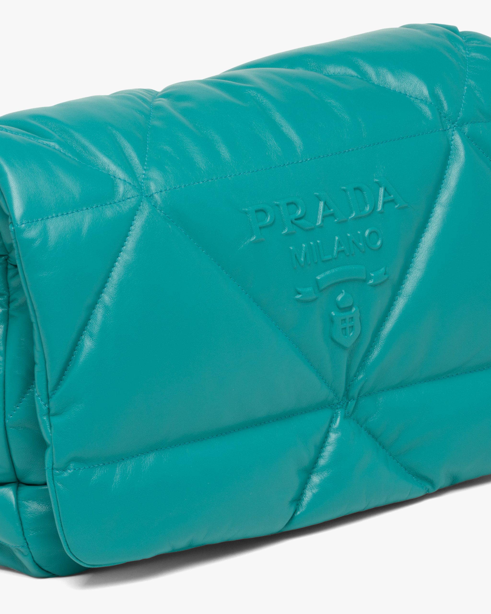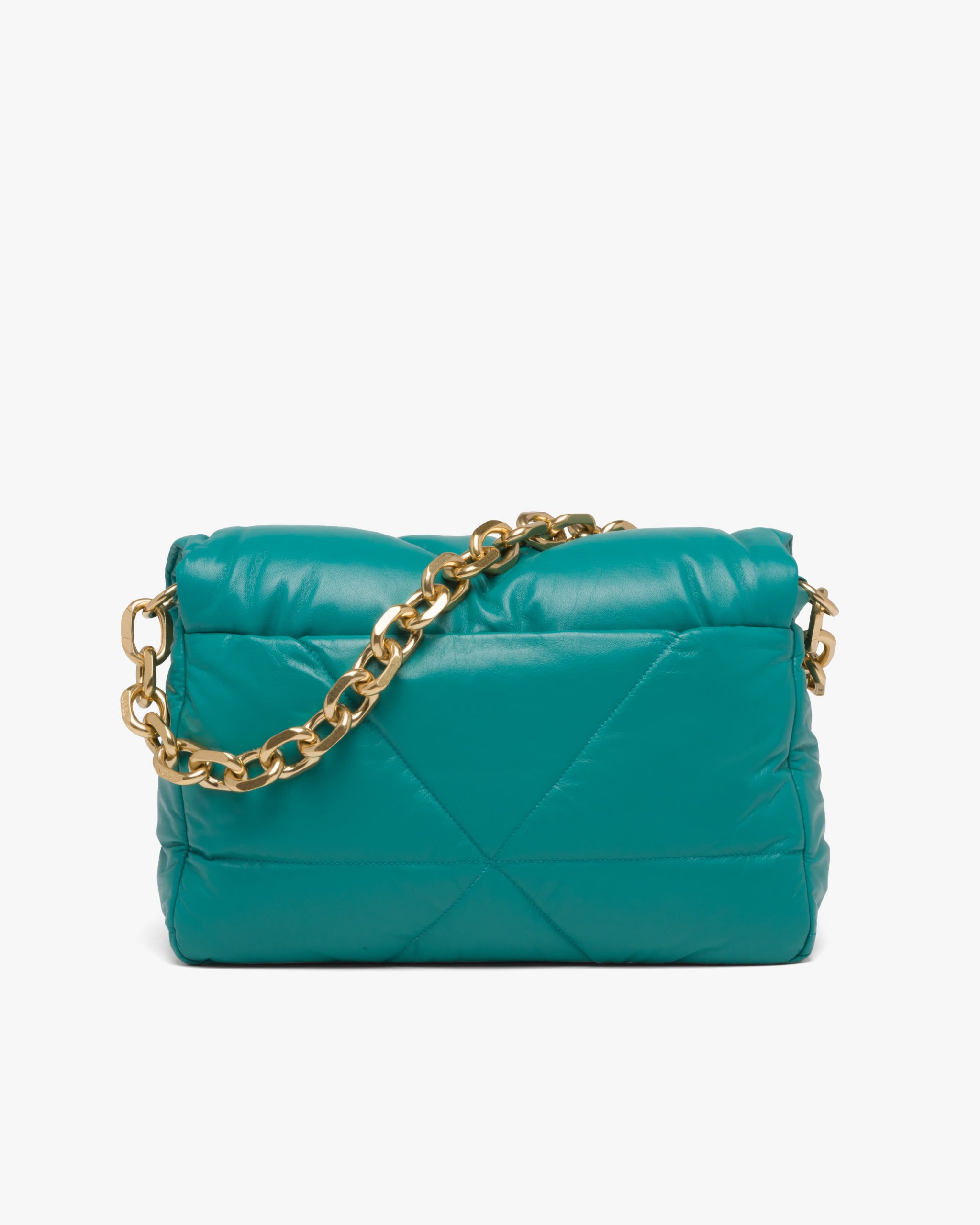 Reinterpreted in always new ways, Prada’s iconic triangle is repeated in the quilted motif of this soft padded nappa leather bag to create a patchwork motif. The chain handle is decorated with the engraved lettering logo2.