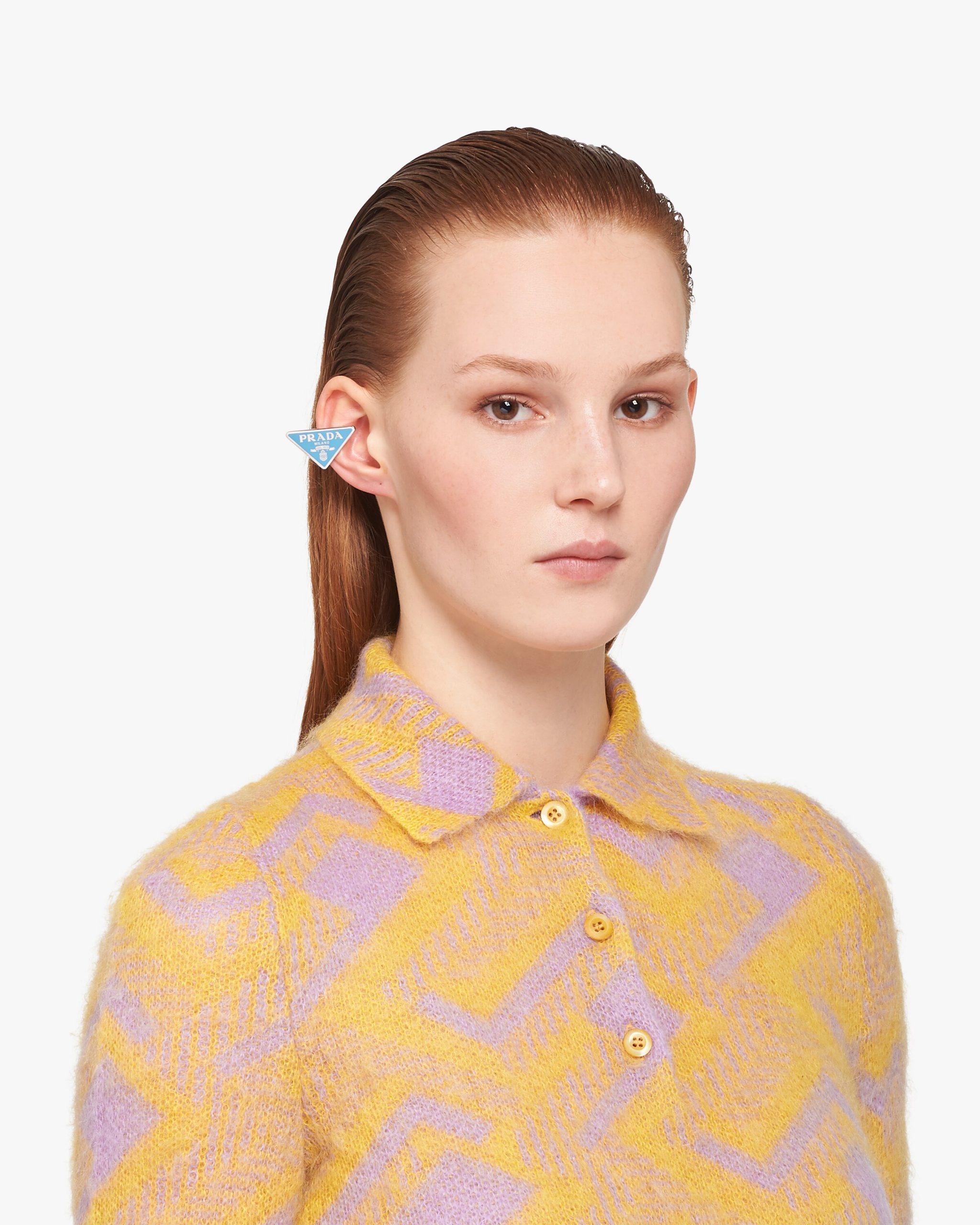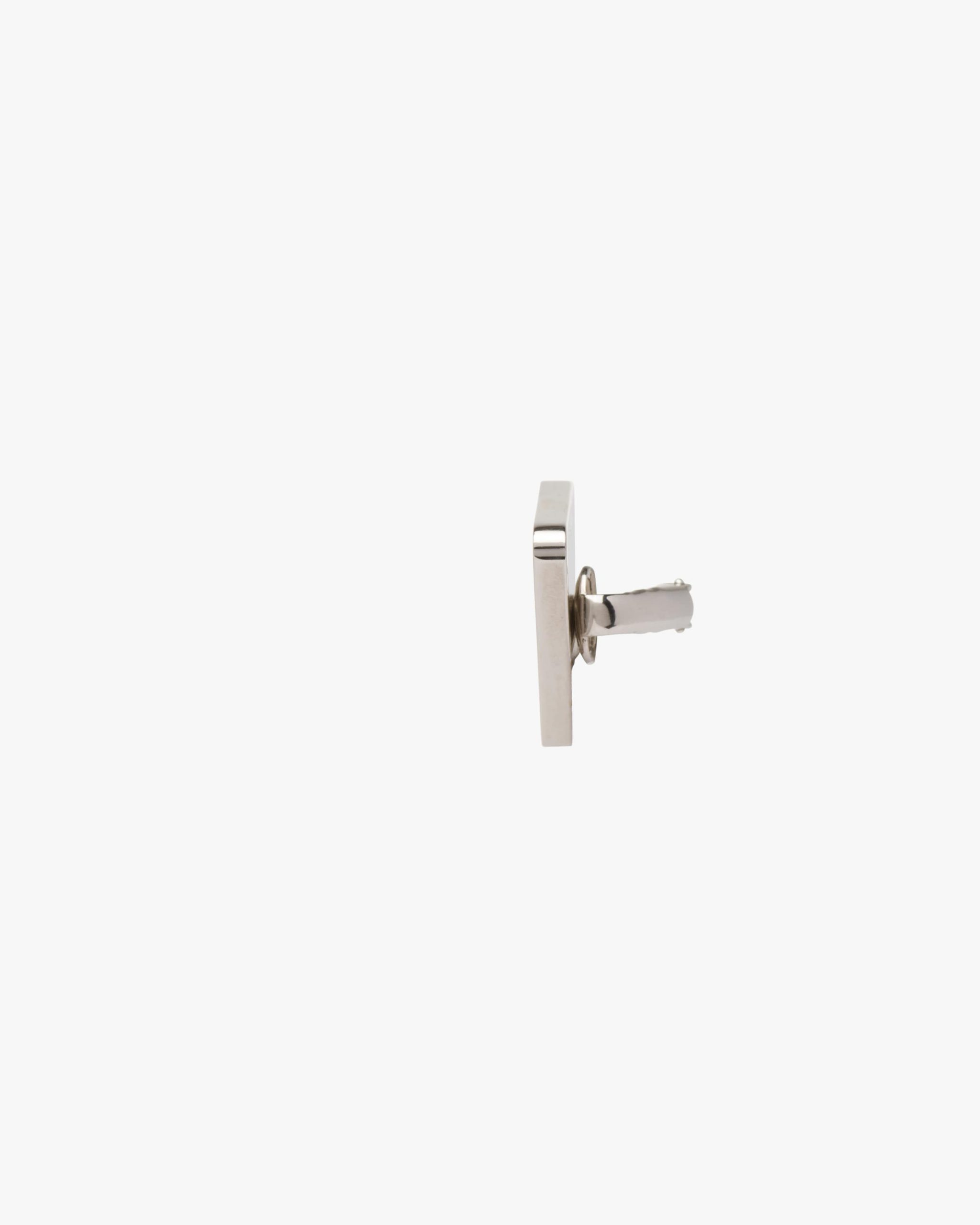 Prada’s historic symbol decorated with enamel defines this single earring worn on the right. Iconic and sleek, the triangle logo2 is the protagonist of a new line of jewelry made of 925 sterling silver that reinterprets punk influences in a modern way.