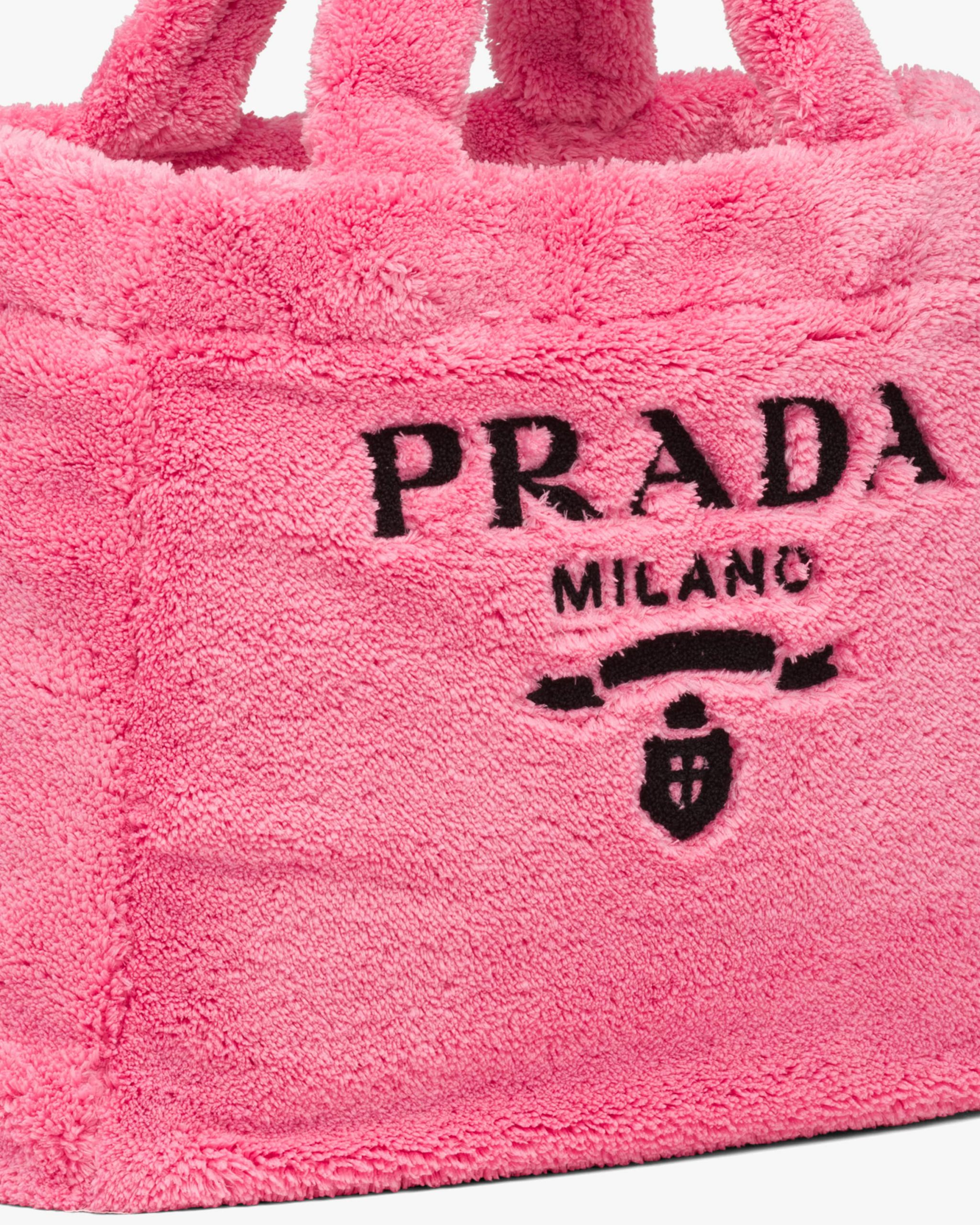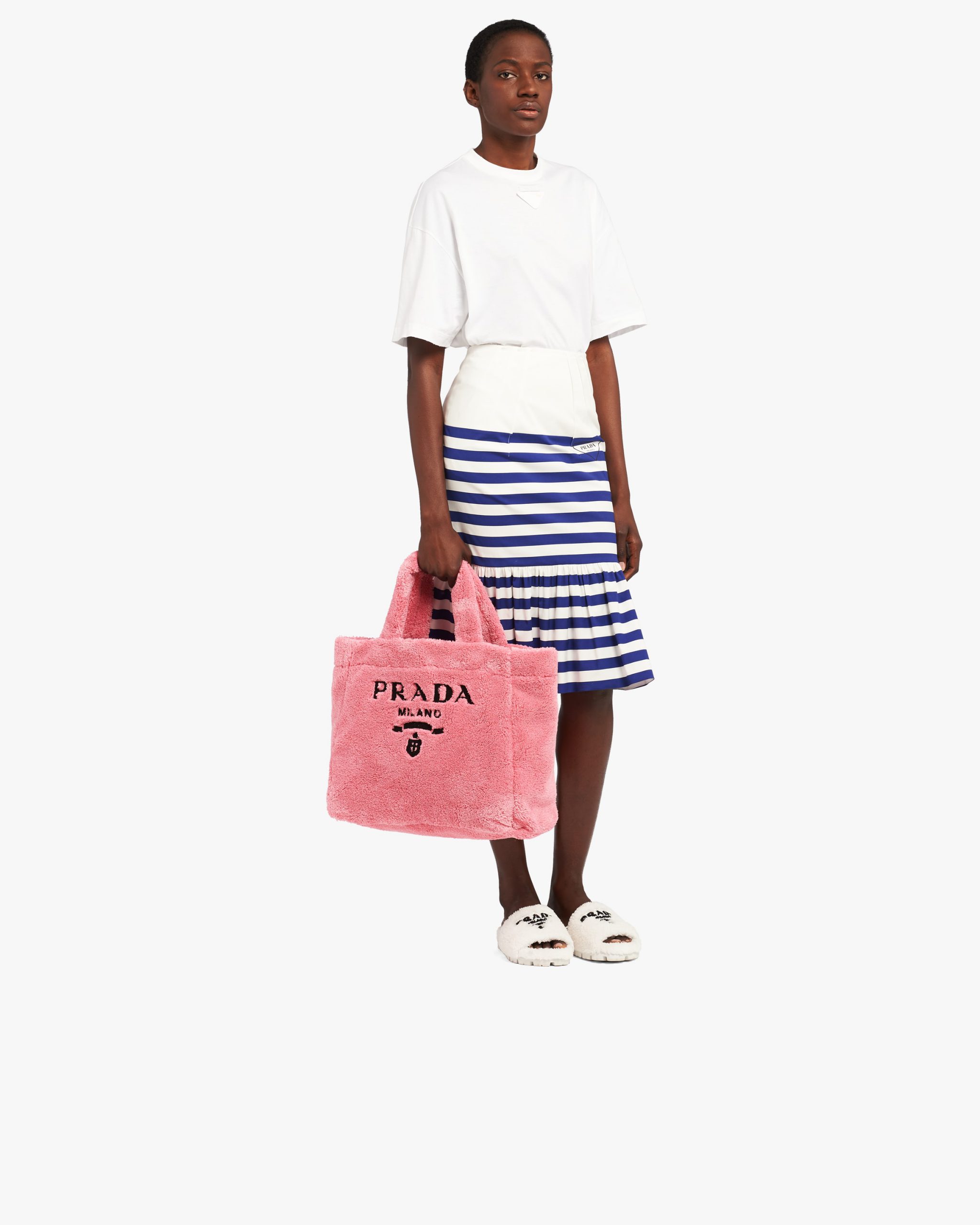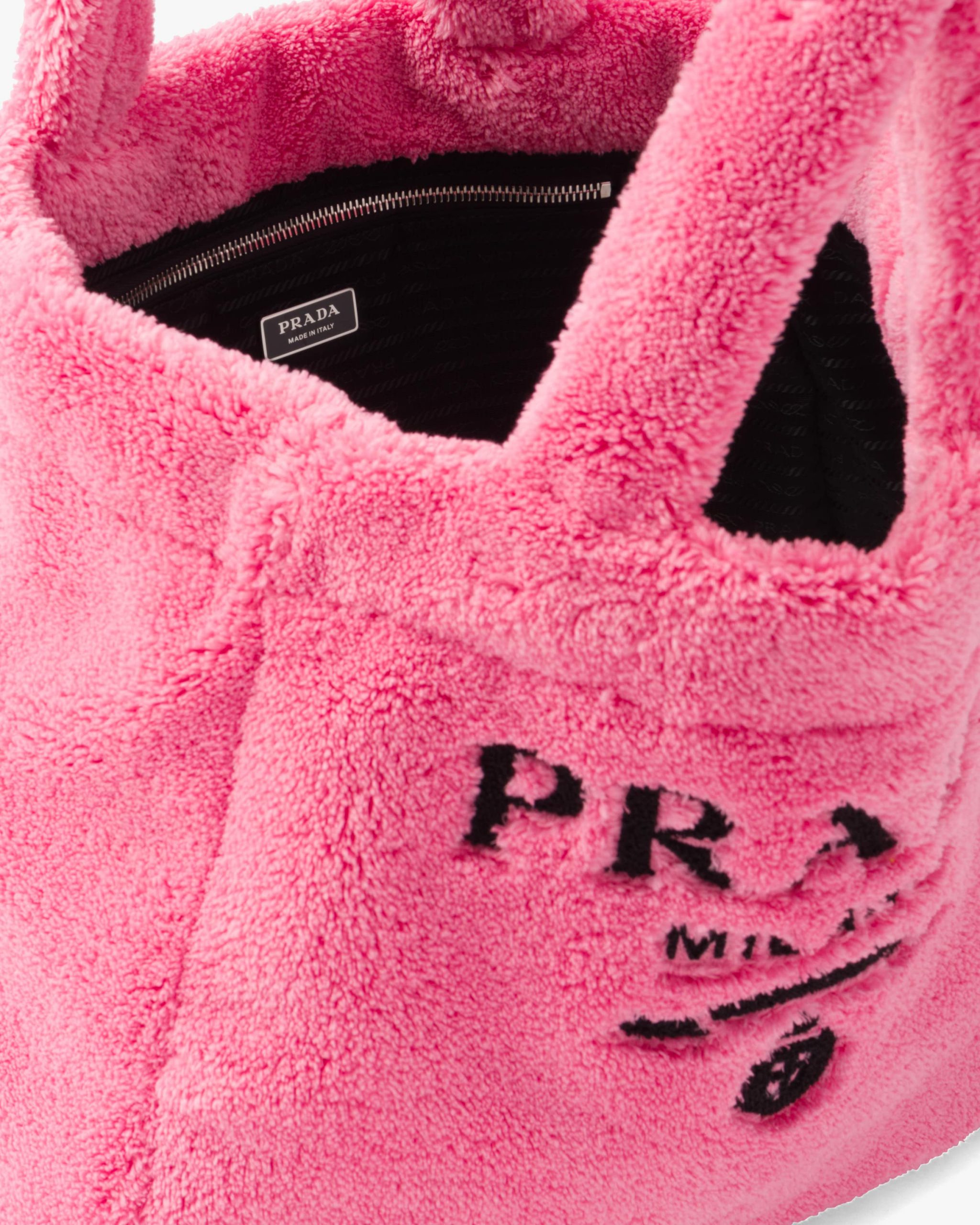 Vivid color contrasts and an ironic character define this tote bag with a deconstructed design in soft terry with a summery mood. A maxi version of Prada’s iconic lettering logo2 embroidered on the front enhances the accessory.
