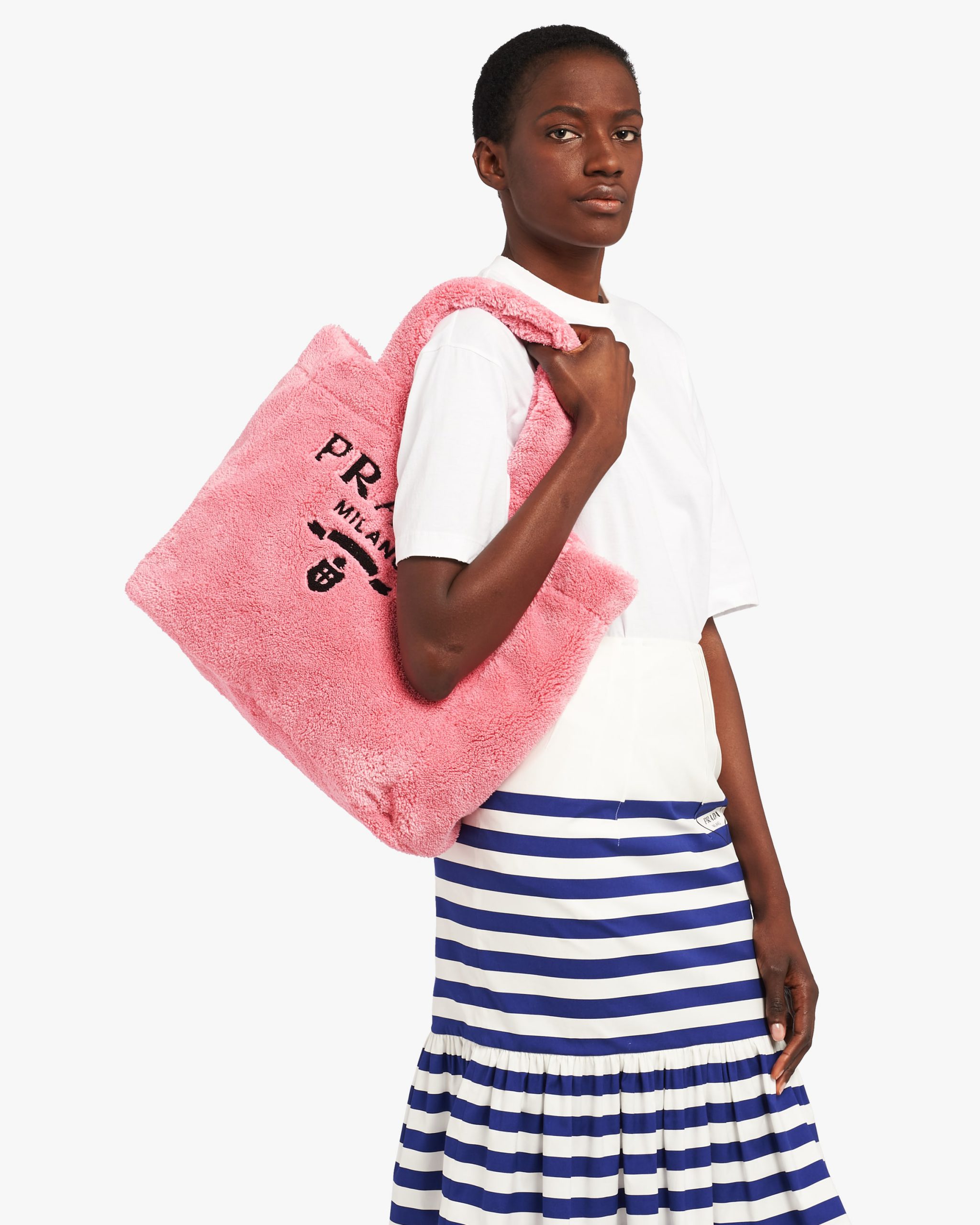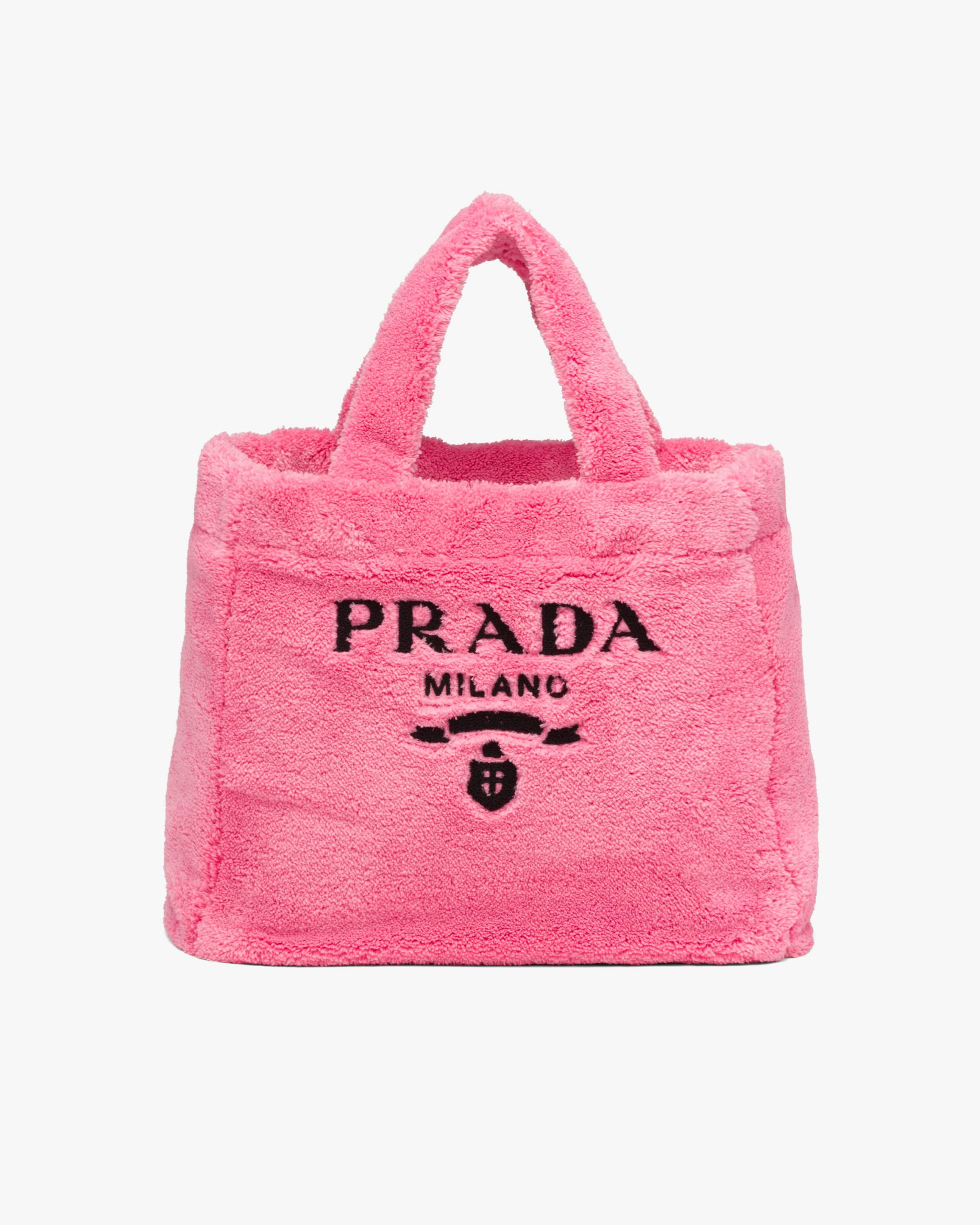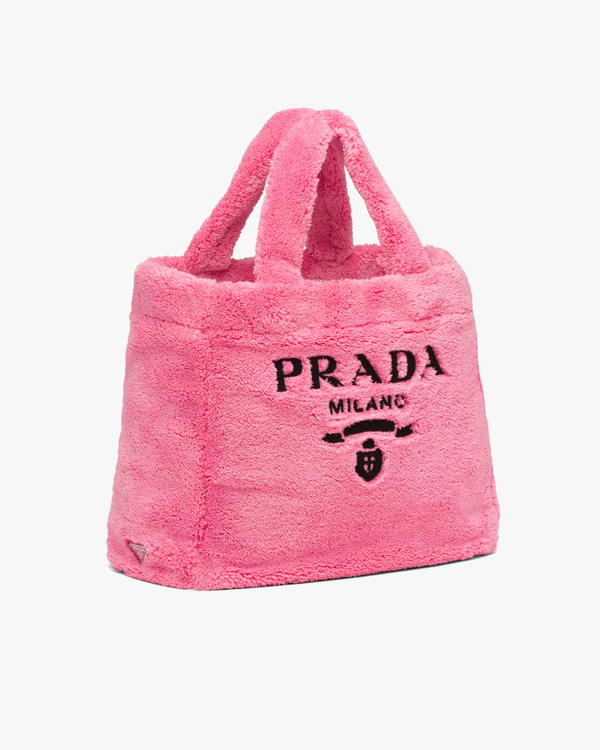 Vivid color contrasts and an ironic character define this tote bag with a deconstructed design in soft terry with a summery mood. A maxi version of Prada’s iconic lettering logo2 embroidered on the front enhances the accessory.