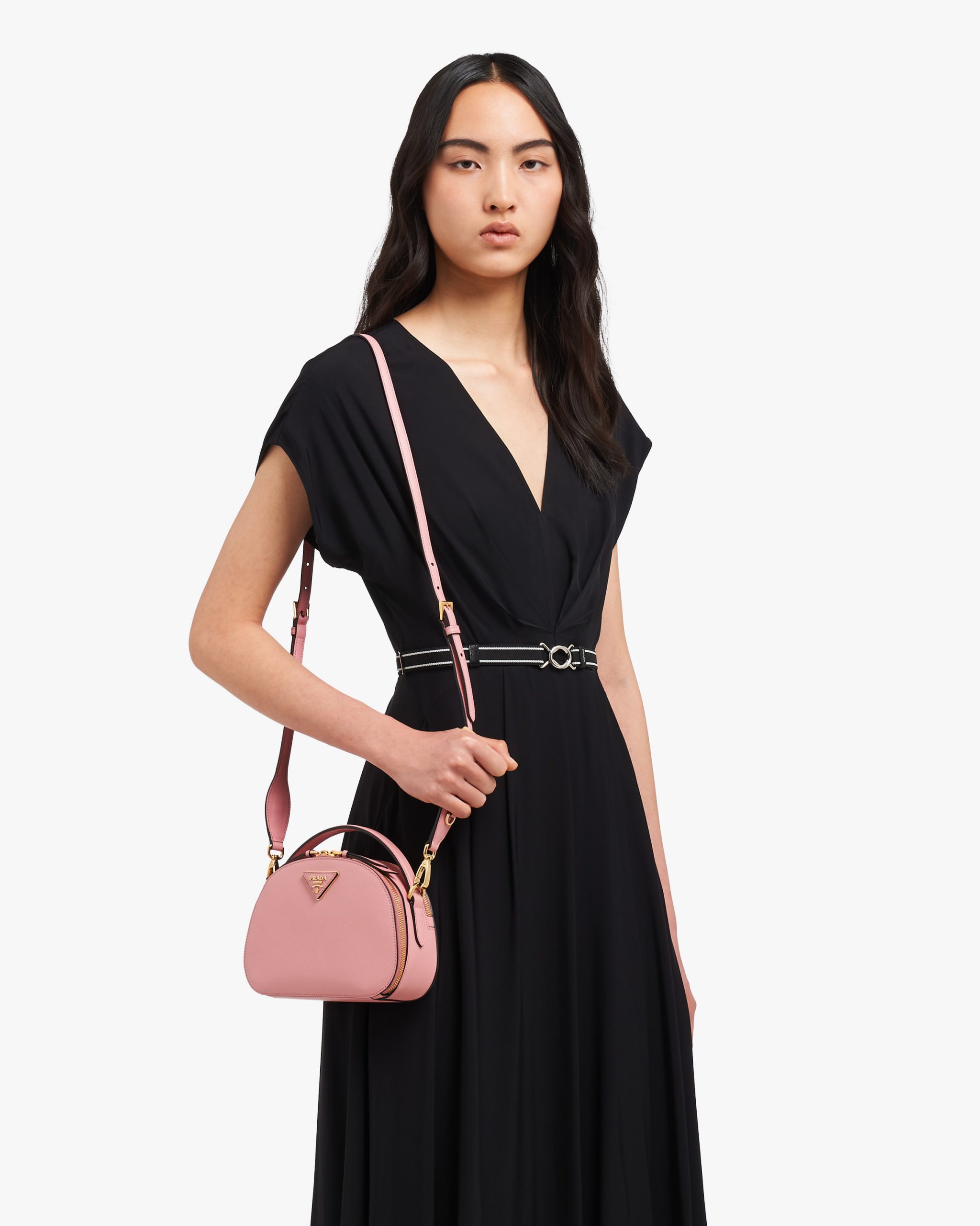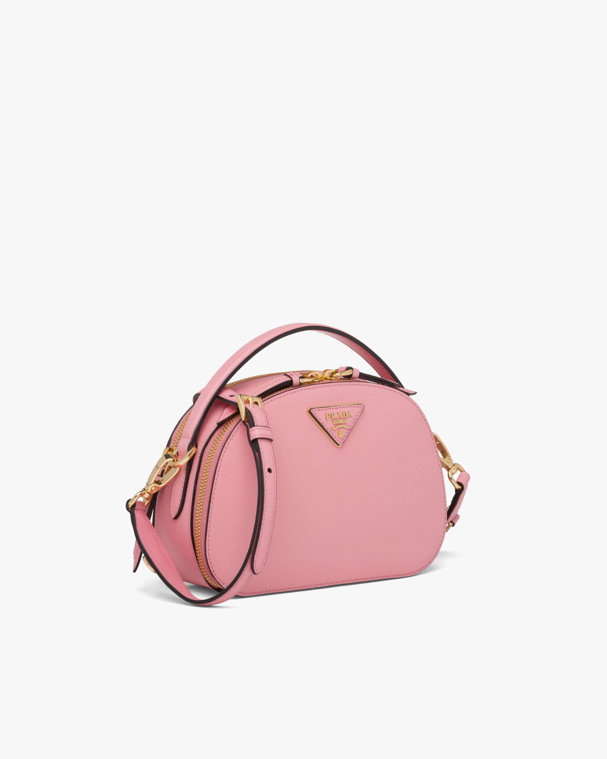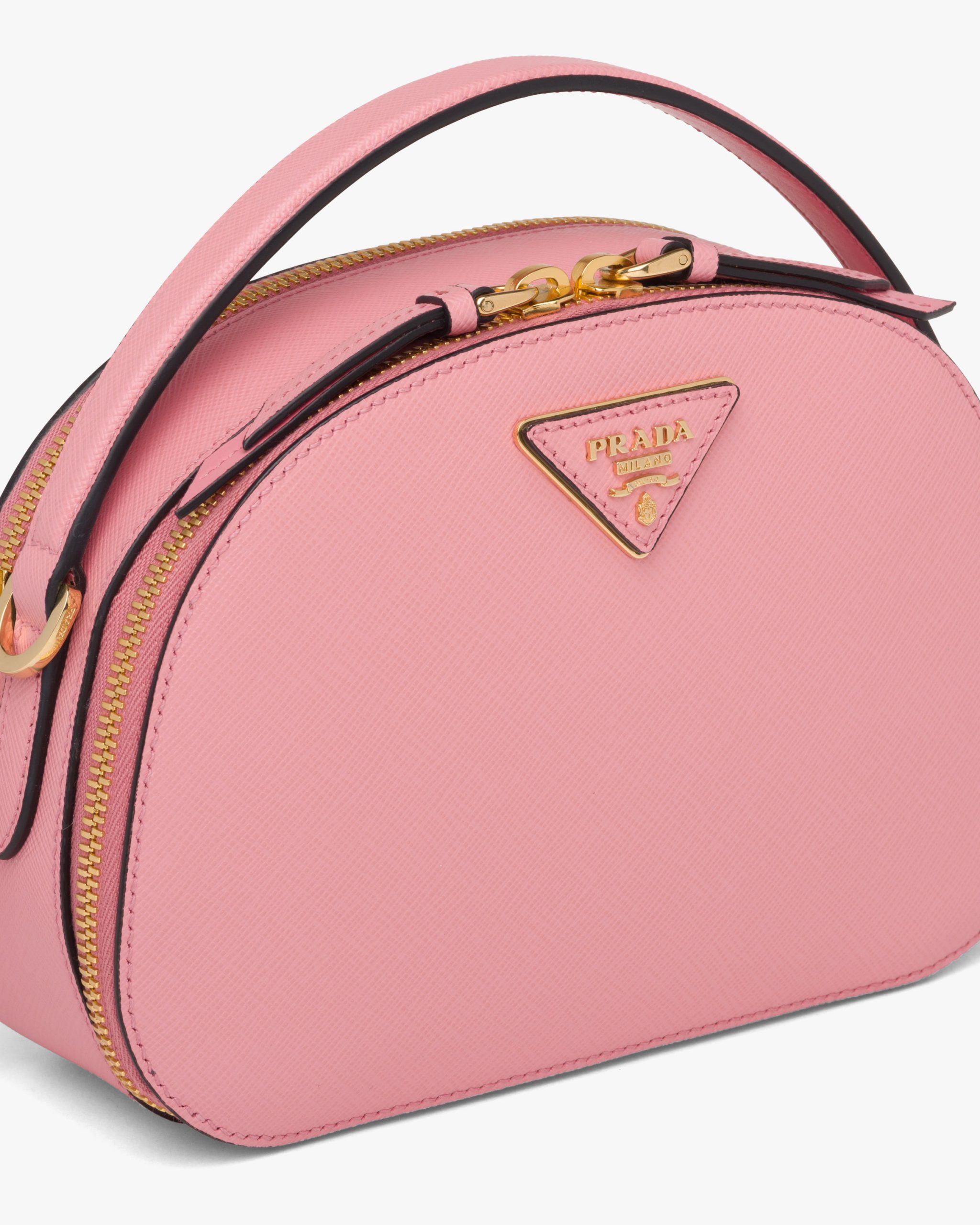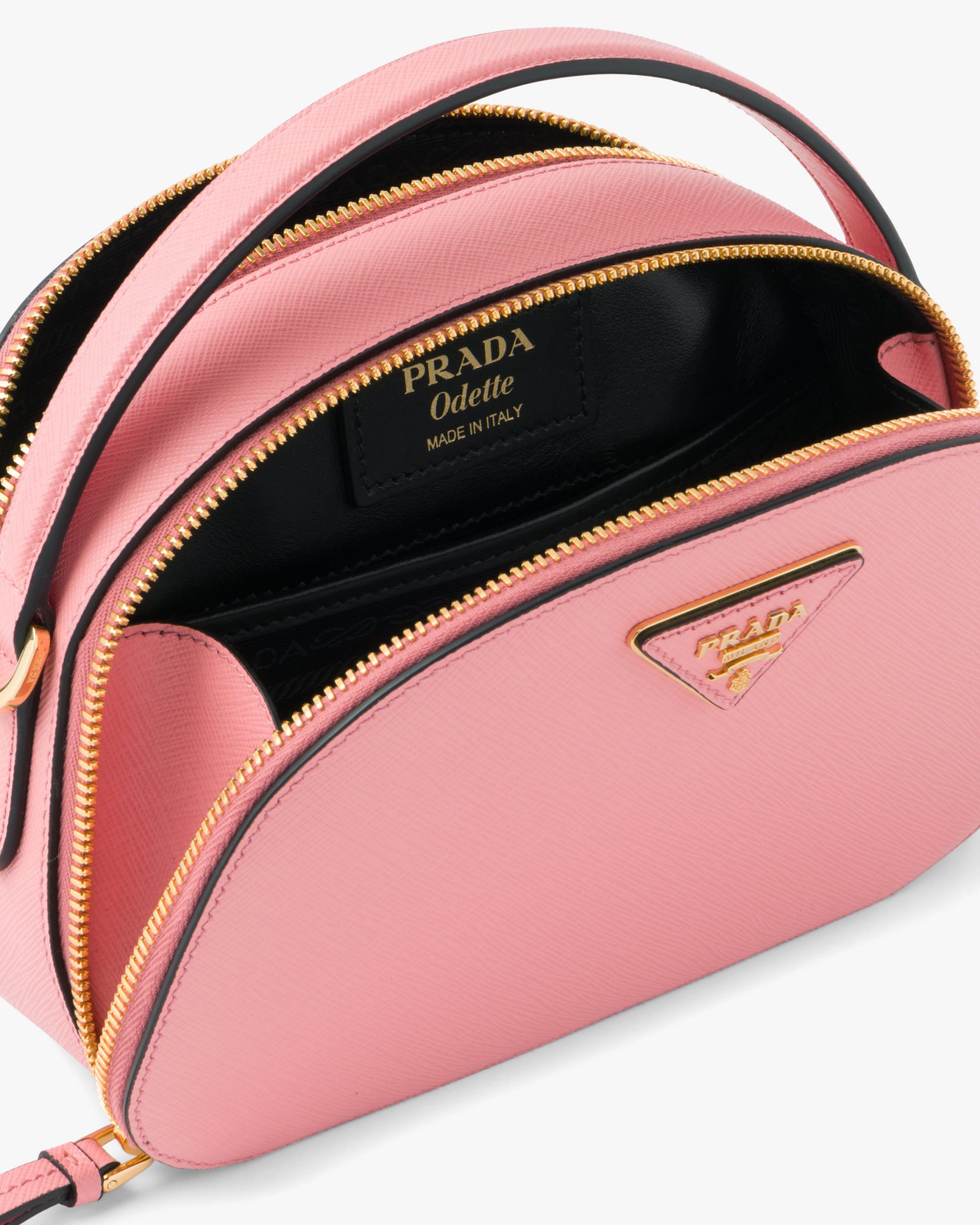 The rounded design of the Prada Odette bag is inspired by photographers’ camera cases. Made of fine Saffiano leather and decorated with the iconic triangle logo2, the bag can be carried by hand or worn with a shoulder strap.