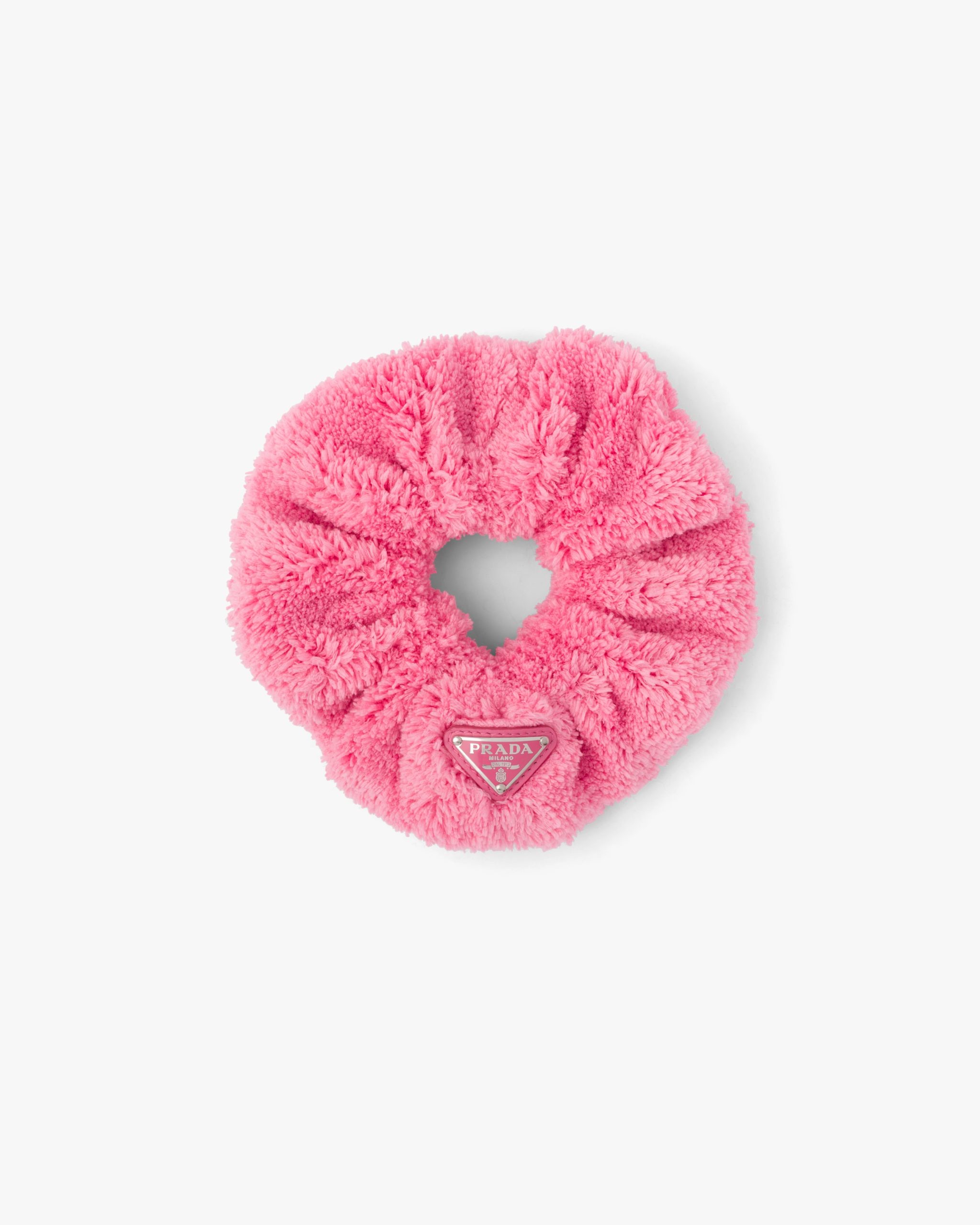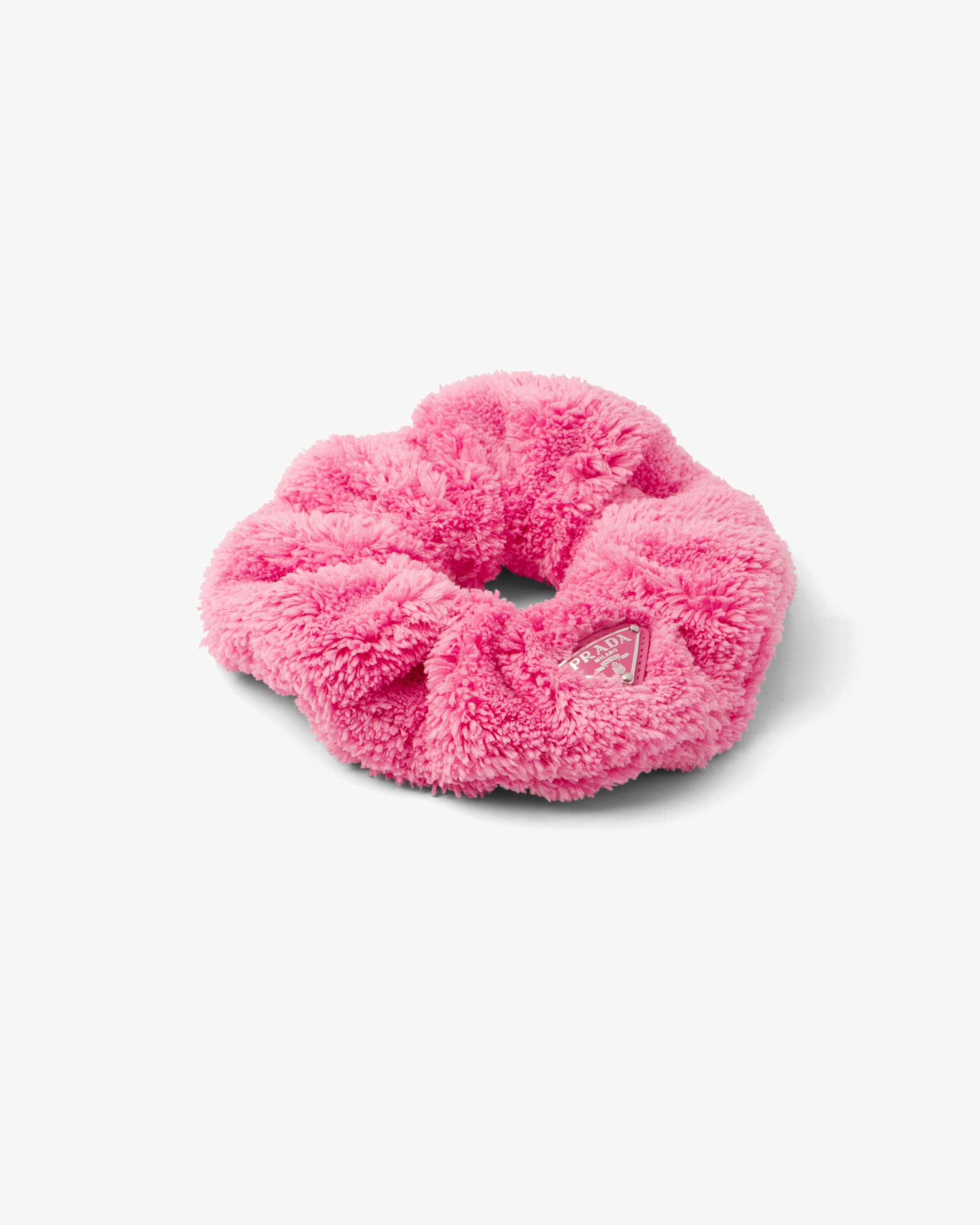 This scrunchie with a retro mood is made of soft terry cloth, a fabric that brings to mind the romantic elegance of summer in the fifties. The enameled triangle logo2, an emblematic element of Prada, decorates the design and adds an iconic accent.