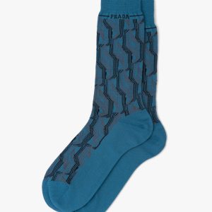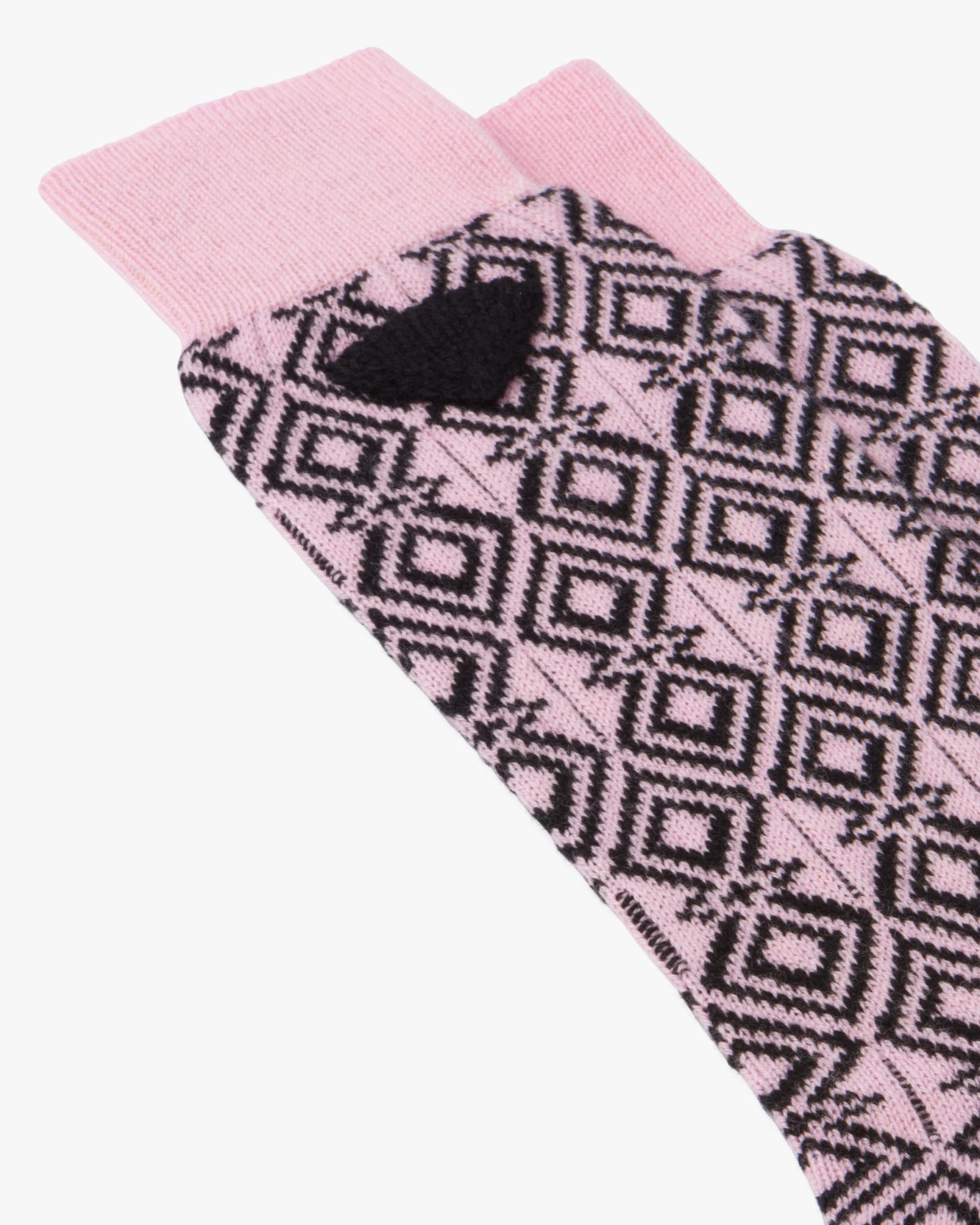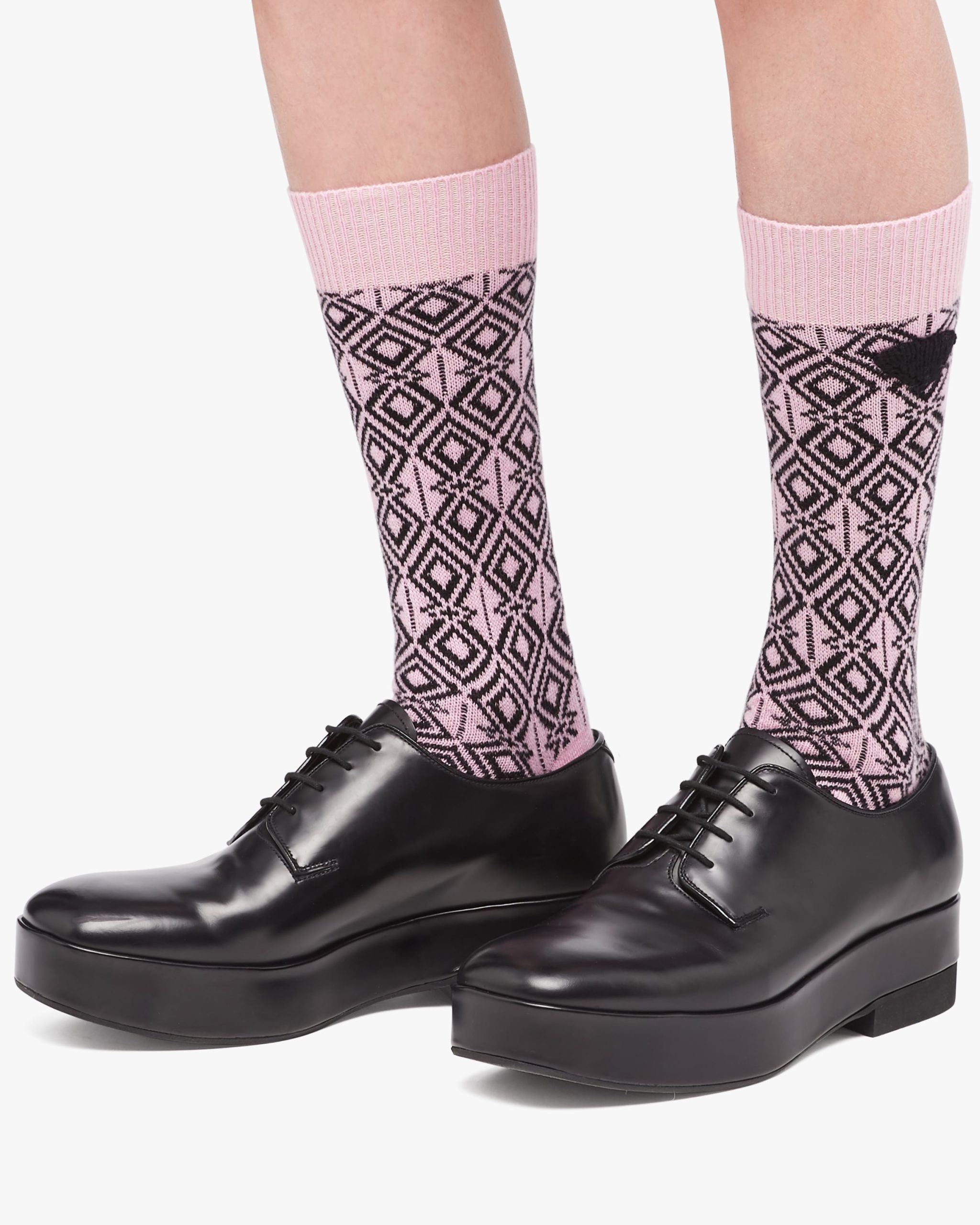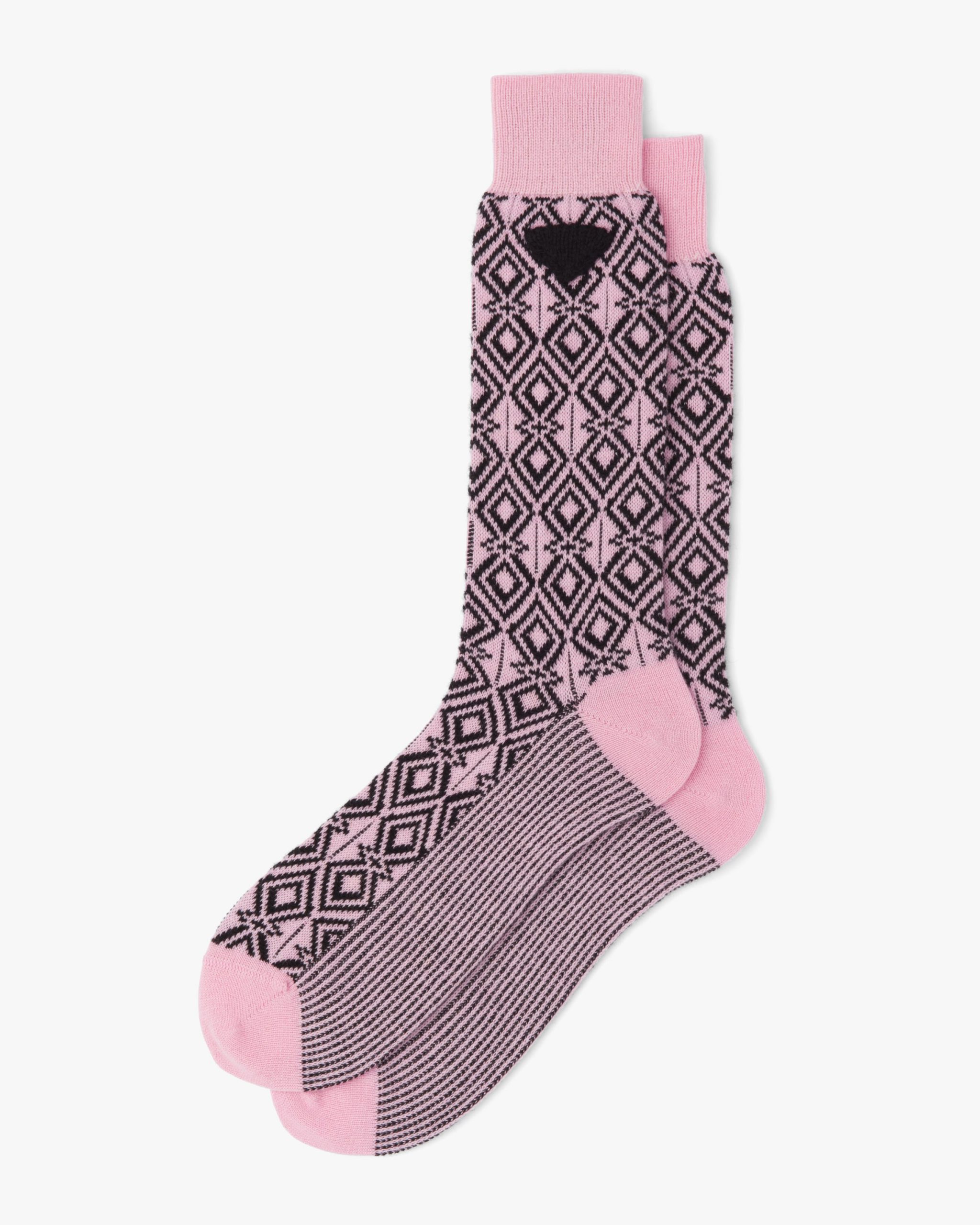 Geometric jacquard patterns animate these ankle socks made of high quality cashmere that is warm, cozy and extremely soft to the touch. A new interpretation of the triangle logo2 embellishes the design.