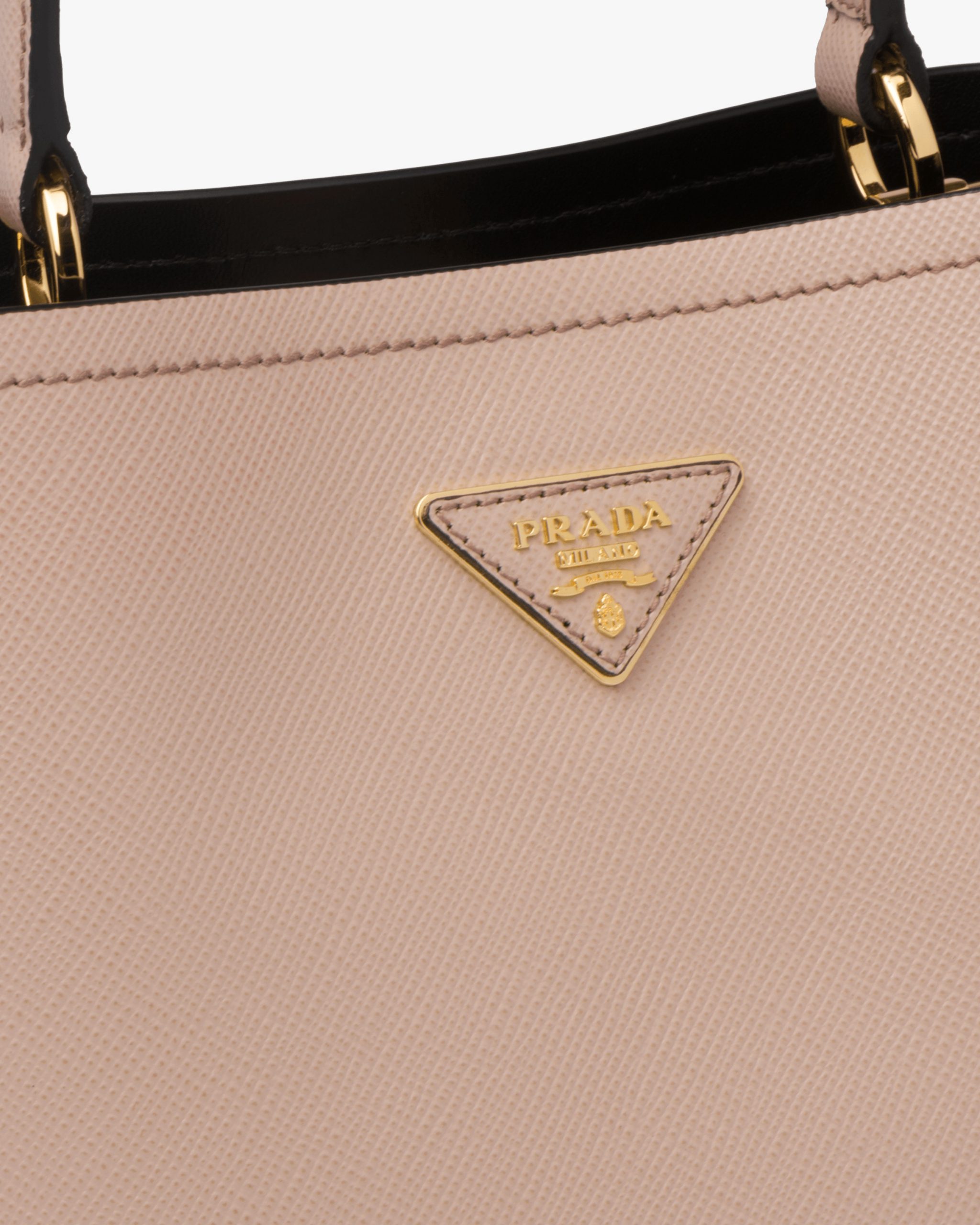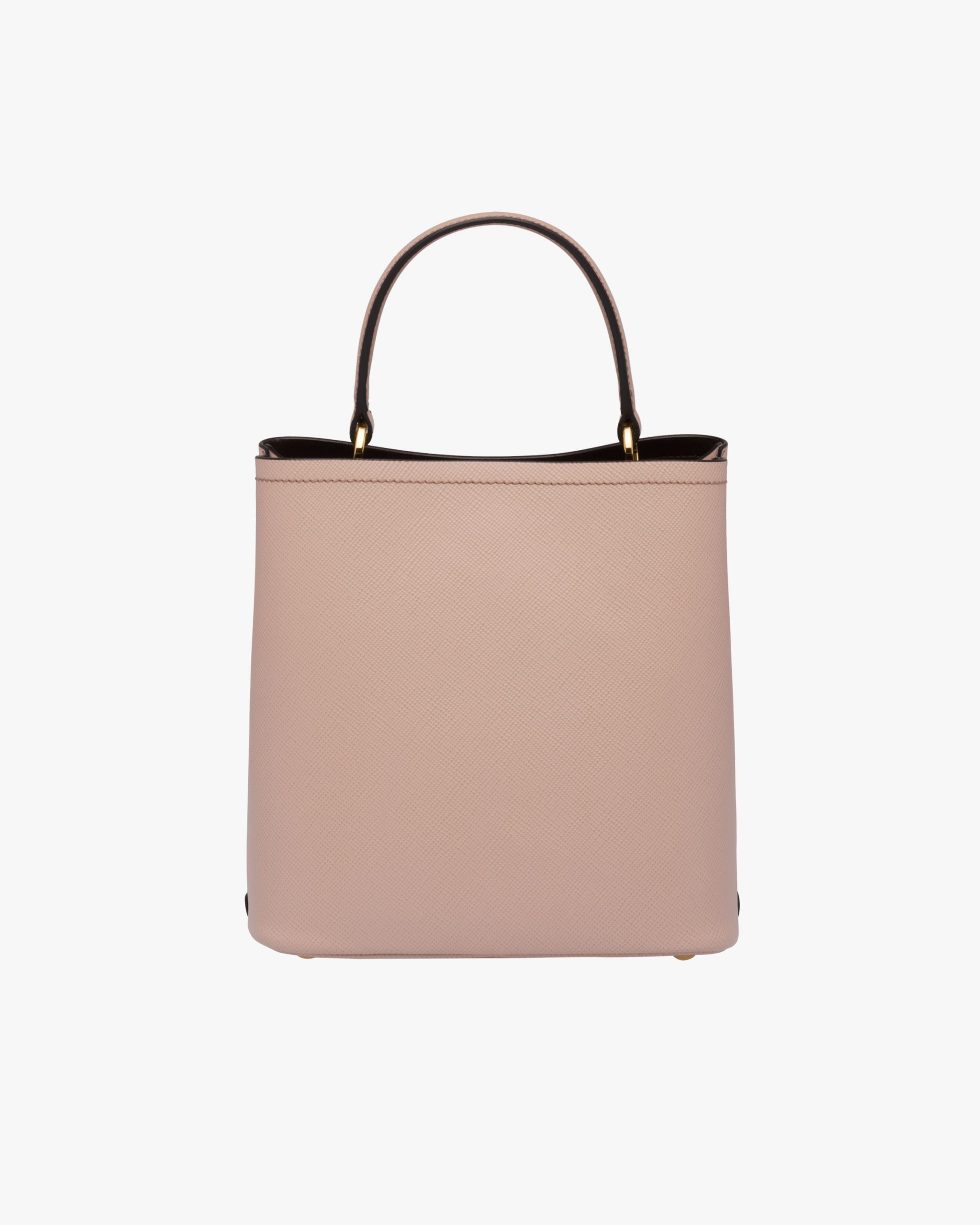 The elegant design of the Prada Panier bag is emphasized by the unmistakable texture of Saffiano leather. The bag has a detachable shoulder strap and an exclusive leather name tag with metal logo2.