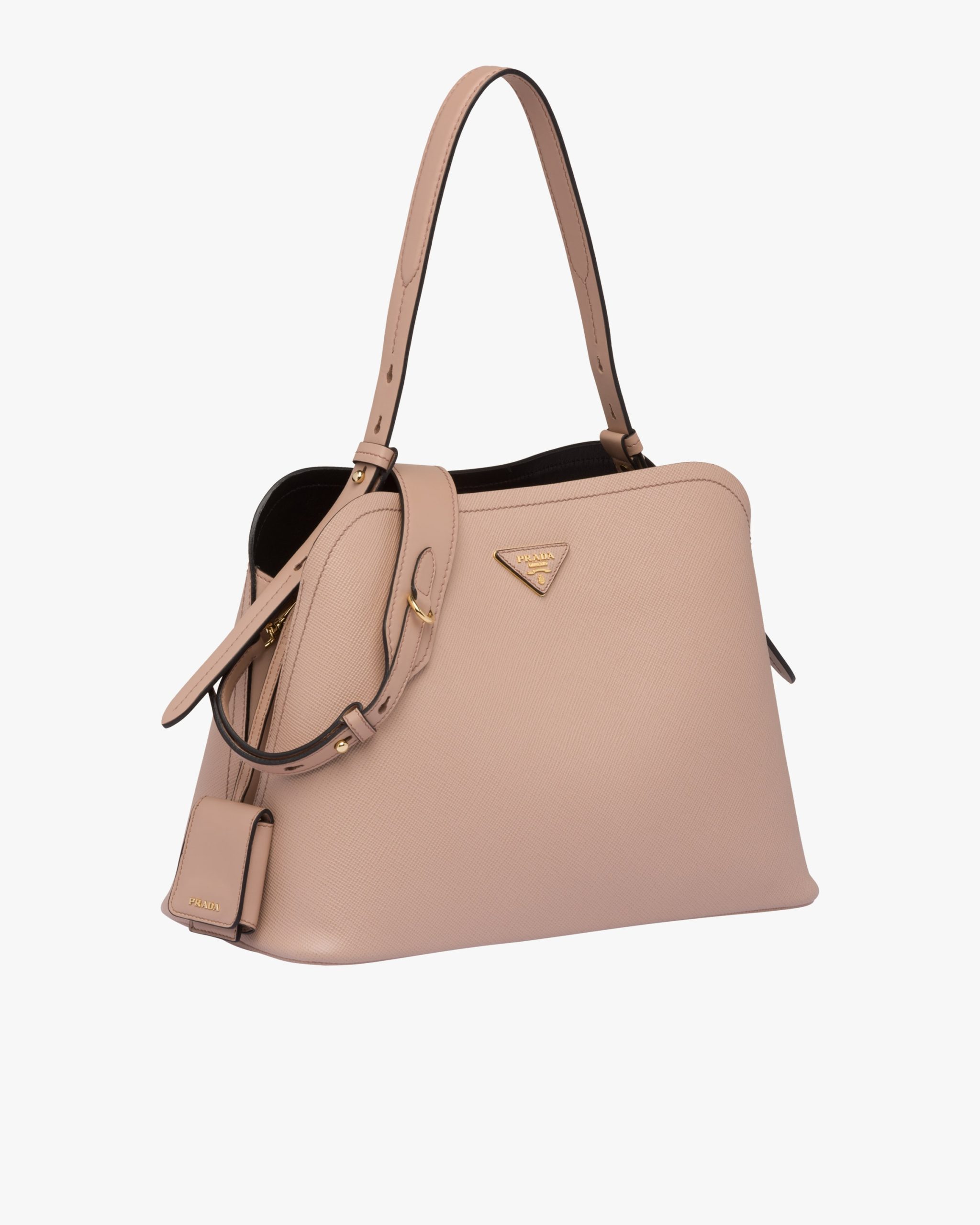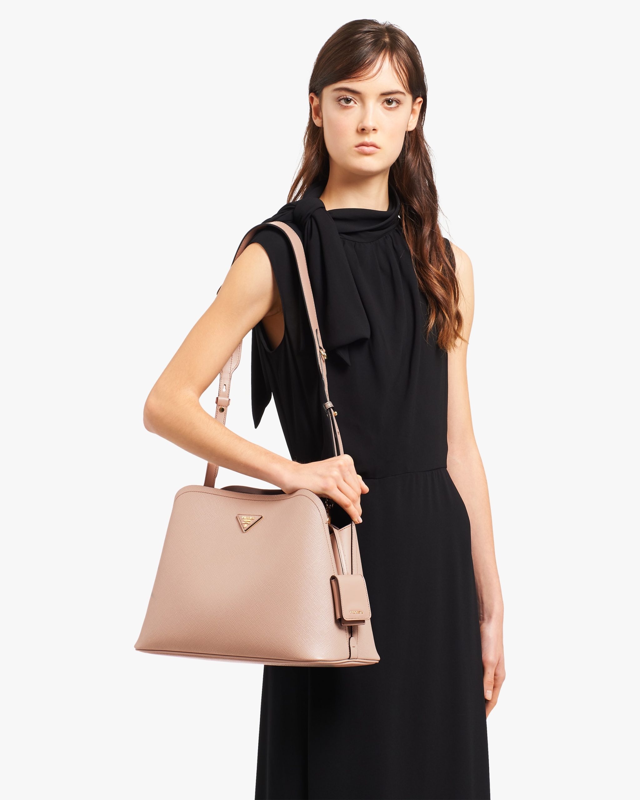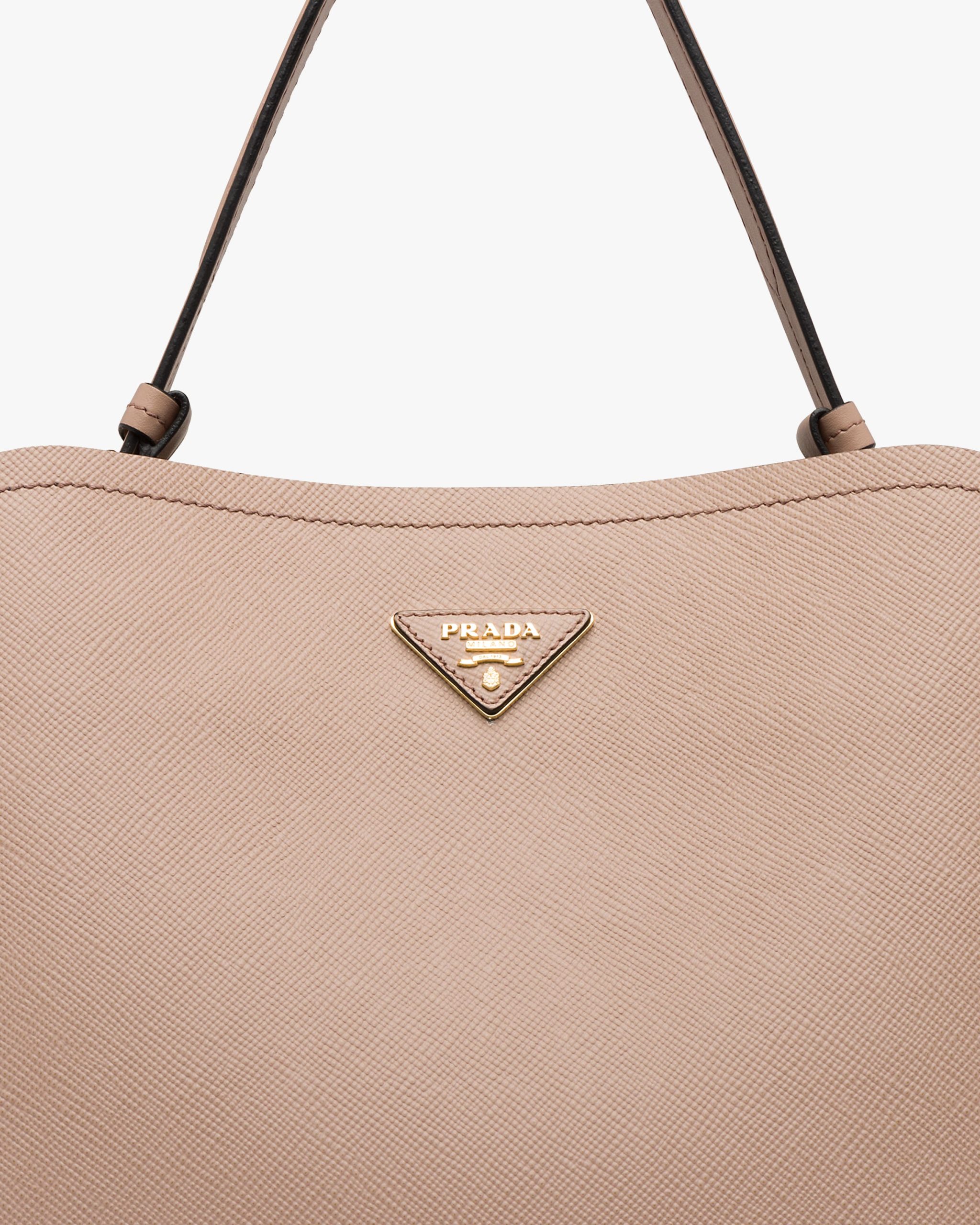 The Prada Matin?e handbag made of Saffiano leather stands out for its metal triangle logo2 and detachable adjustable leather shoulder strap.