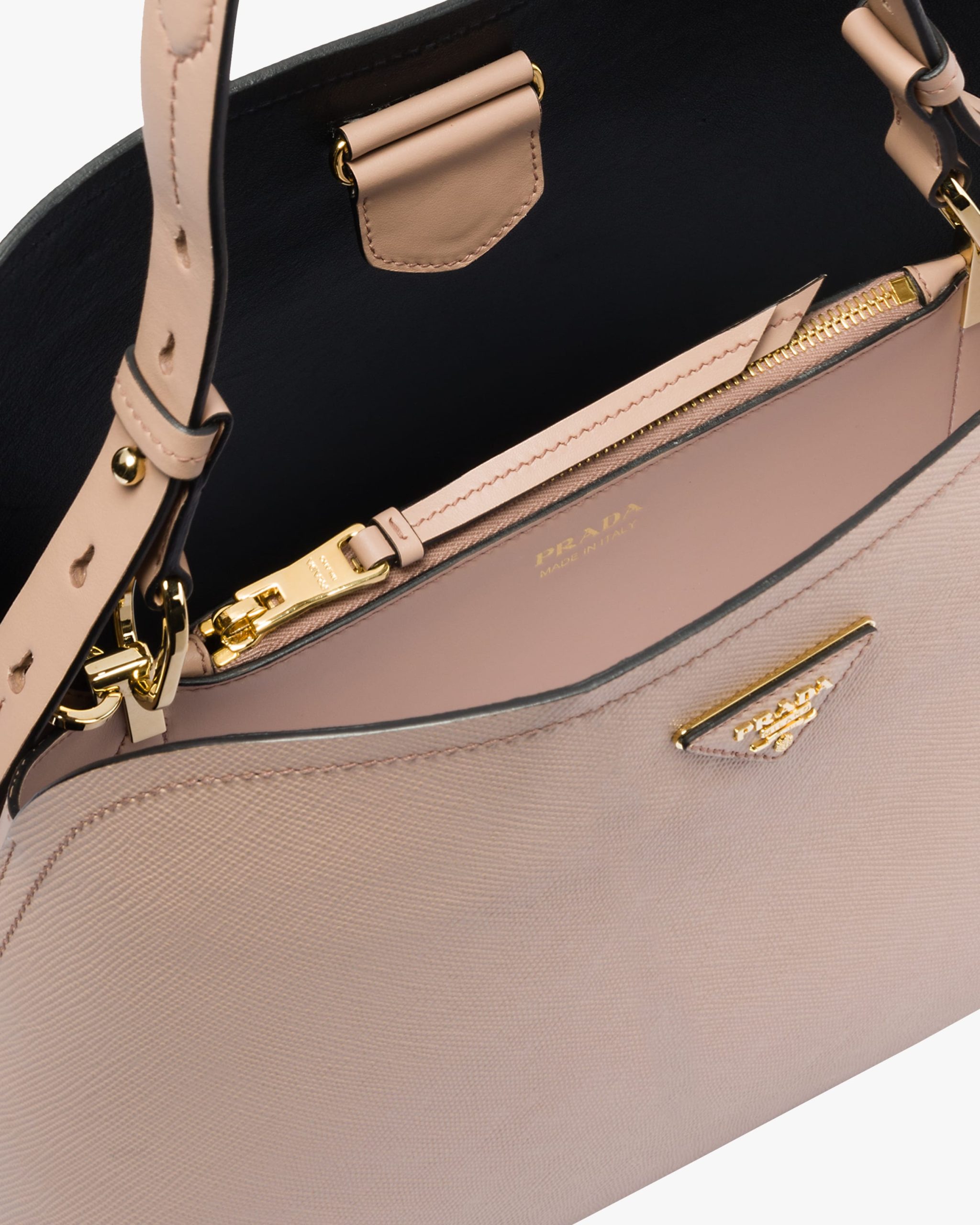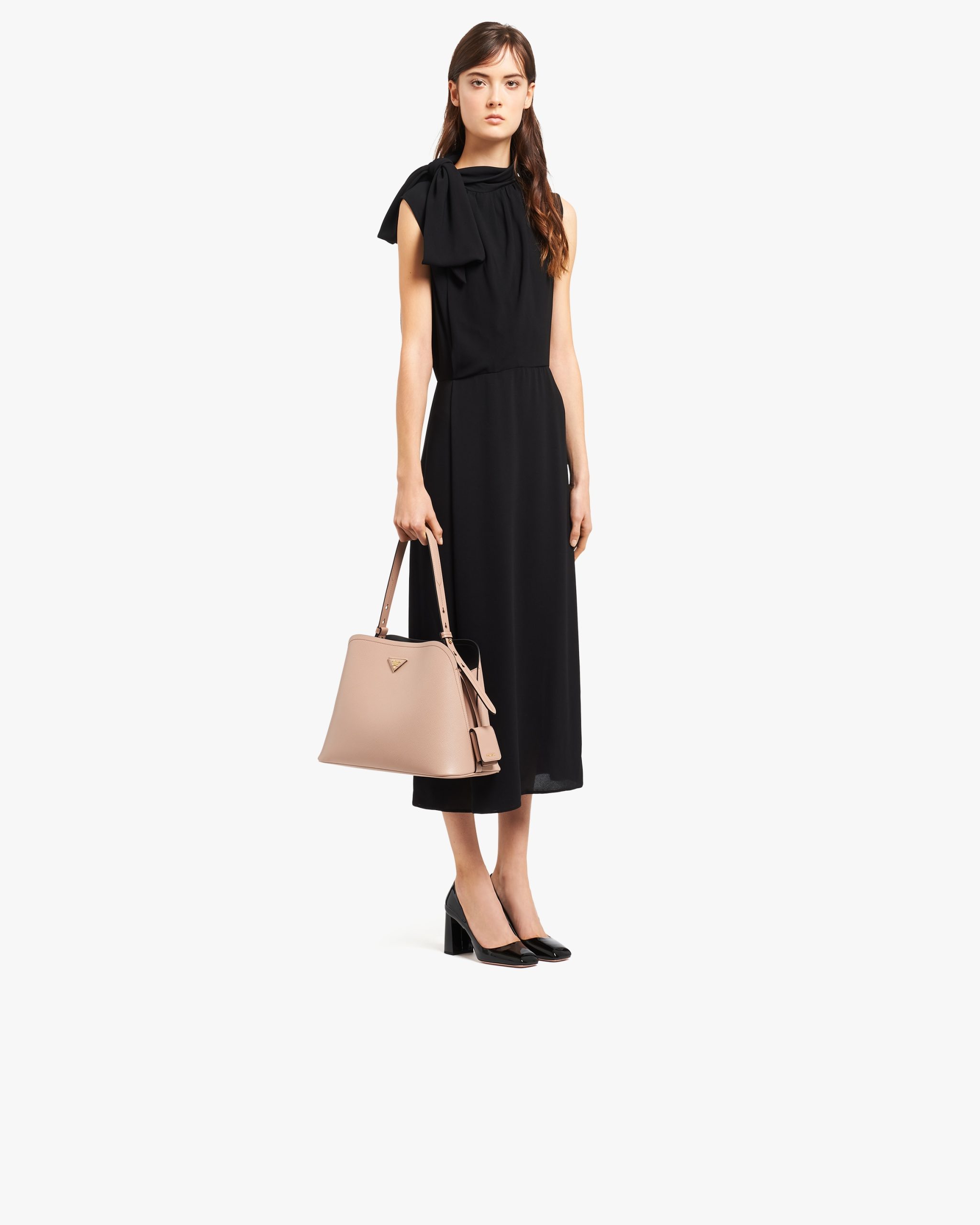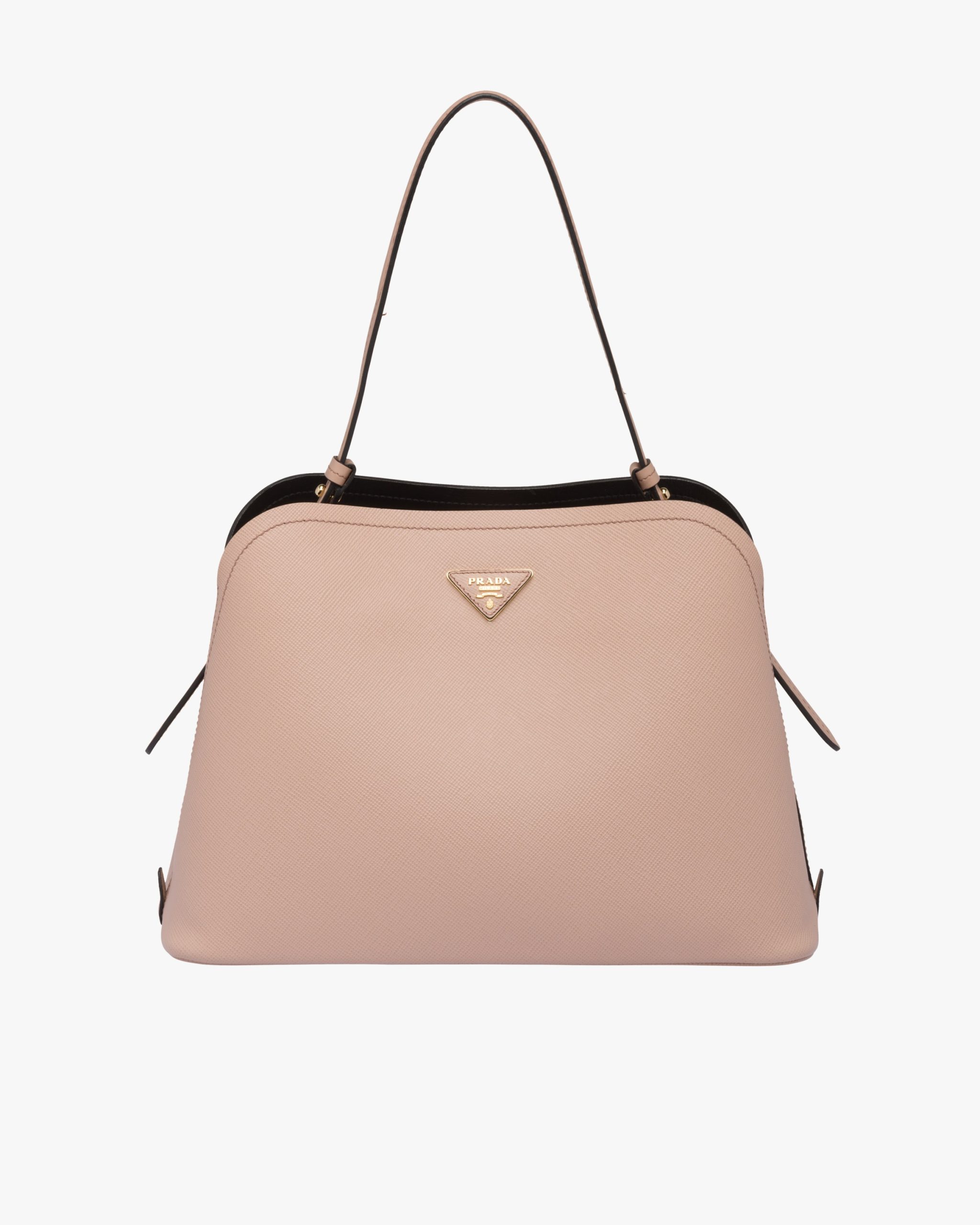 The Prada Matin?e handbag made of Saffiano leather stands out for its metal triangle logo2 and detachable adjustable leather shoulder strap.