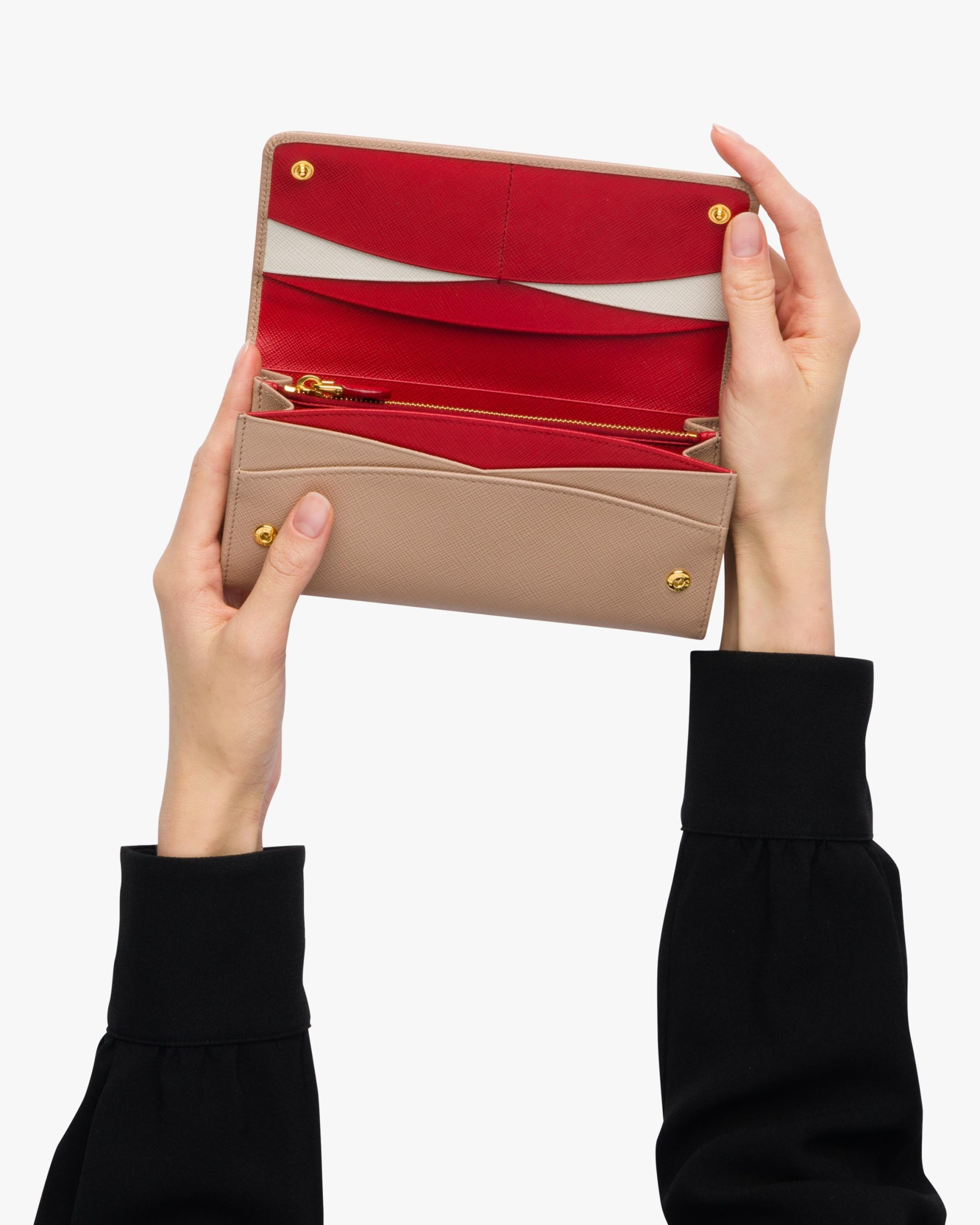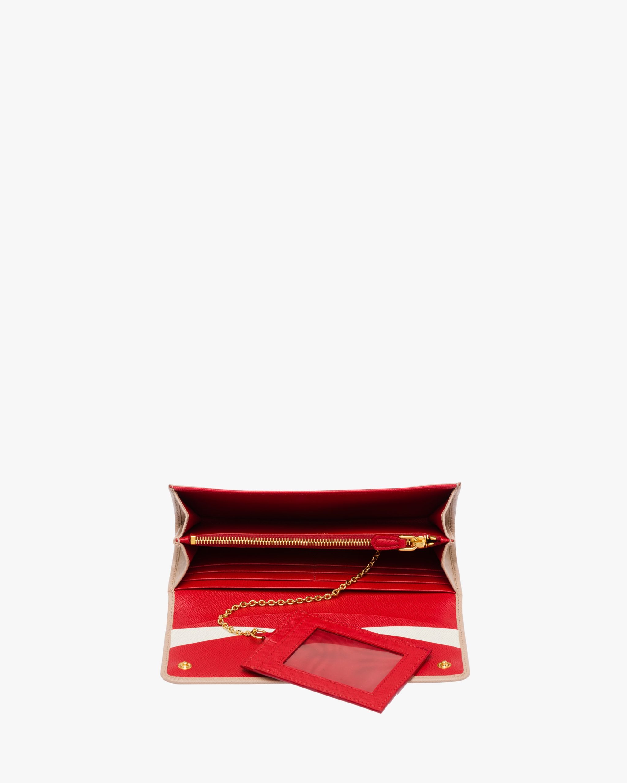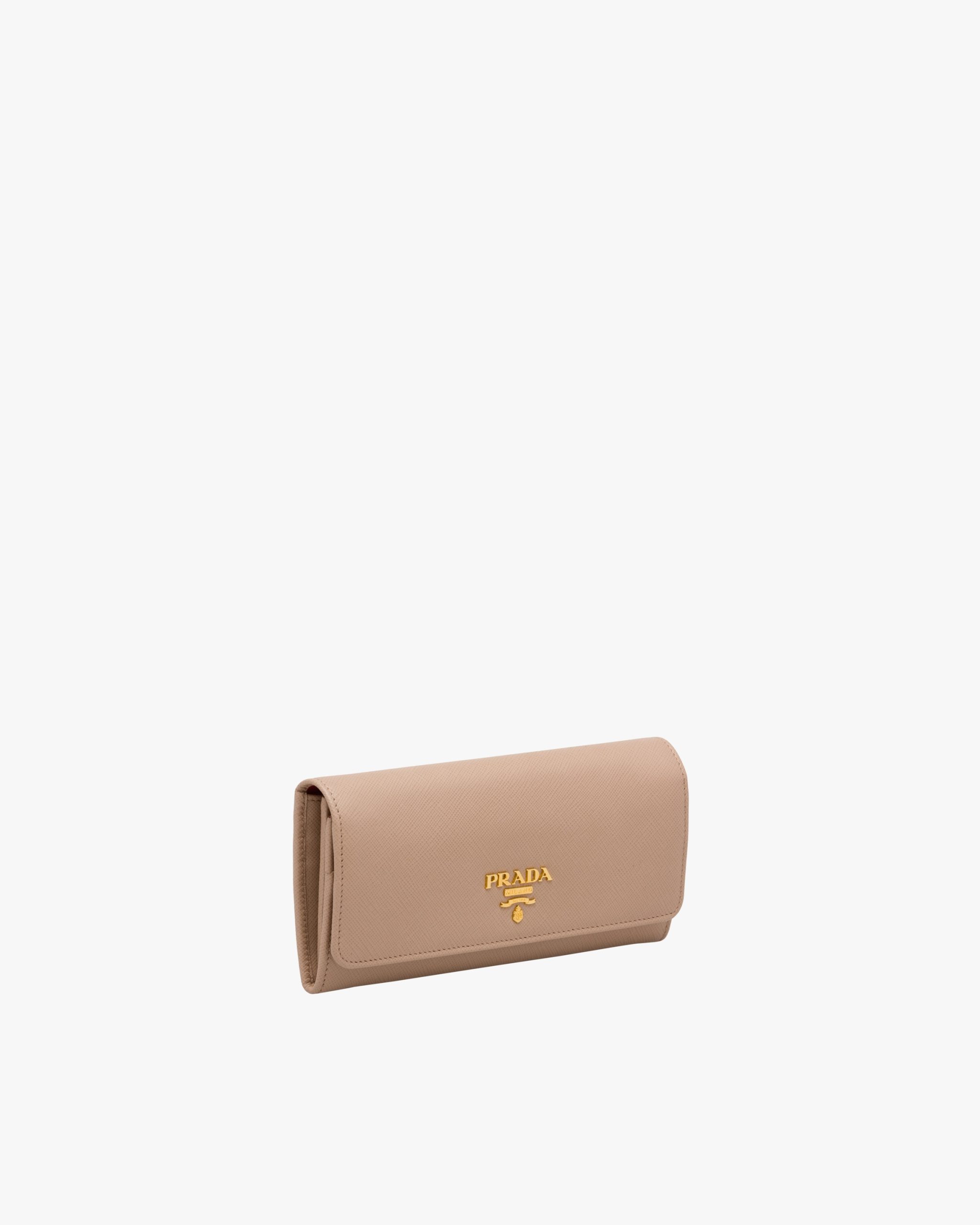 A Saffiano leather flap wallet with gold-finish Prada lettering. The monotone exterior hides multi-colored leather lining inside, as well as various compartments, pockets and an extractable badge holder.